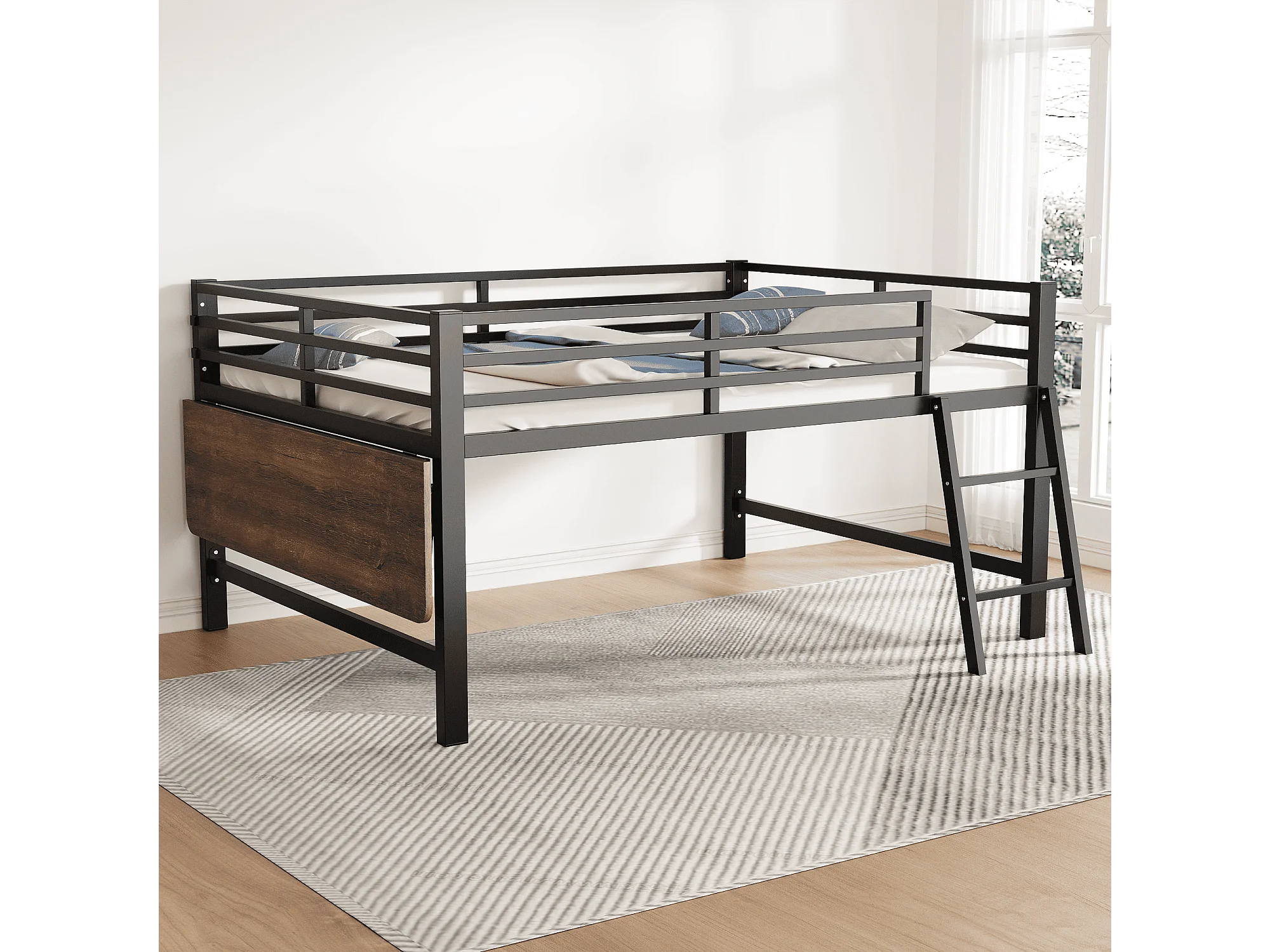 Lit mezzanine 140x200cm en métal avec LED - avec bureau abattant et sommier à lattes - Noir