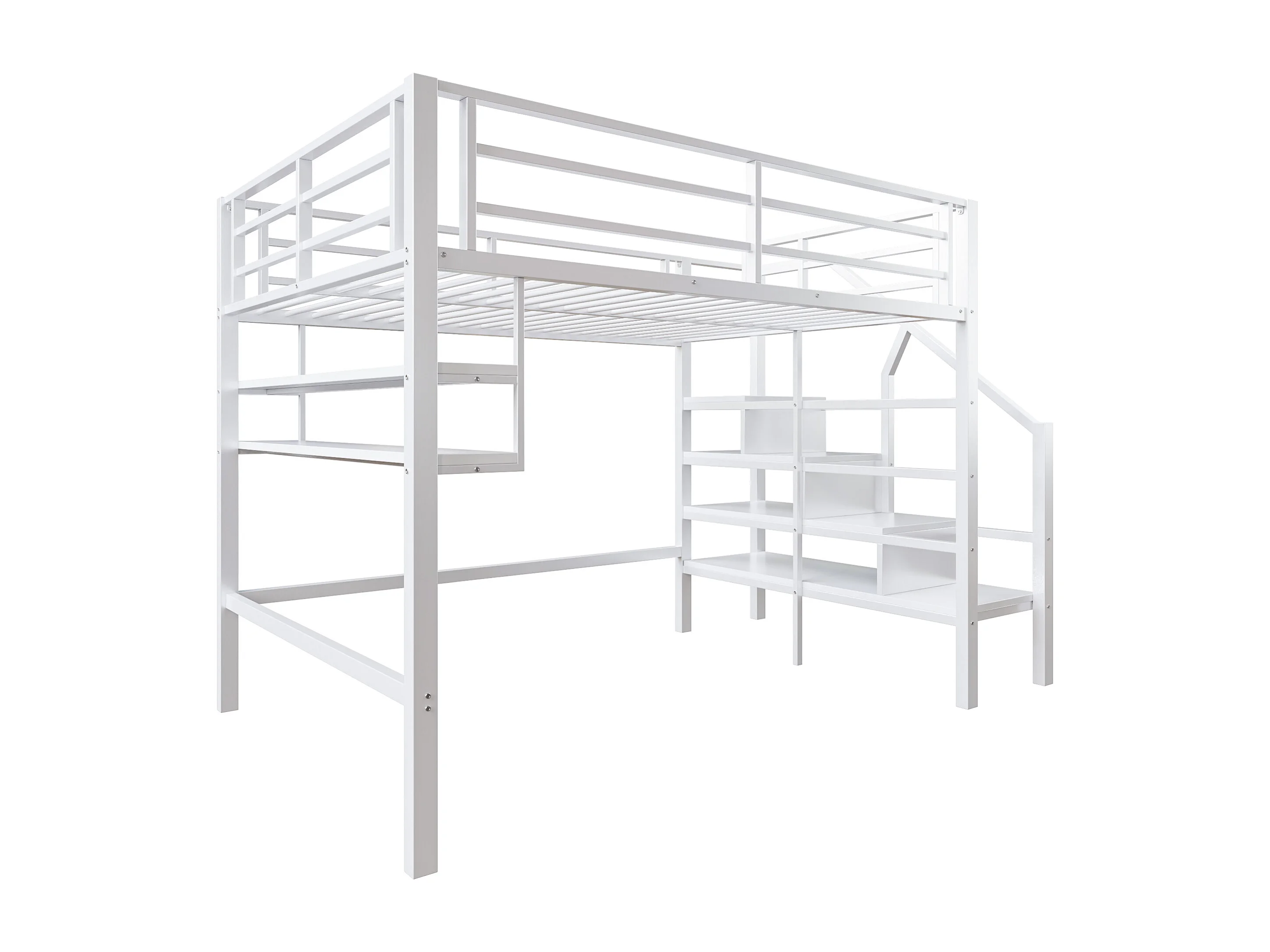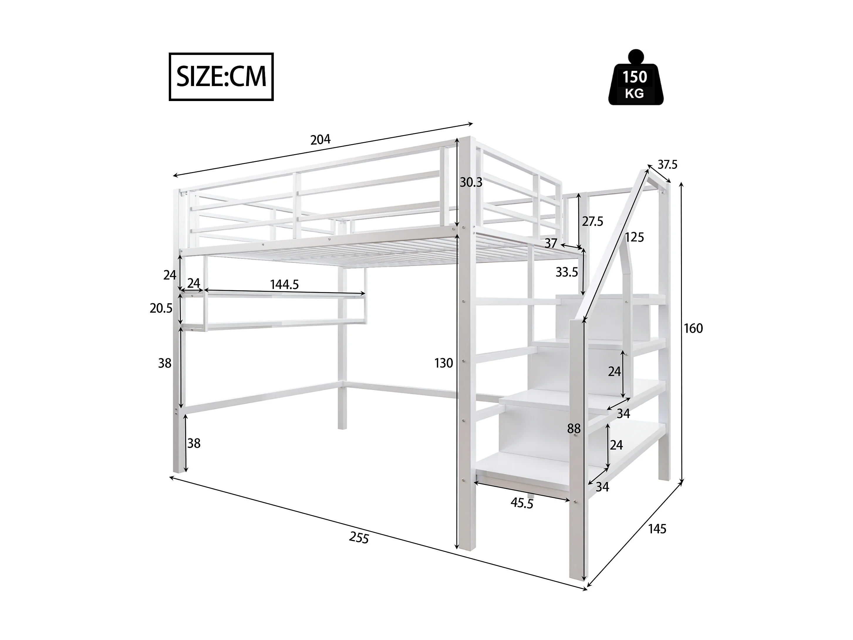 Lit mezzanine 140x200cm, métal et MDF, avec étagères de rangement, échelle de stockage et espace libre pour jeux, sans matelas, blanc (255x145x160 cm)
