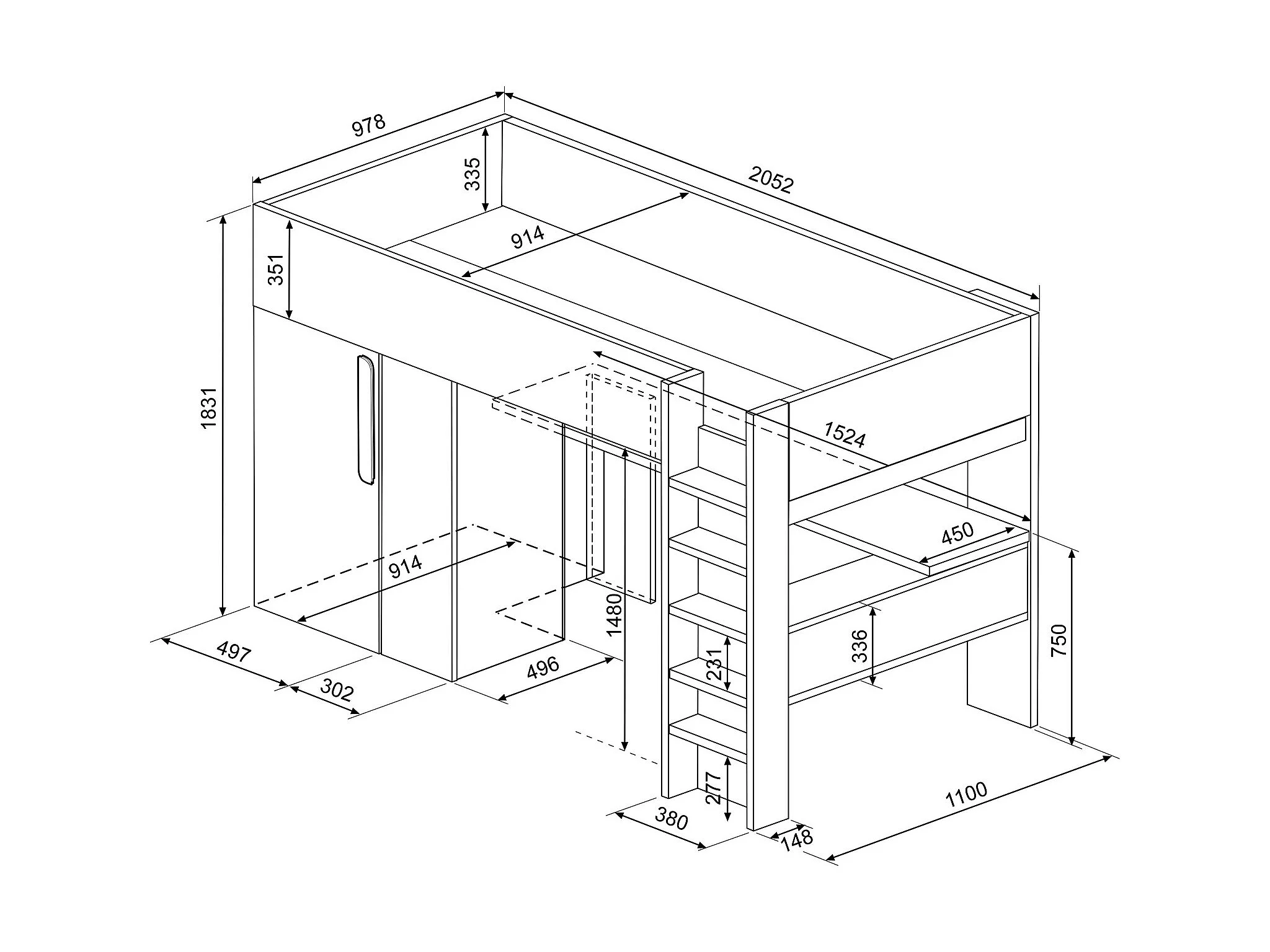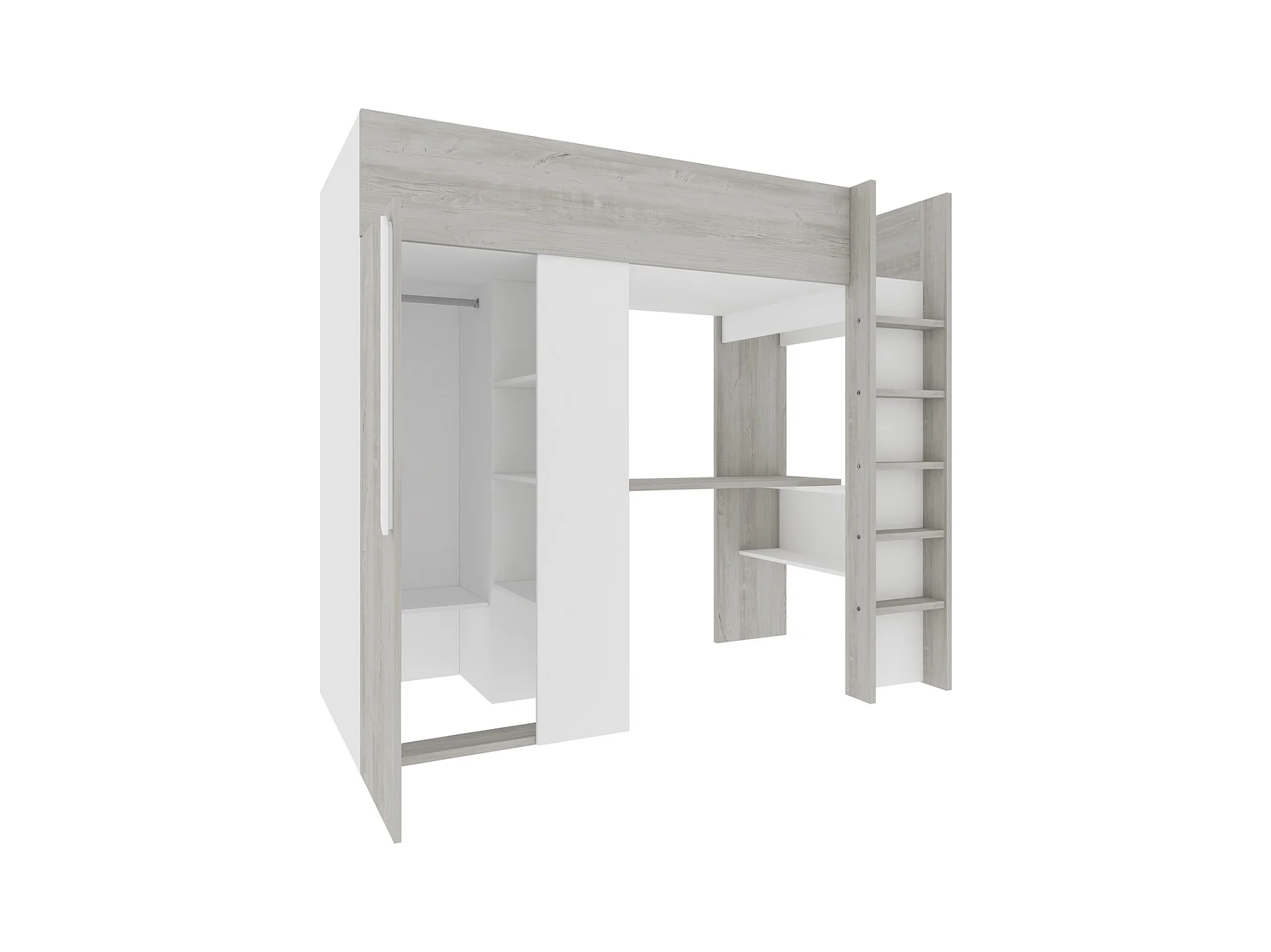 Lit mezzanine 90 x 200 cm avec armoire et bureau - Naturel grisé et blanc - NICOLAS