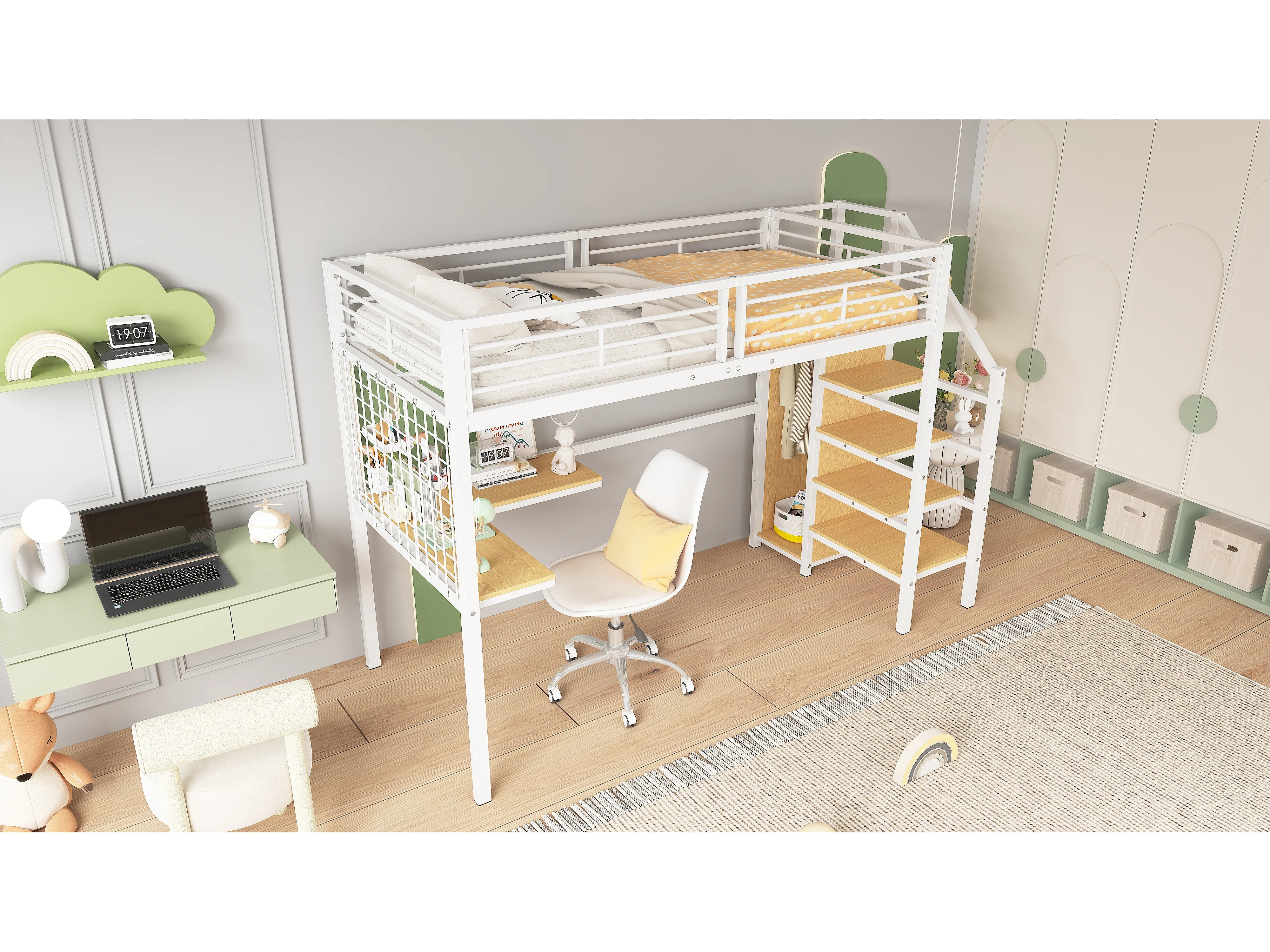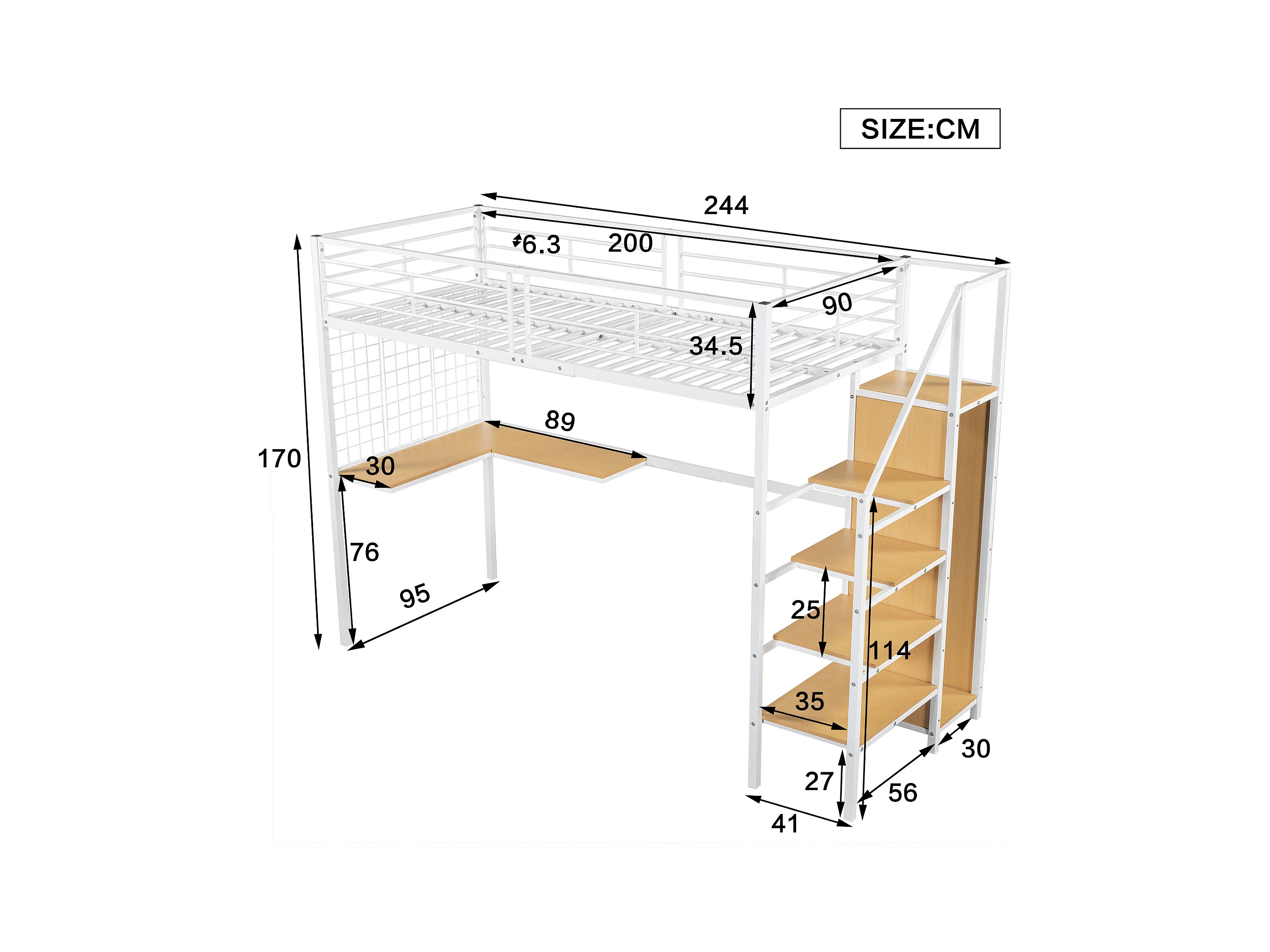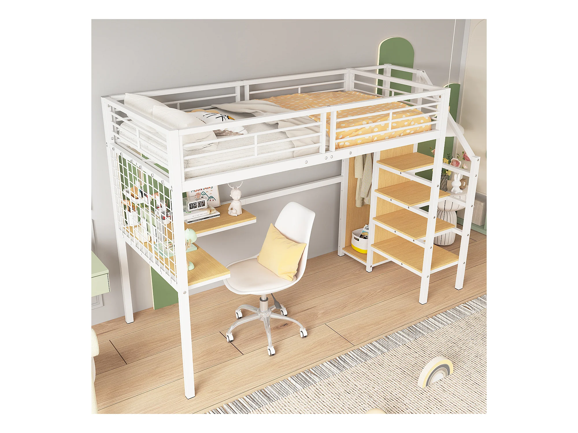 Lit mezzanine 90 x 200 cm avec bureau d'angle et armoire - fer + panneaux de particules - blanc + naturel