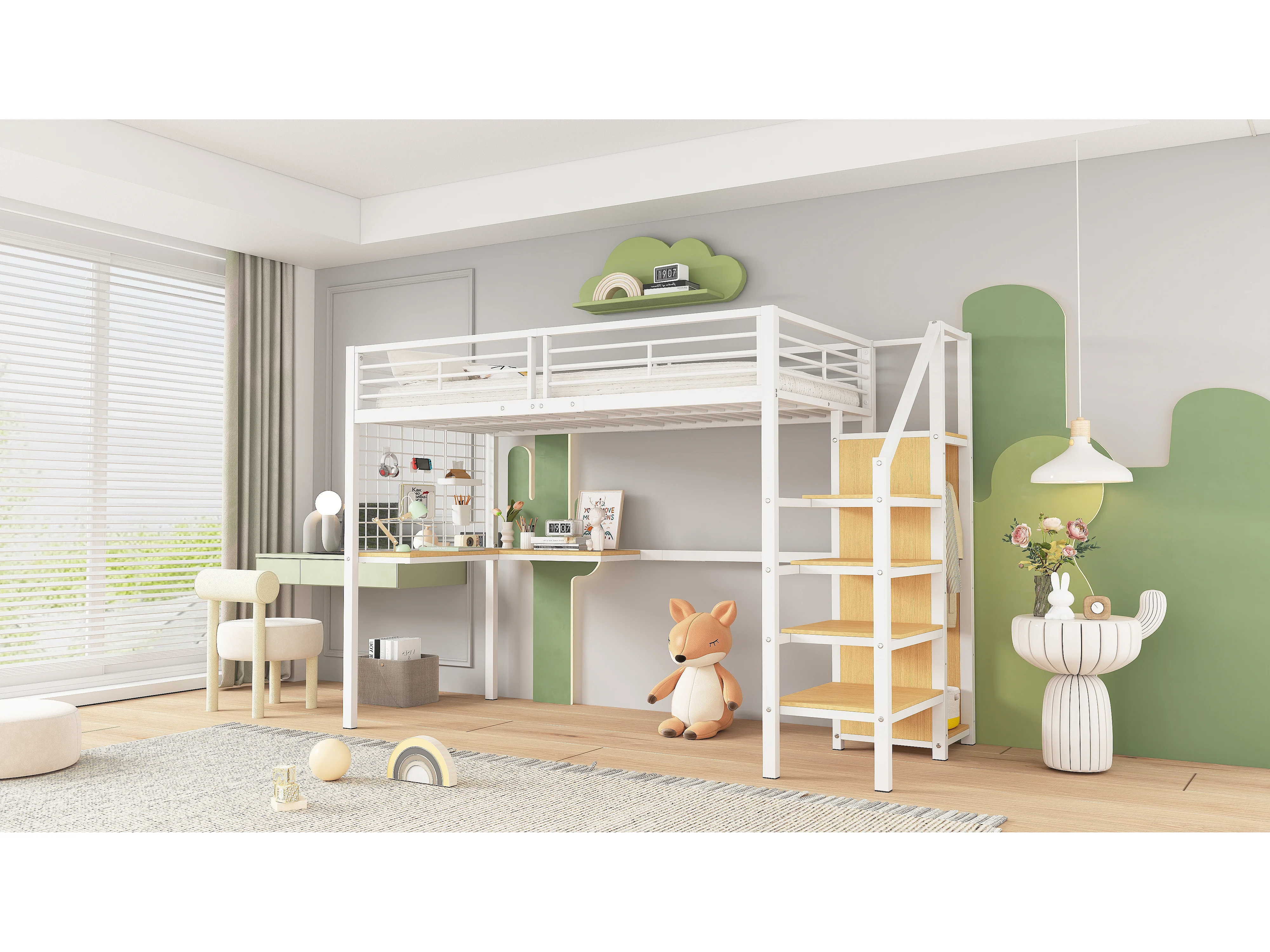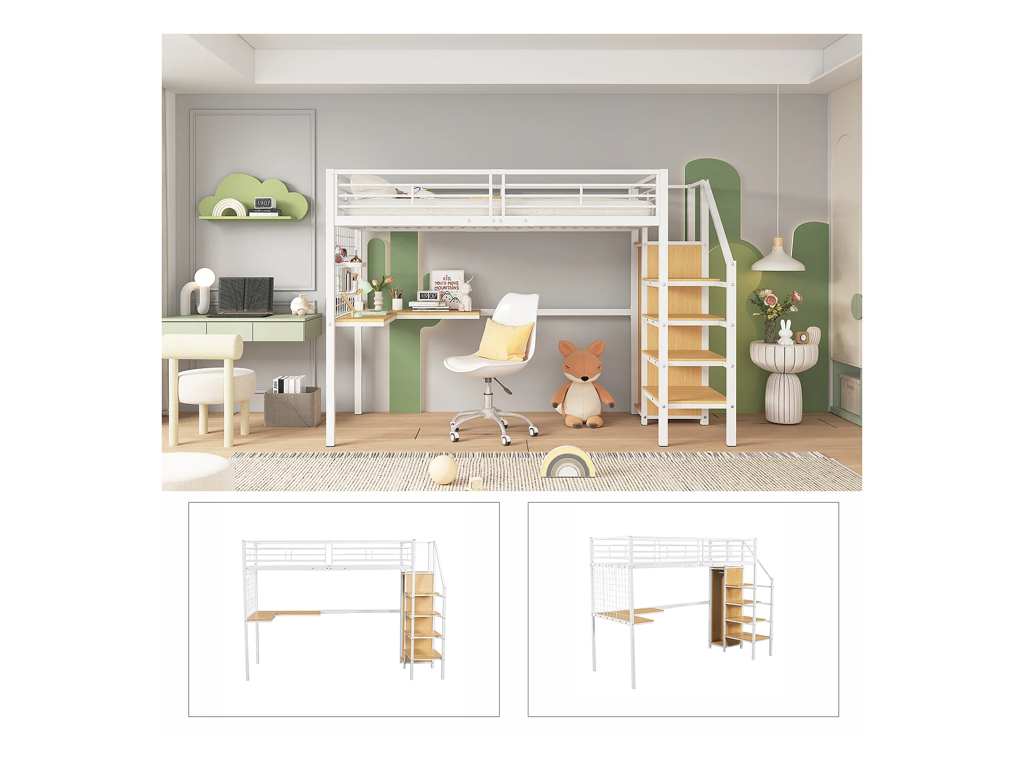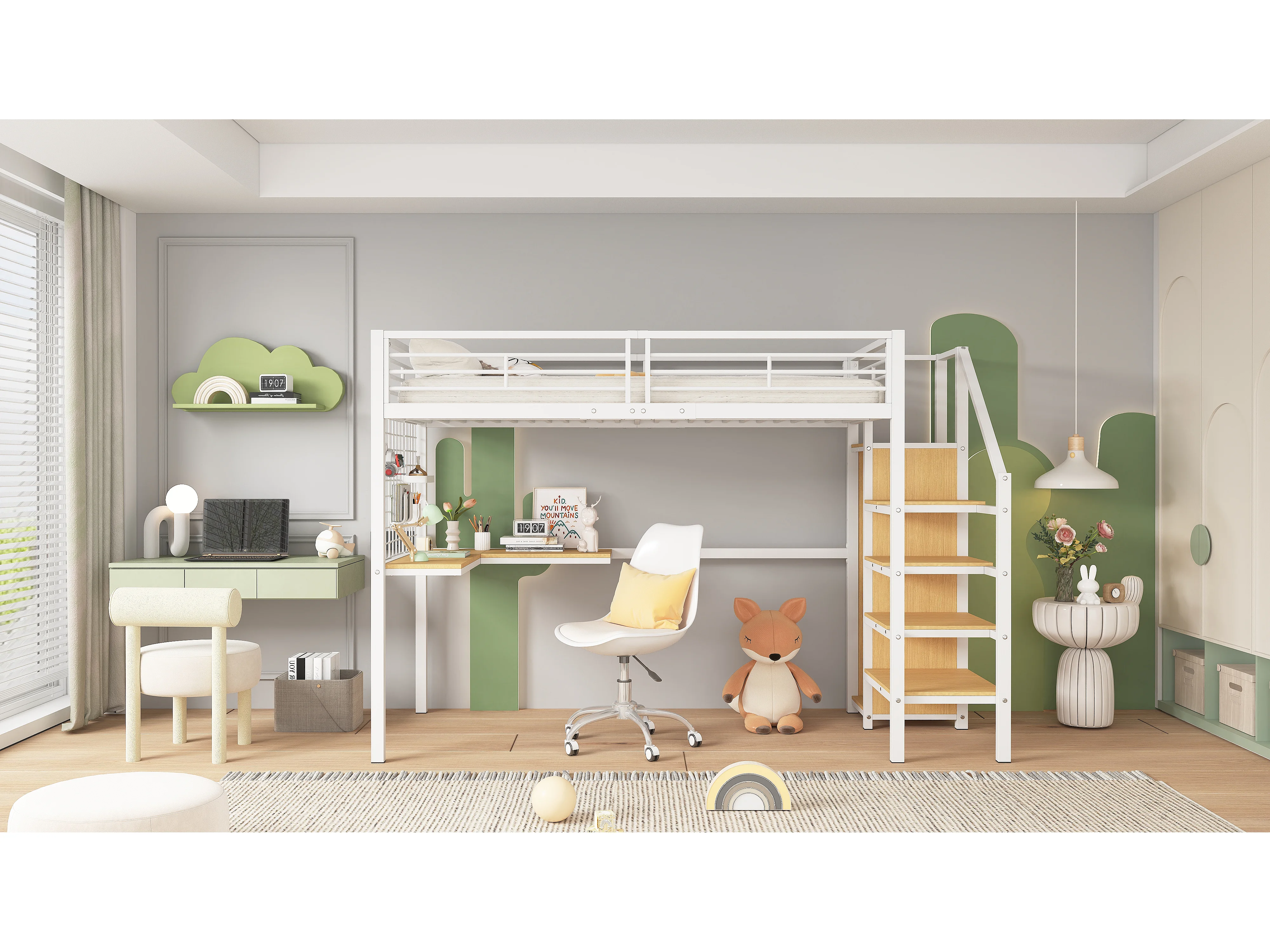 Lit mezzanine 90 x 200 cm avec bureau d'angle et armoire - fer + panneaux de particules - blanc + naturel