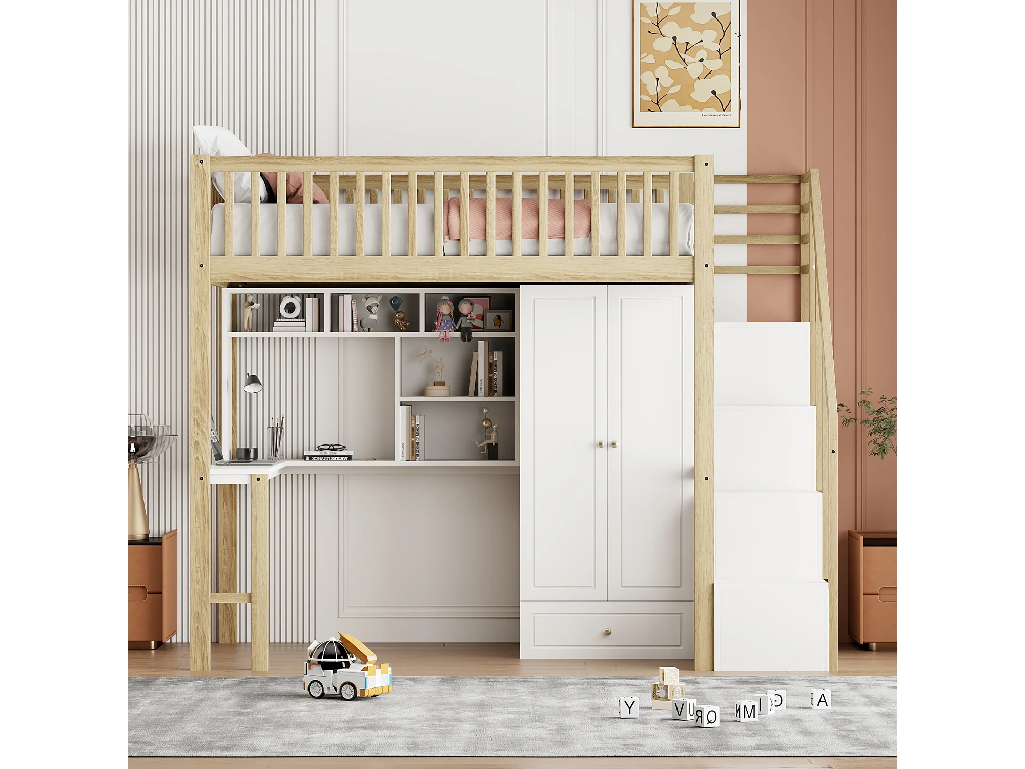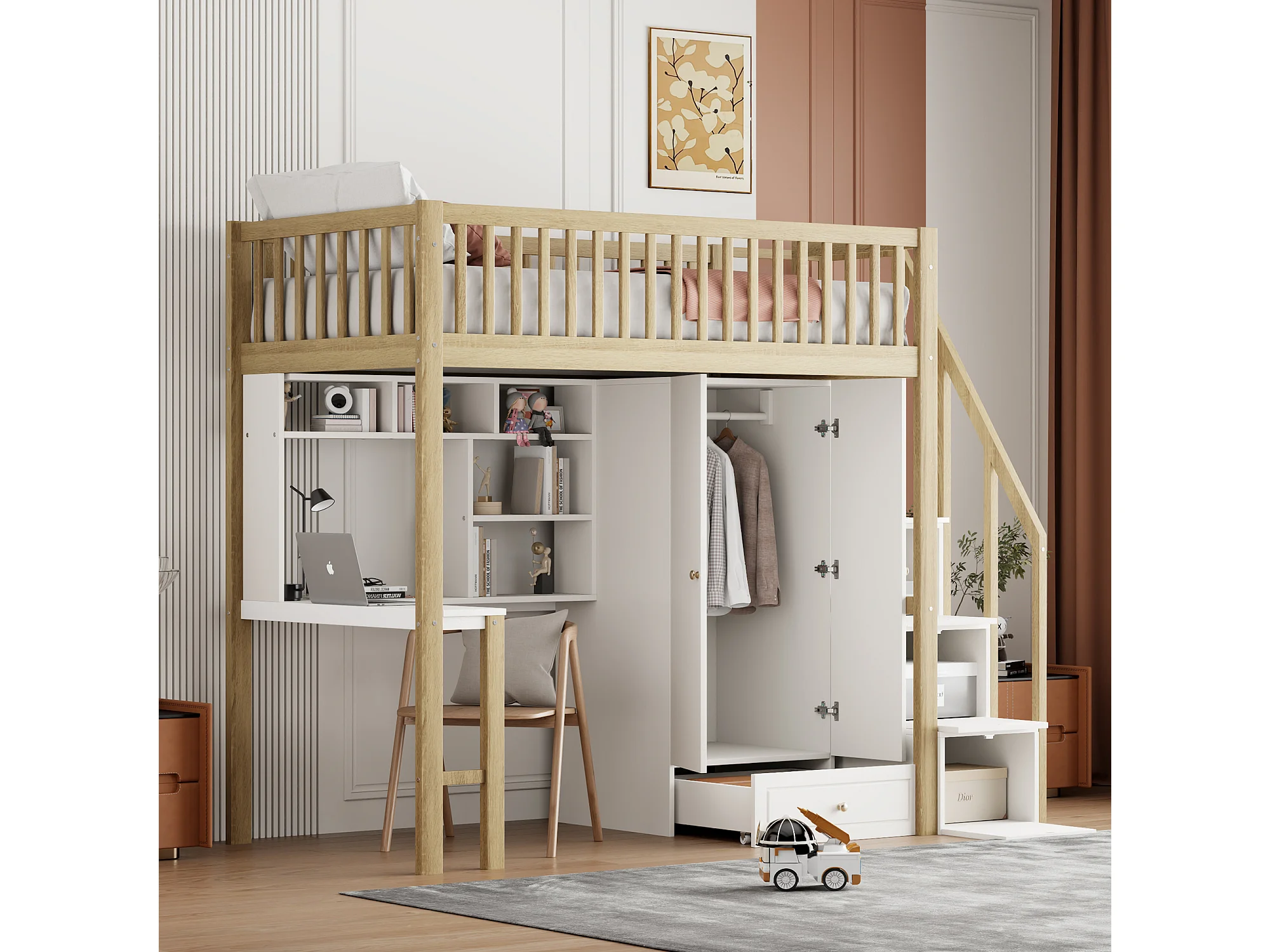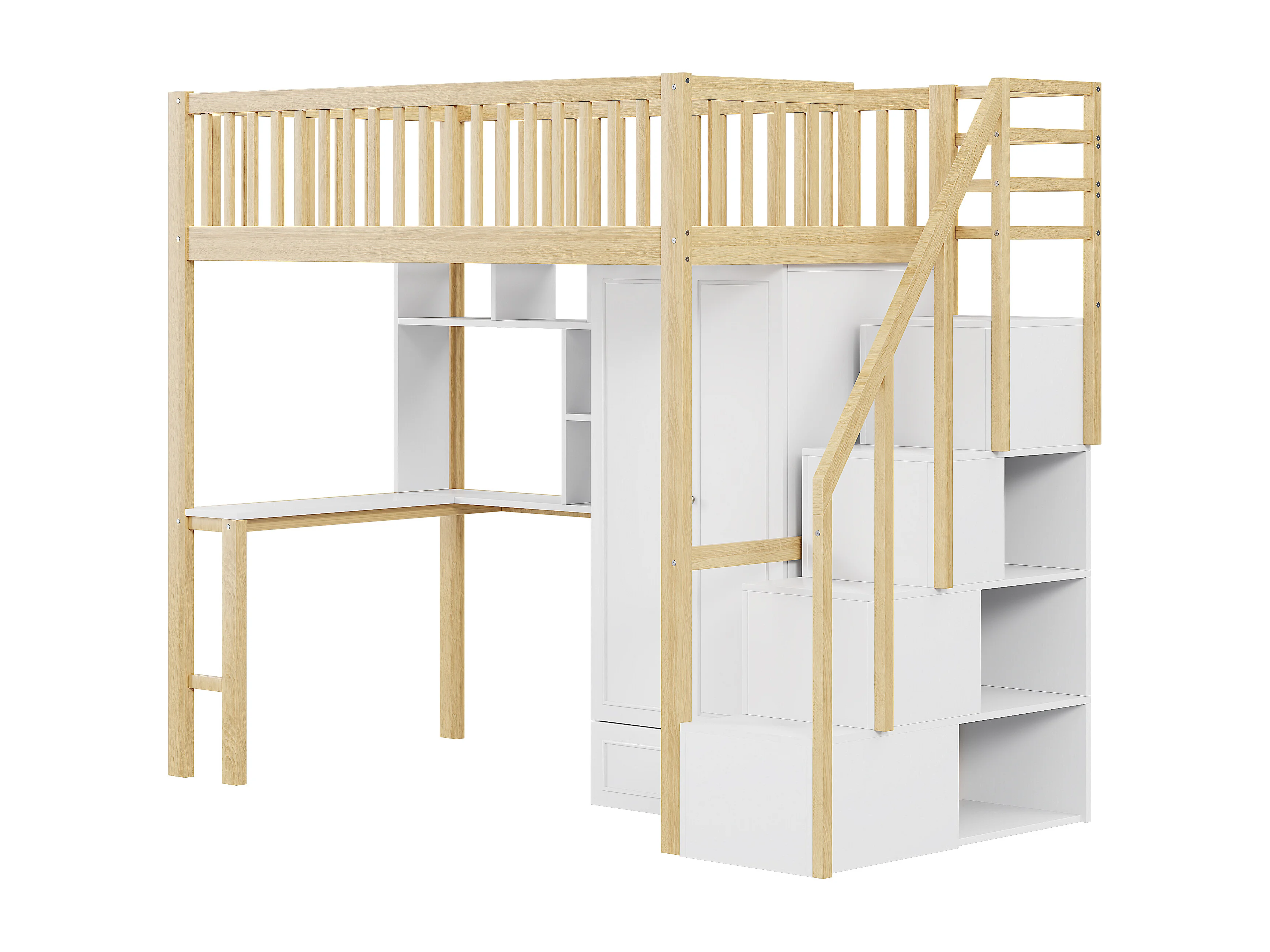 Lit mezzanine 90 x 200 cm avec grande armoire, bureau, bibliothèque, escalier et tiroirs, tout-en-un, Bois MDF, Blanc + chêne
