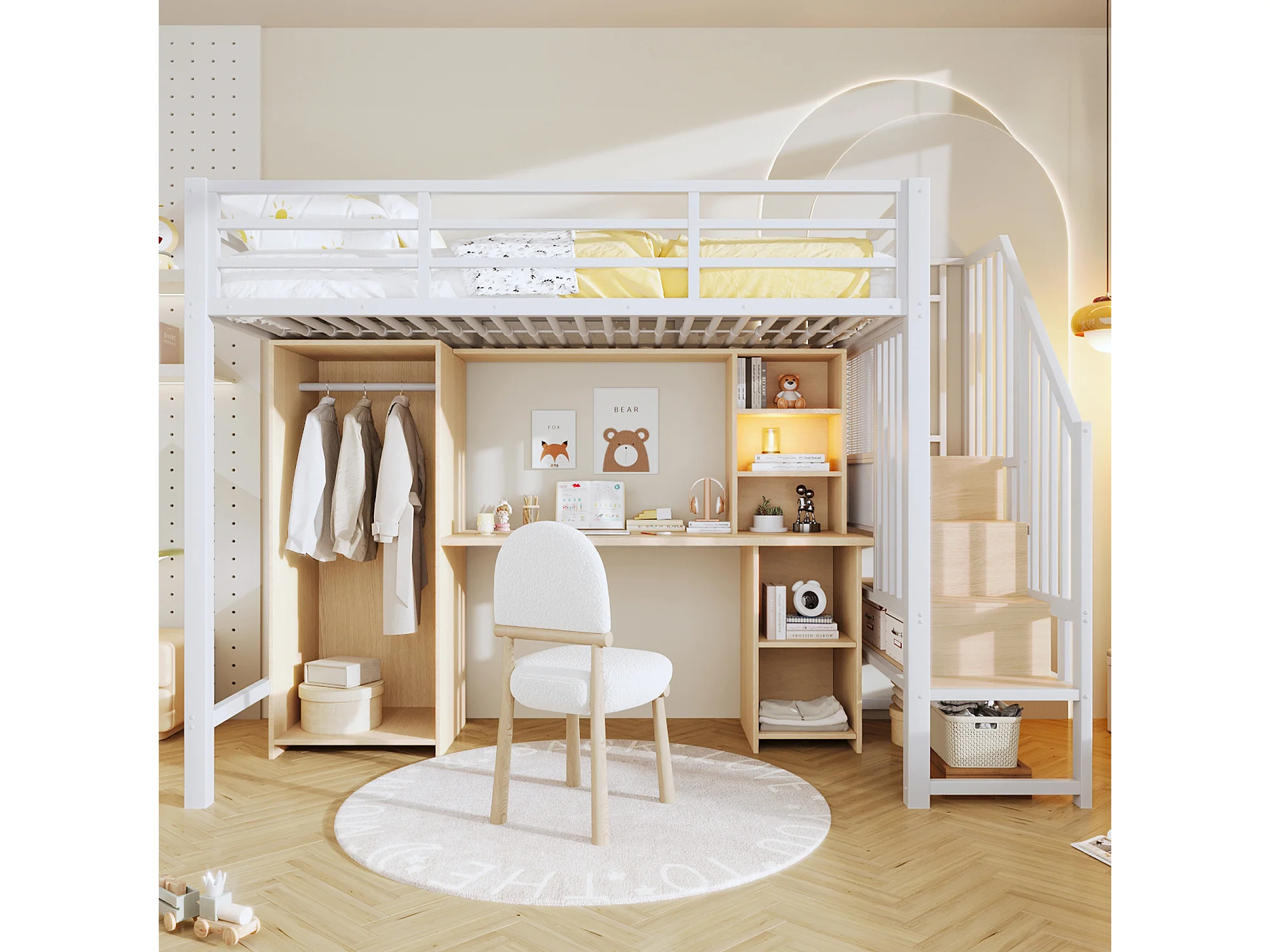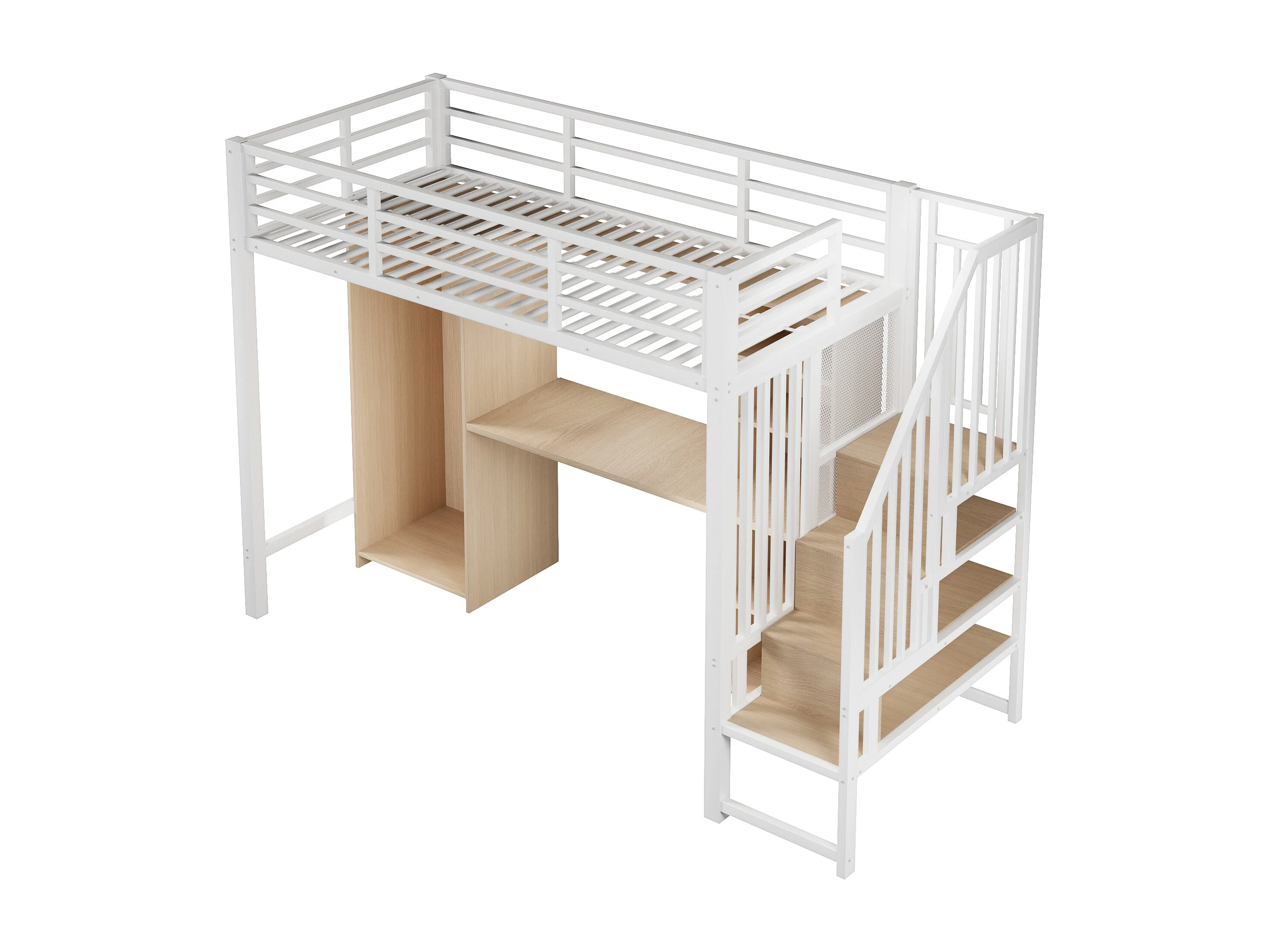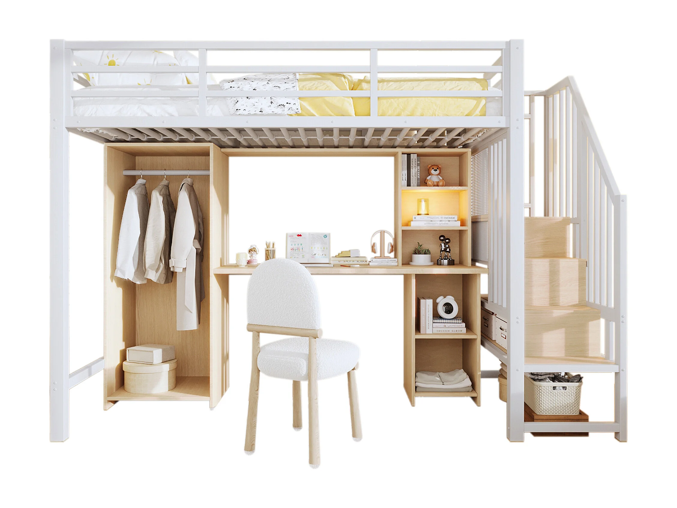 Lit mezzanine 90 x 200 cm avec rangements, armoire et bureau - Structure en fer - Blanc et bois clair