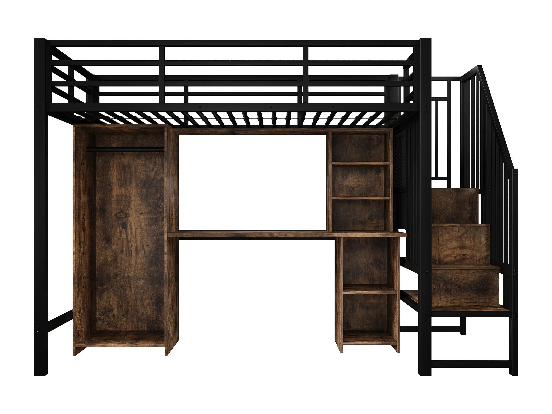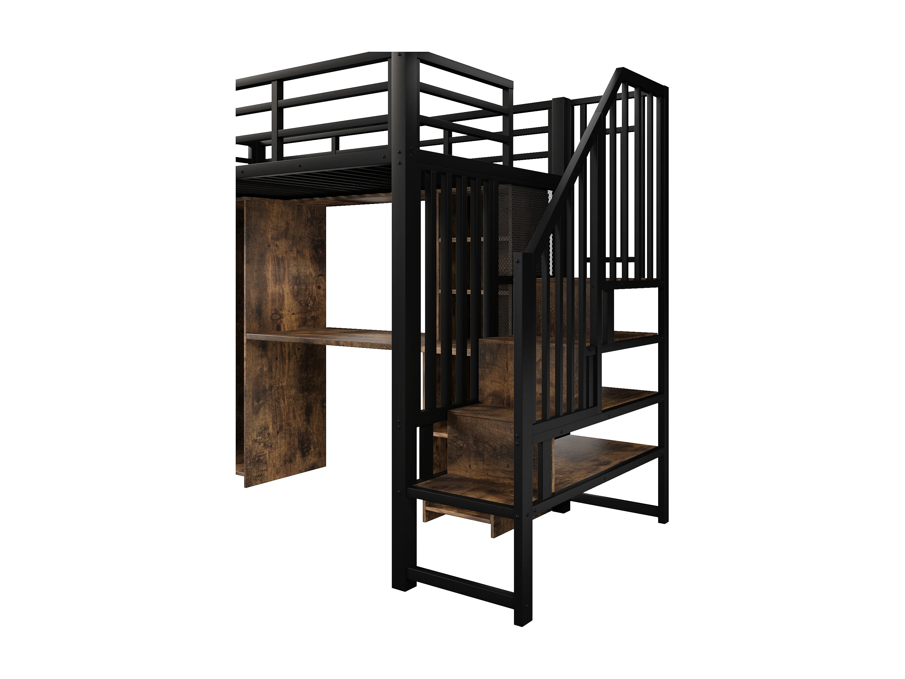 Lit mezzanine 90 x 200 cm avec rangements, armoire et bureau - Structure en fer - Noir et bois foncé