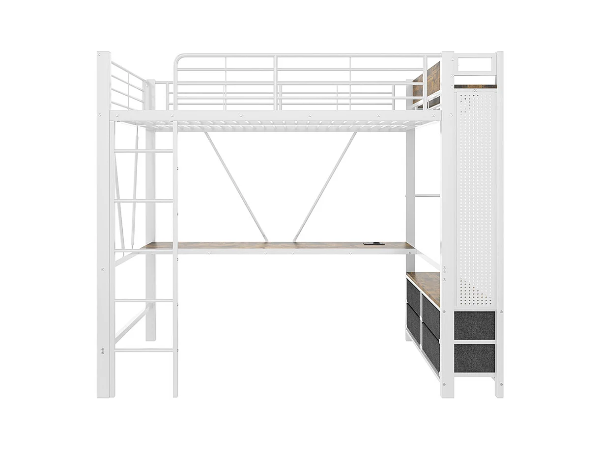 Lit mezzanine 90 x 200 cm, en fer, avec bureau, tringle à linge, étagères, tiroirs, prises USB + Type-C, bande LED,blanc