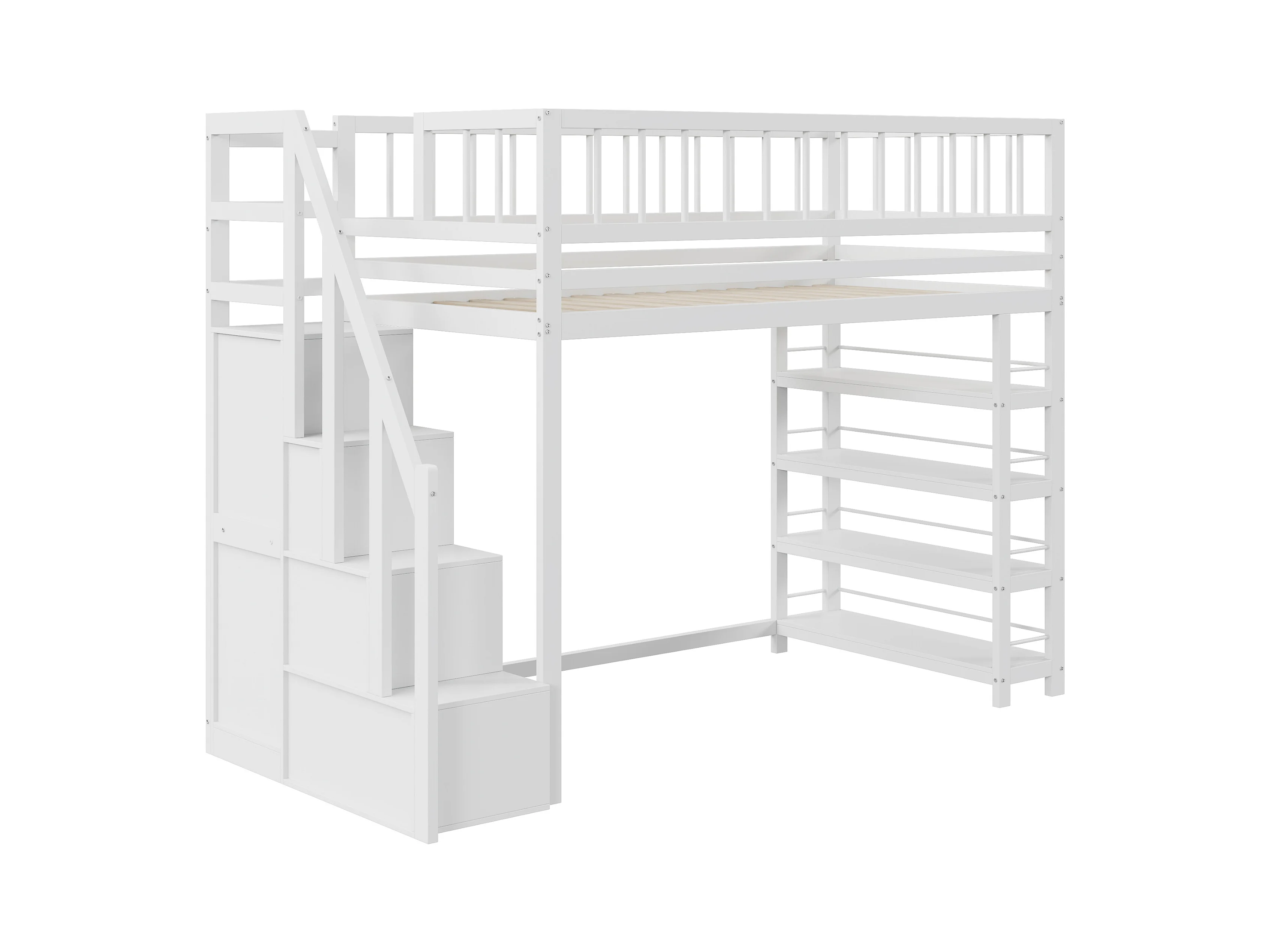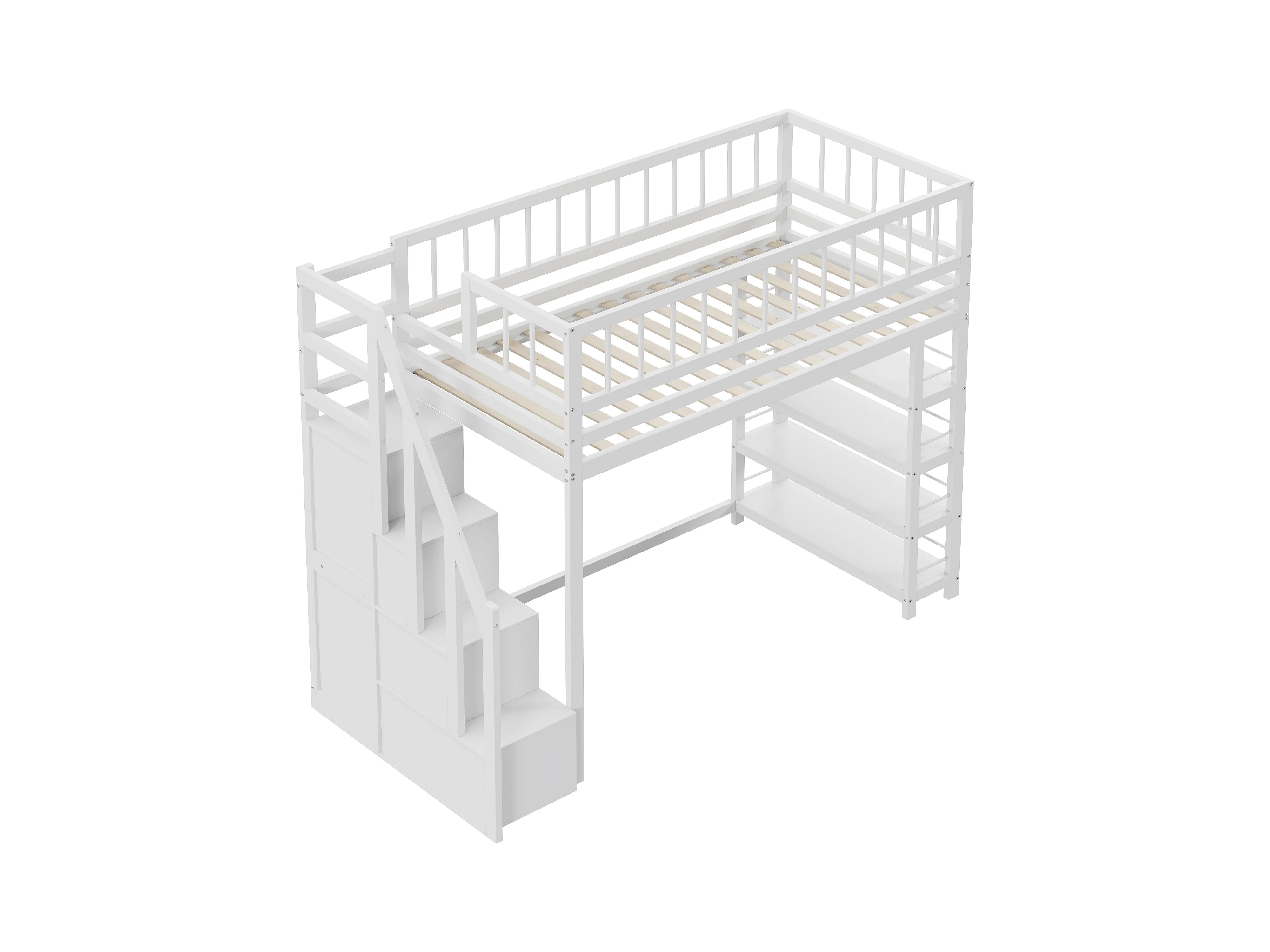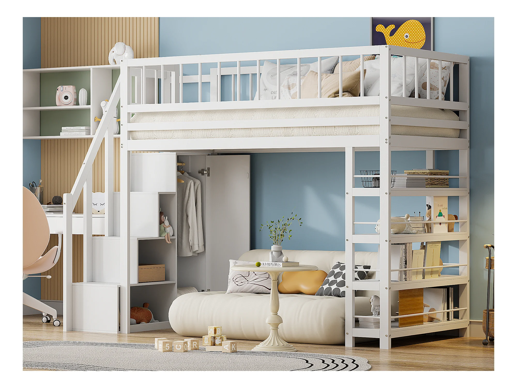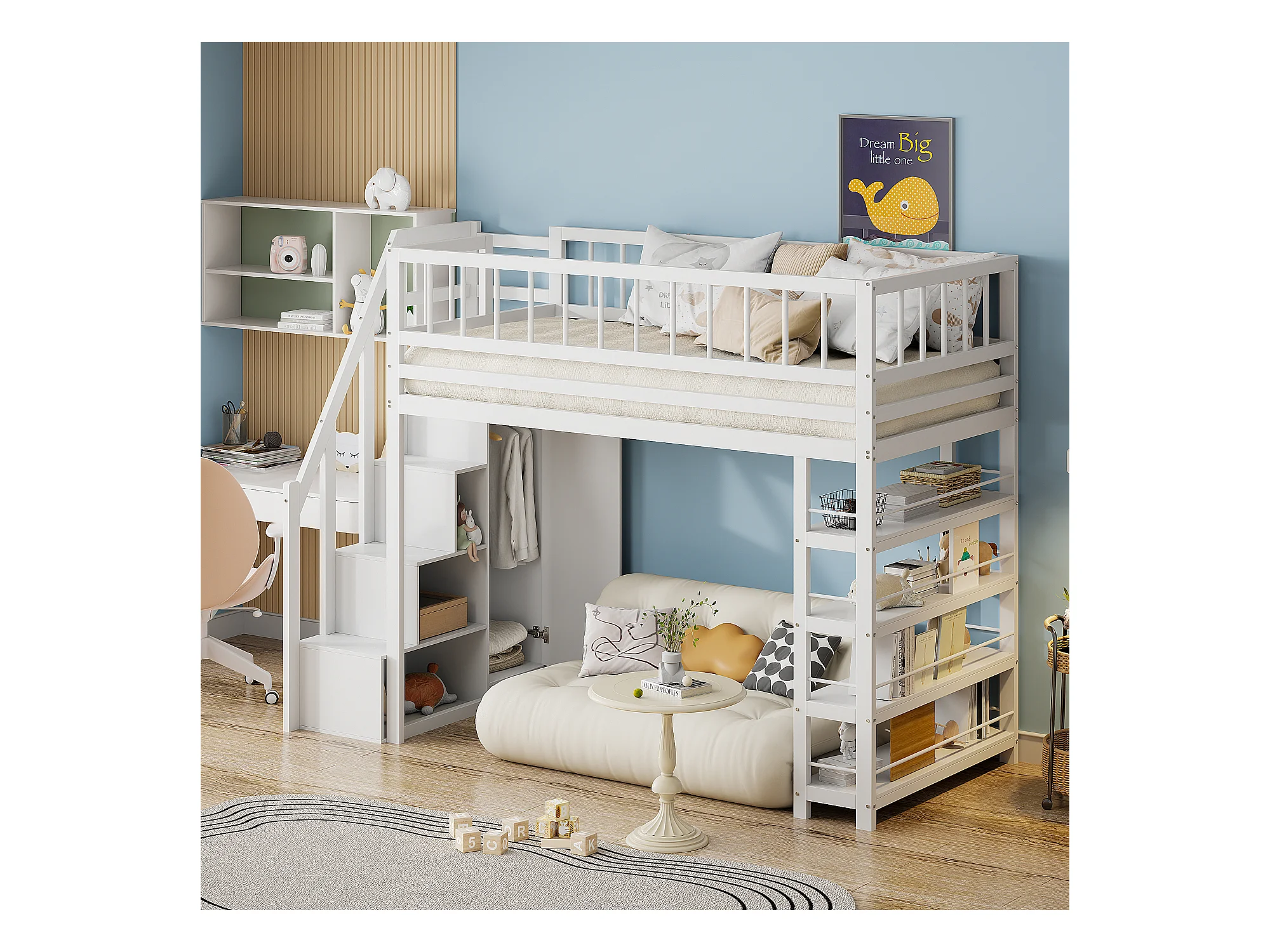 Lit mezzanine 90 x 200 cm - étagères + armoire + espace de rangement - bois massif - blanc
