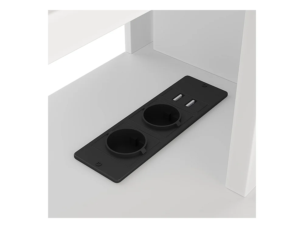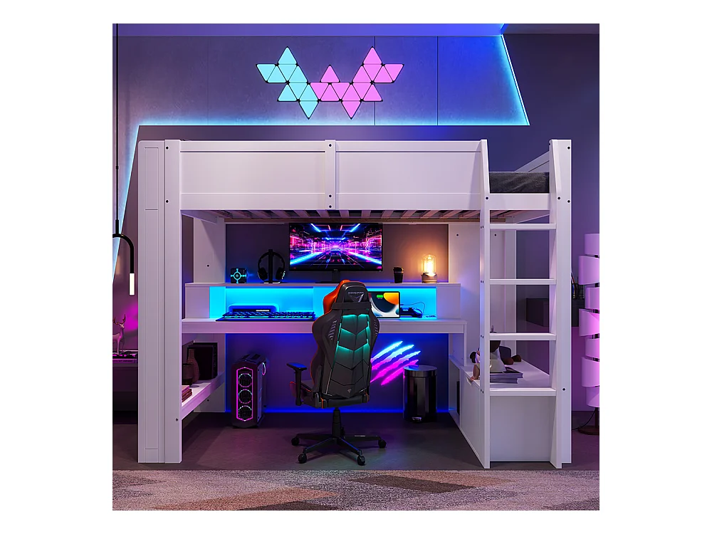 Lit mezzanine 90 x 200 cm, lit ludique avec bureau, équipé d'une lampe LED, d'un bureau, de tiroirs, d'étagères, sans matelas, couleur blanche.