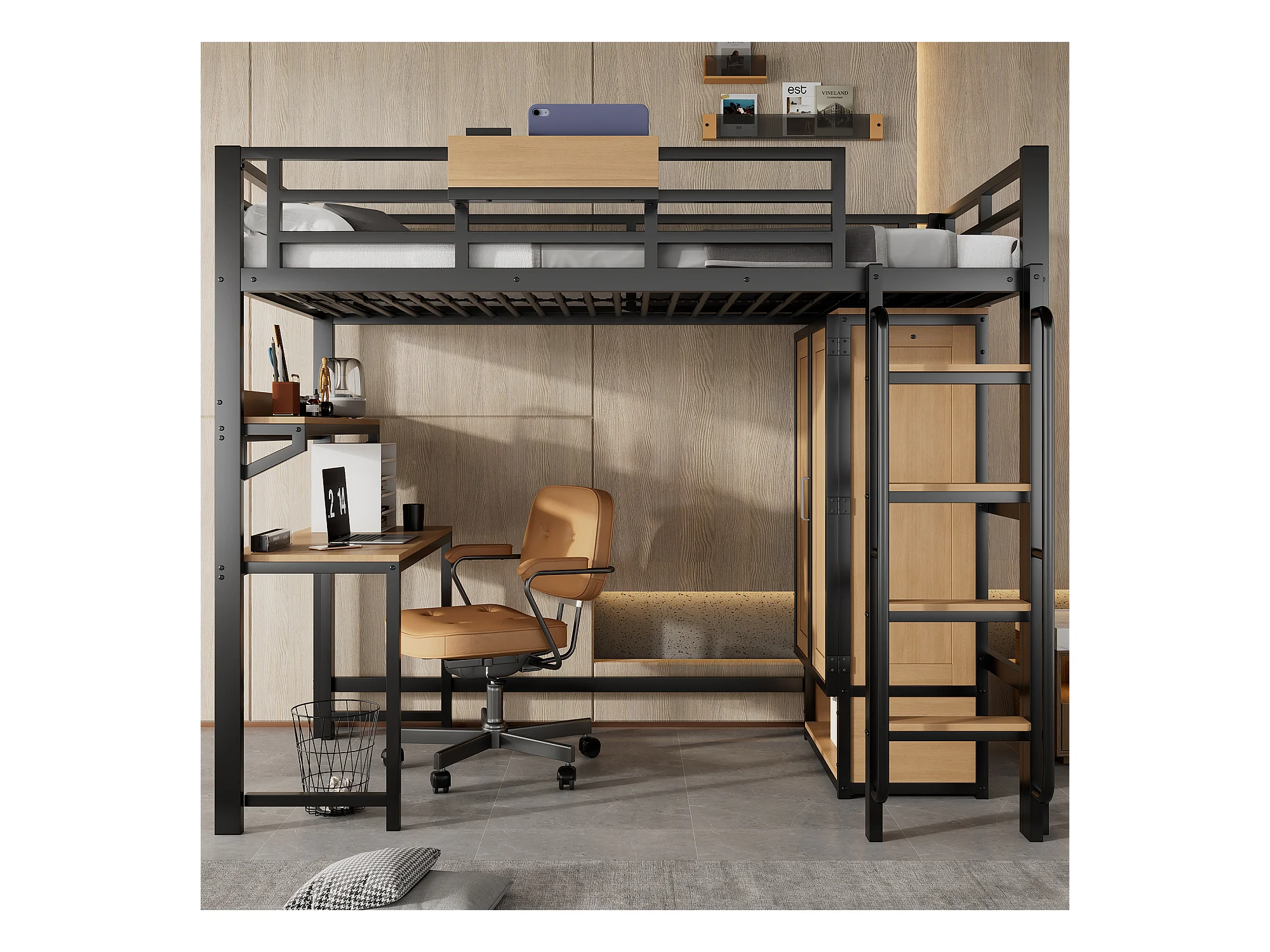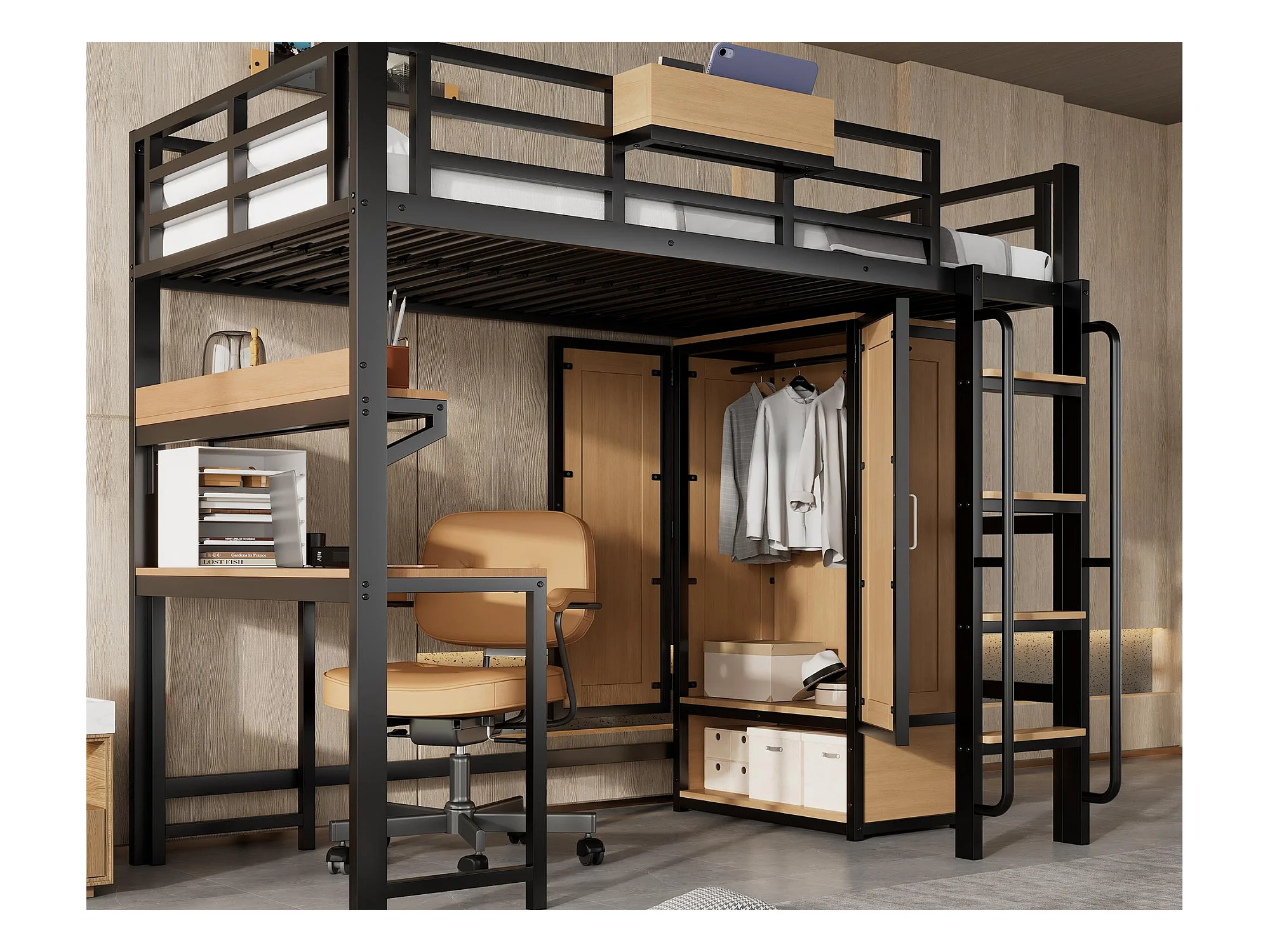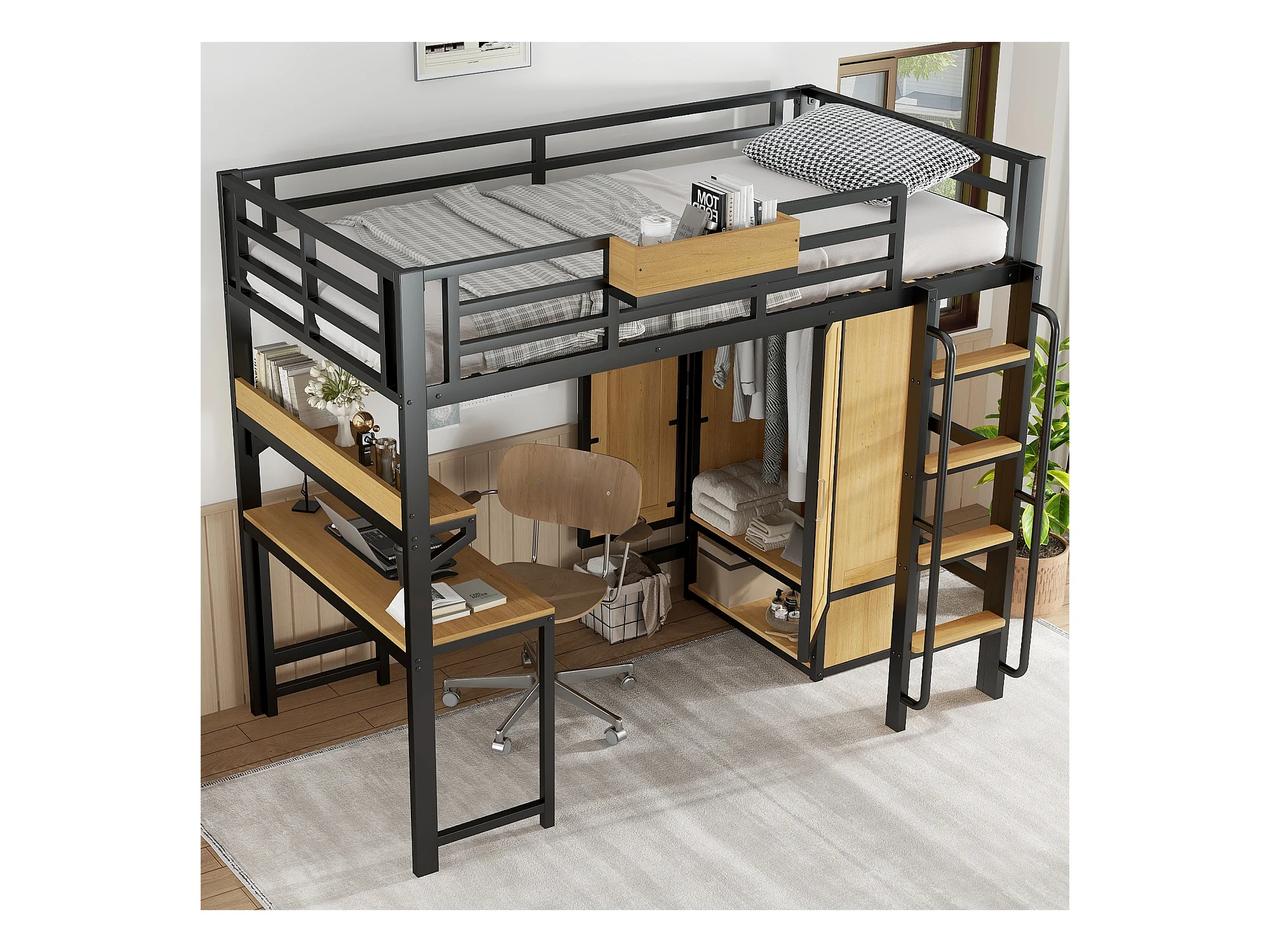 Lit mezzanine 90x200 cm - avec bureau et étagère de rangement - armoire à portes doubles - avec échelle - Métal + MDF - Noir + Naturel