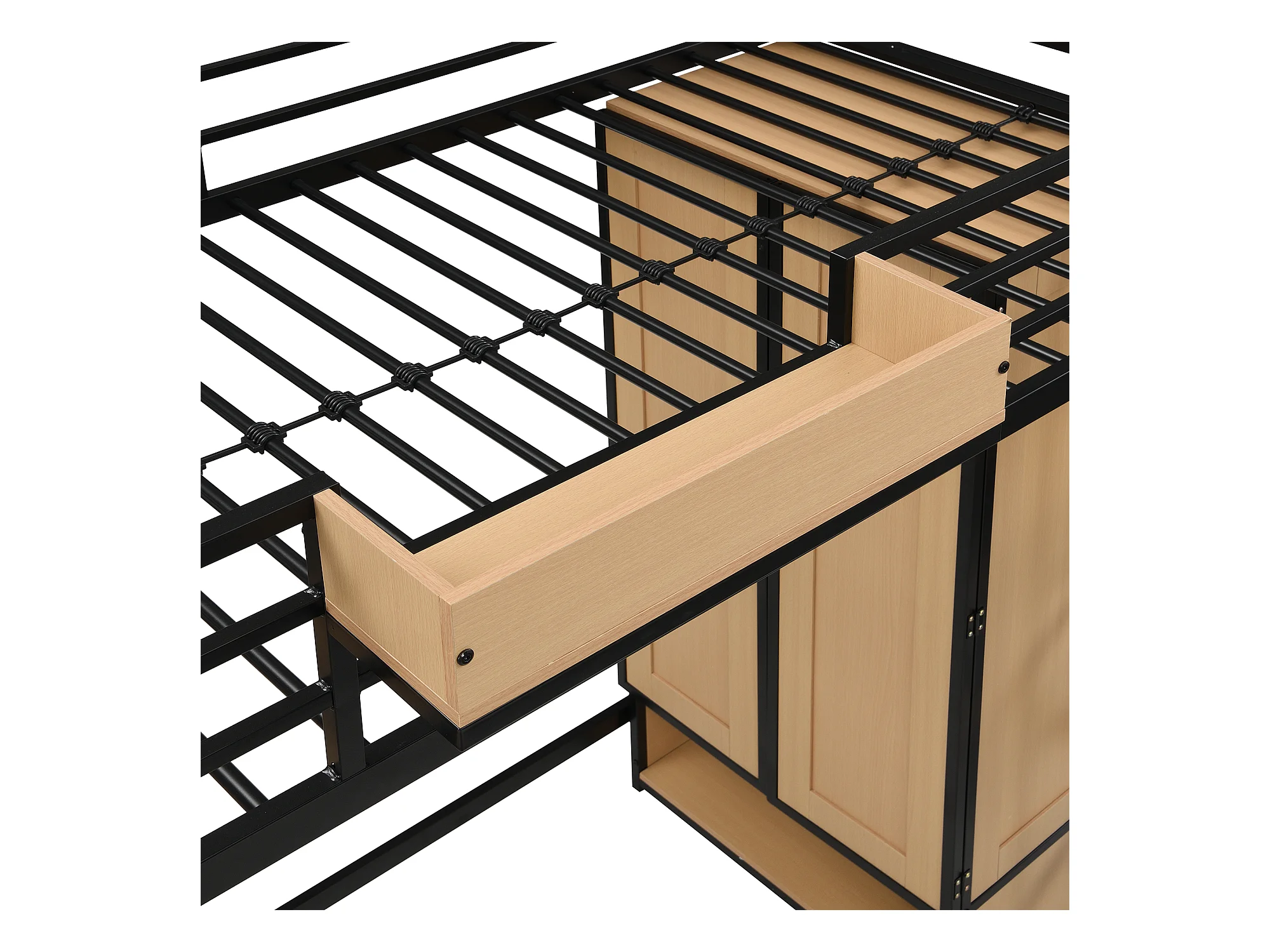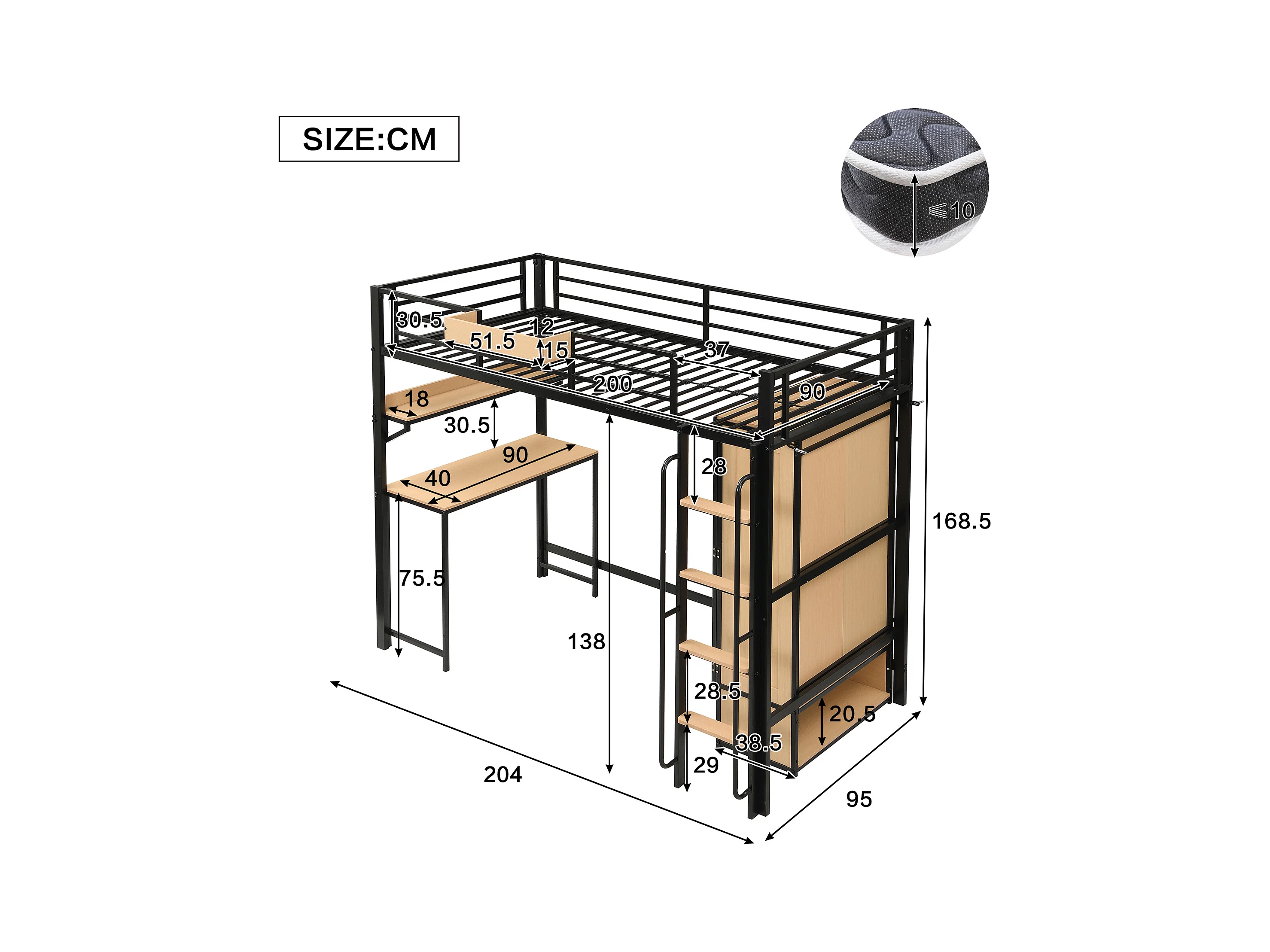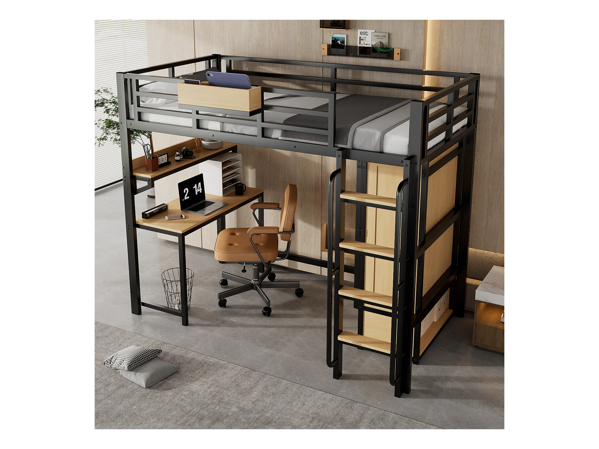 Lit mezzanine 90x200 cm - avec bureau et étagère de rangement - armoire à portes doubles - avec échelle - Métal + MDF - Noir + Naturel