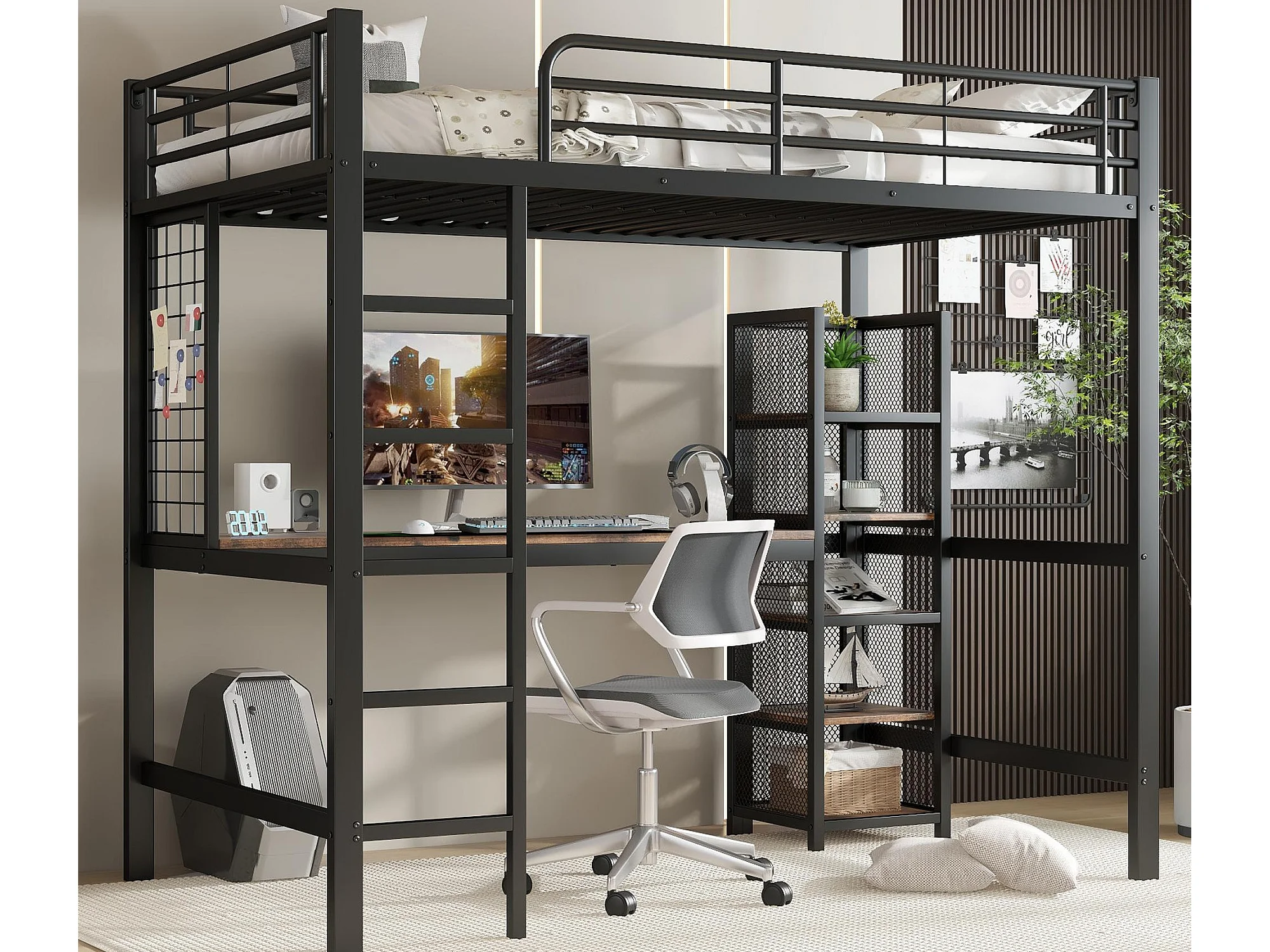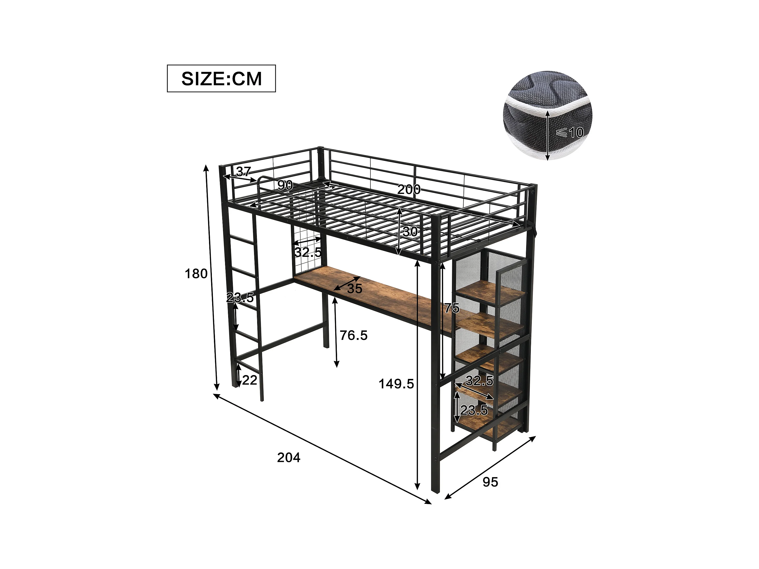 Lit mezzanine 90x200 cm - avec bureau et étagère de rangement - avec échelle de sécurité à 5 marches - Métal + MDF - Noir + Naturel