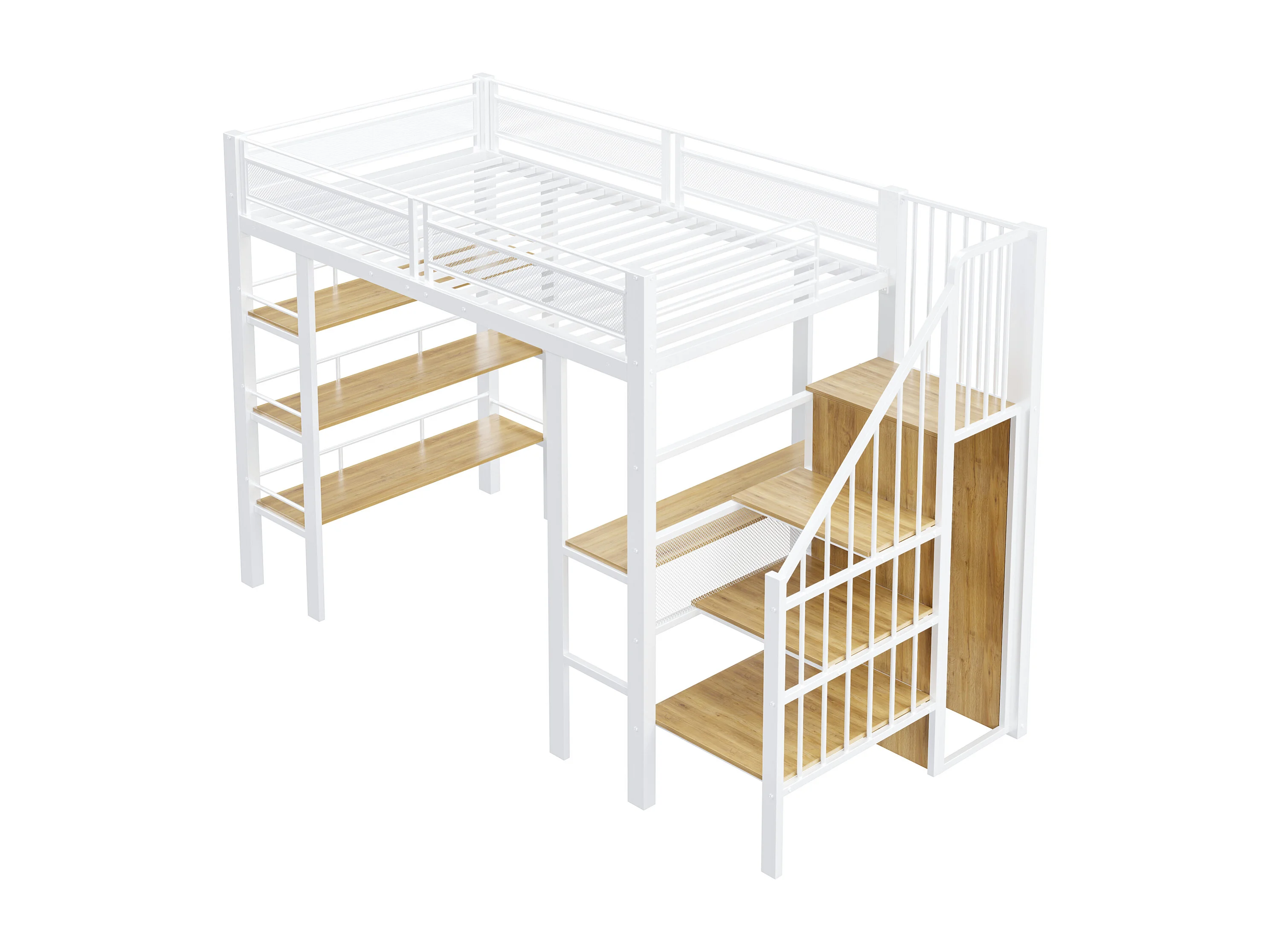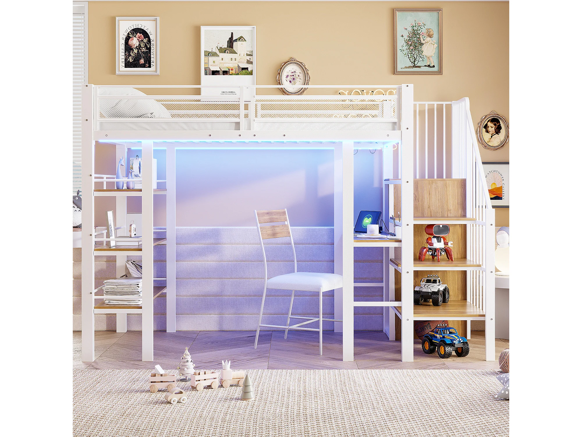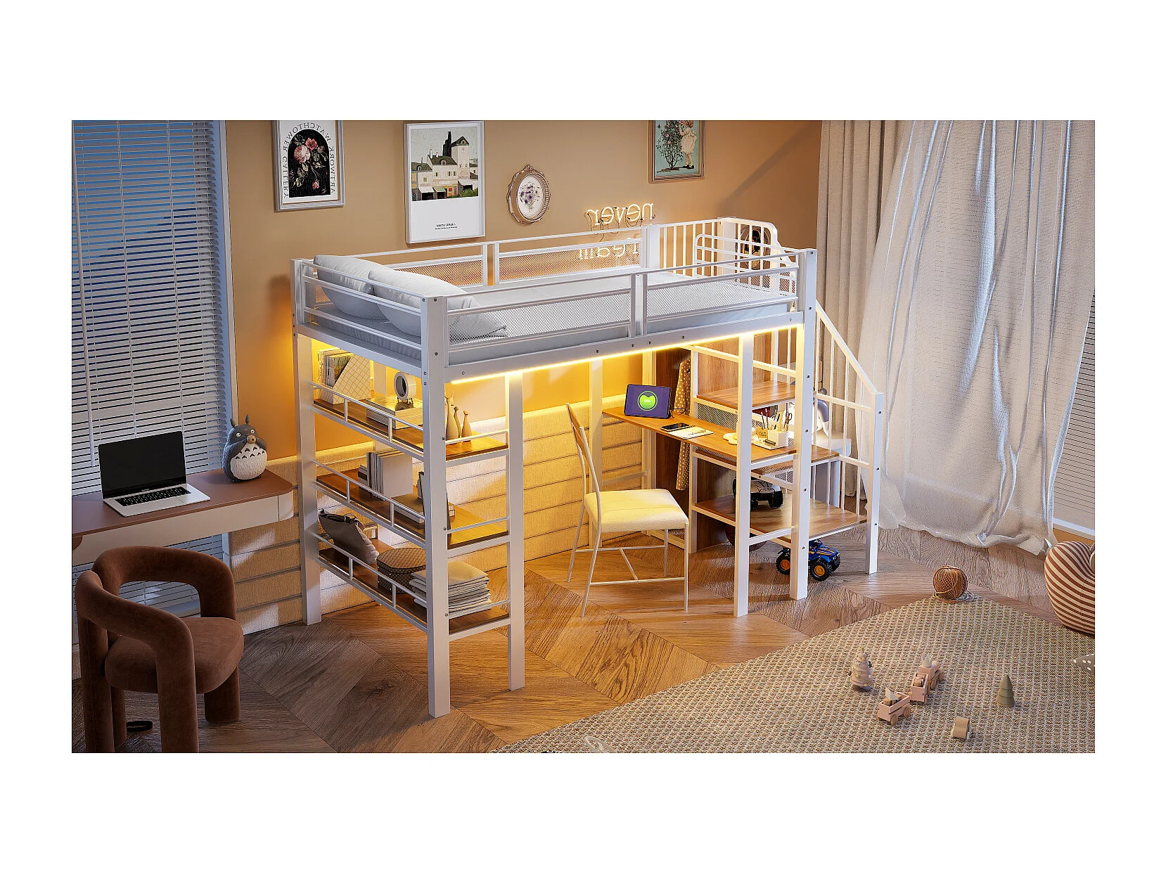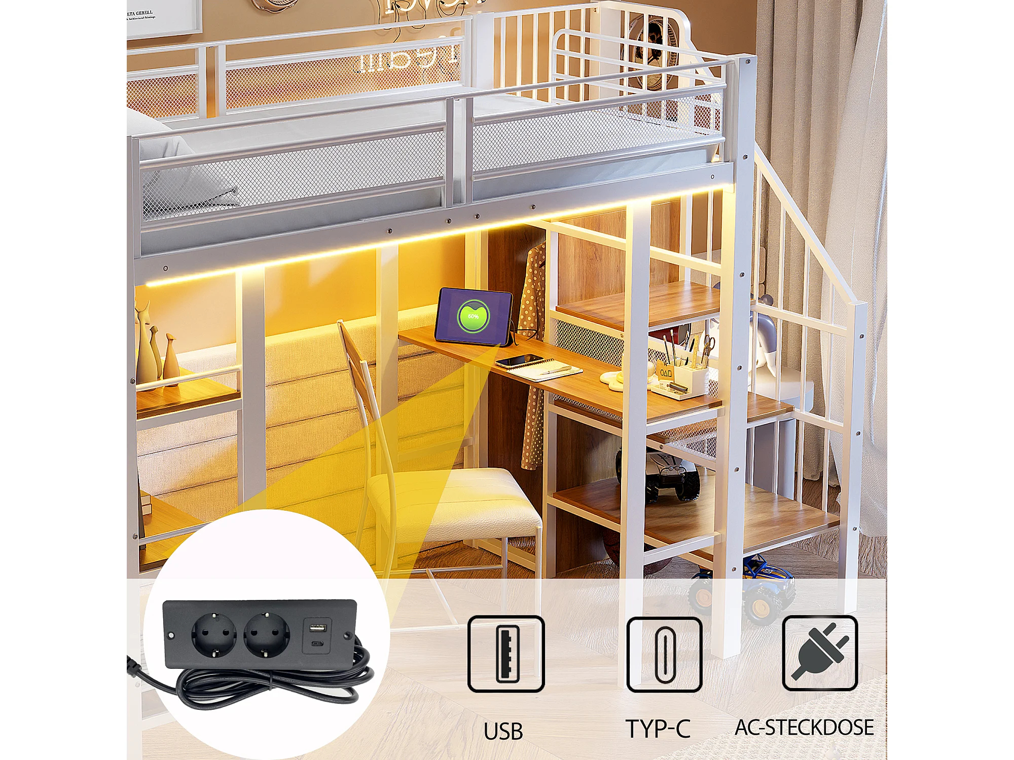 Lit mezzanine 90x200 cm avec bureau, LED et prise USB - Métal blanc et bois MDF