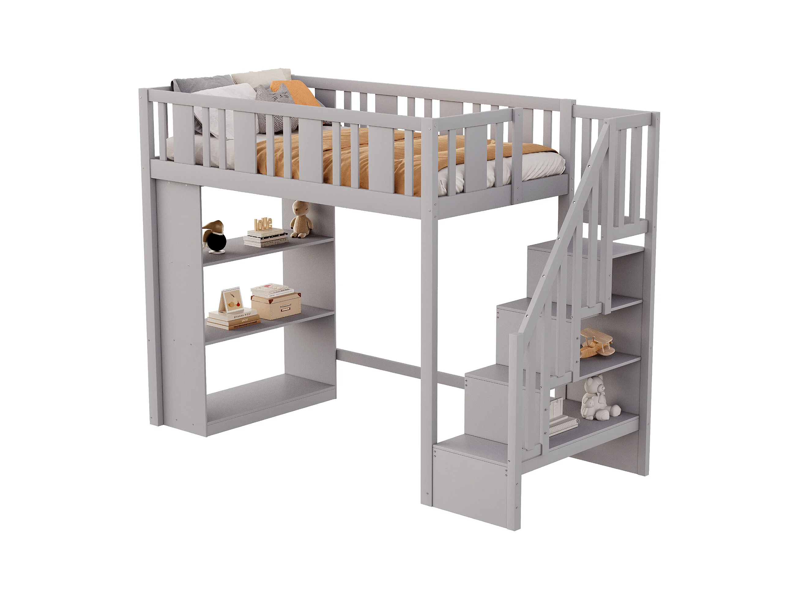 Lit mezzanine 90x200 cm avec échelle de rangement, lit en bois massif avec grands compartiments de stockage, gris (253x95x160.2 cm)