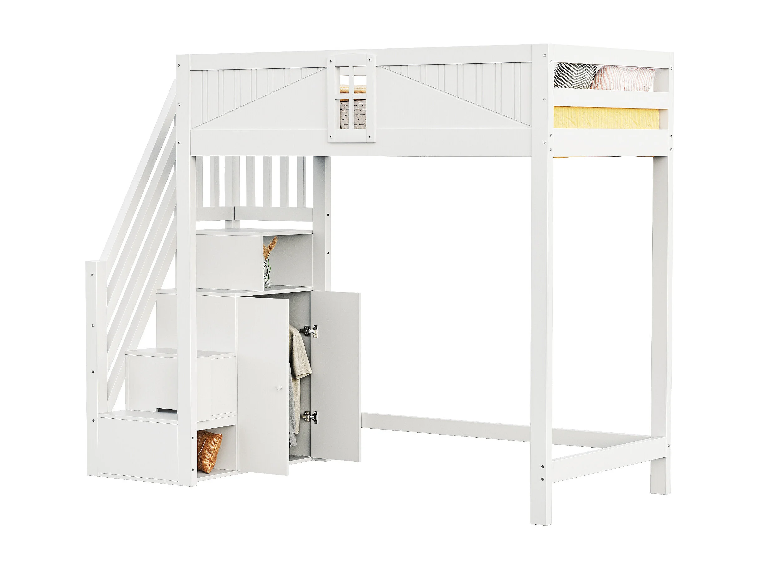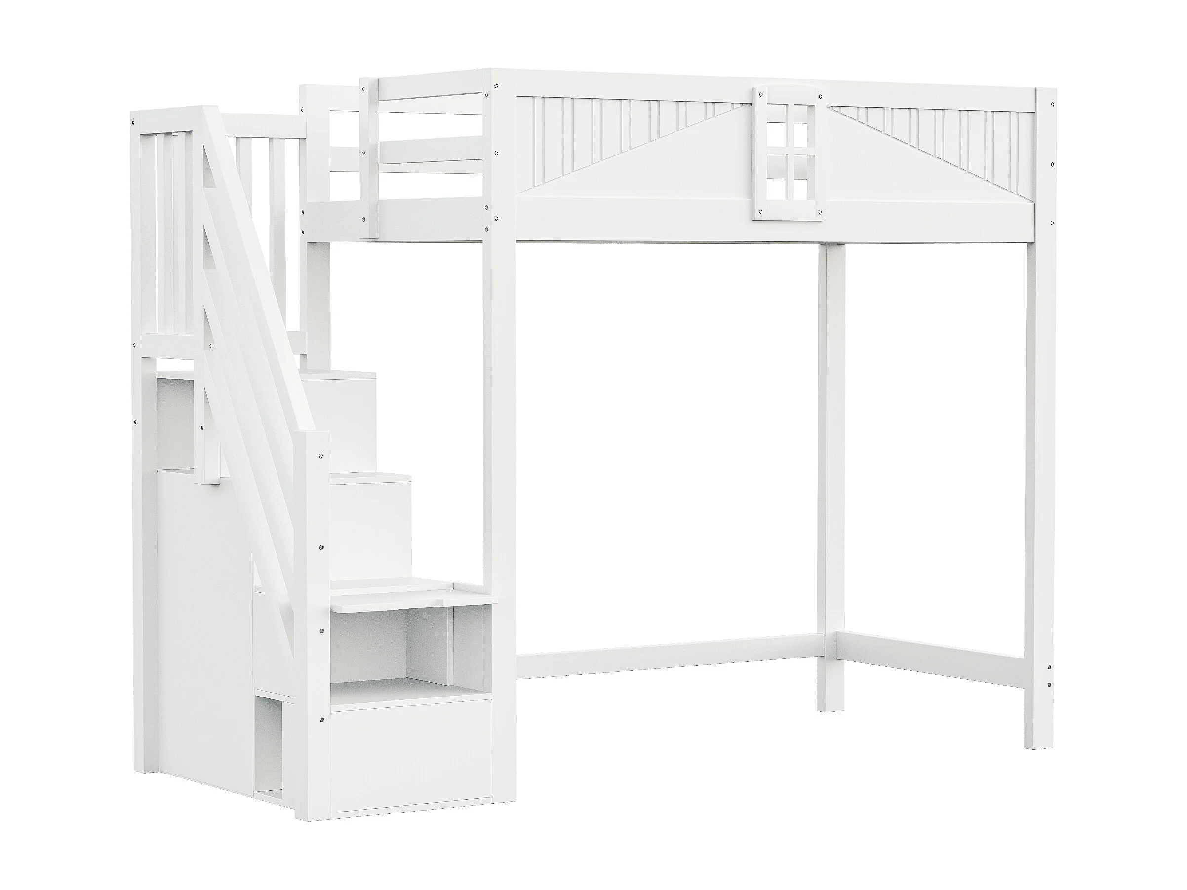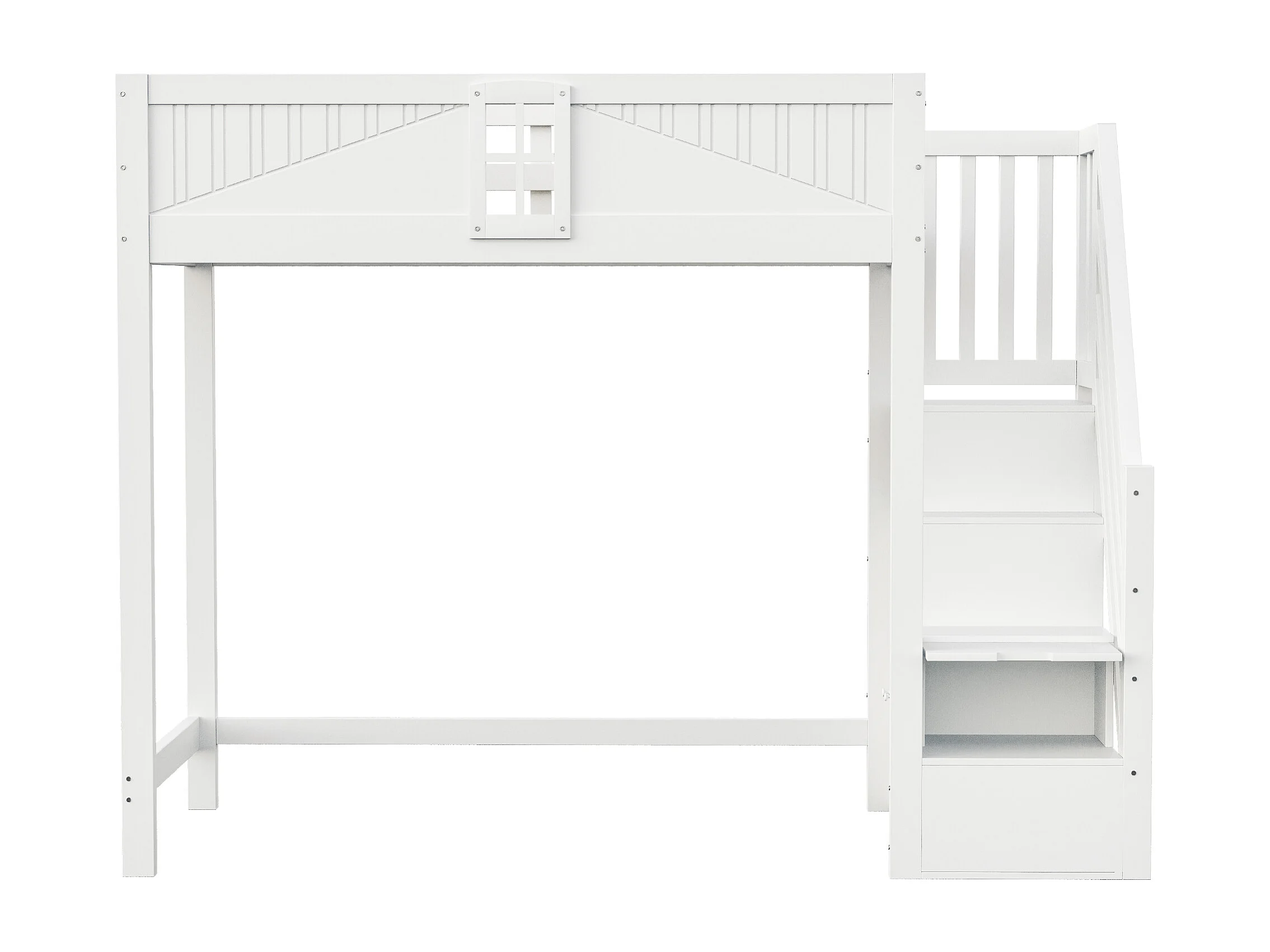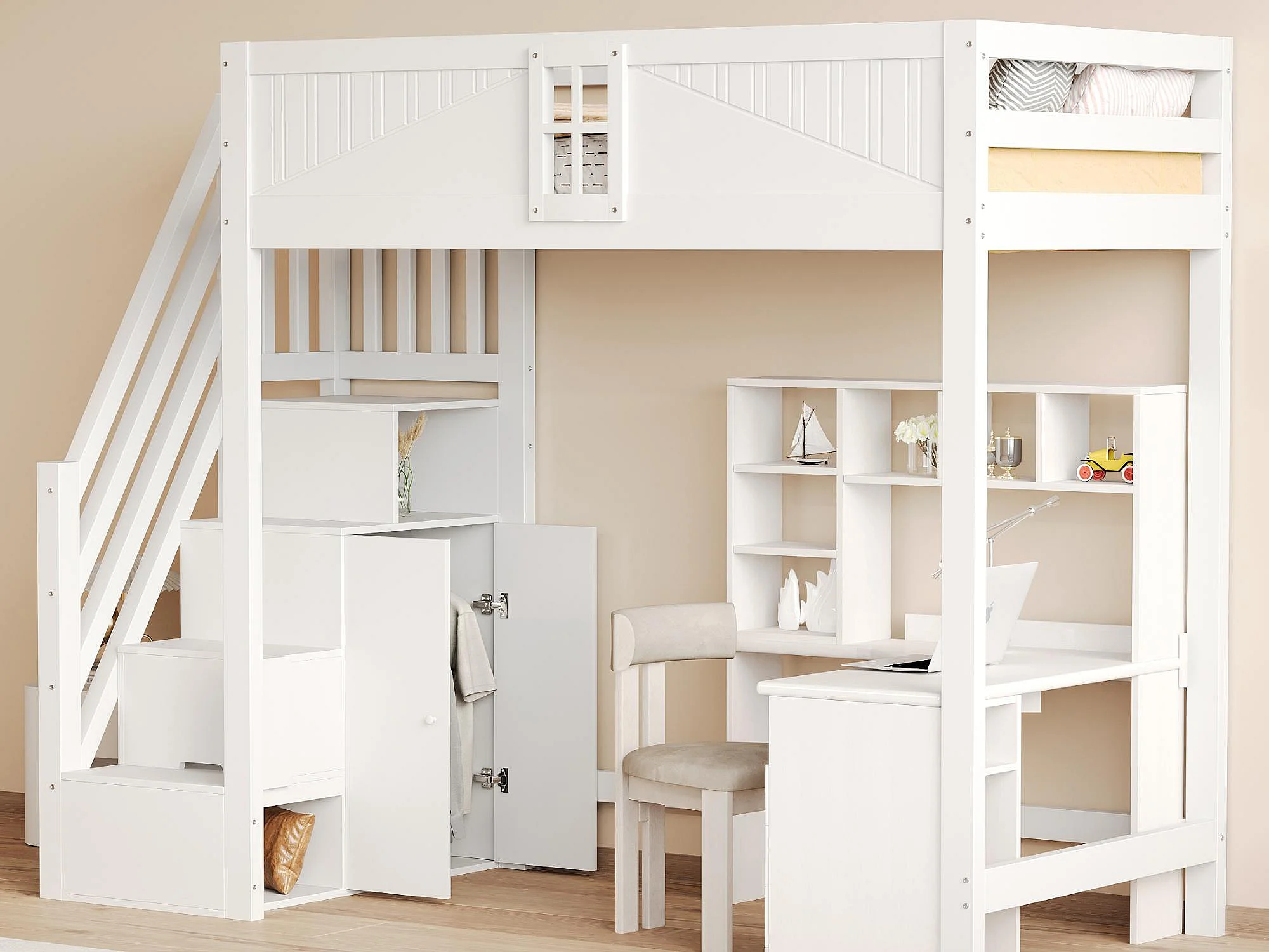 Lit mezzanine 90x200 cm - avec rangements - avec échelle - avec garde-corps - avec bureau - blanc (sans matelas)