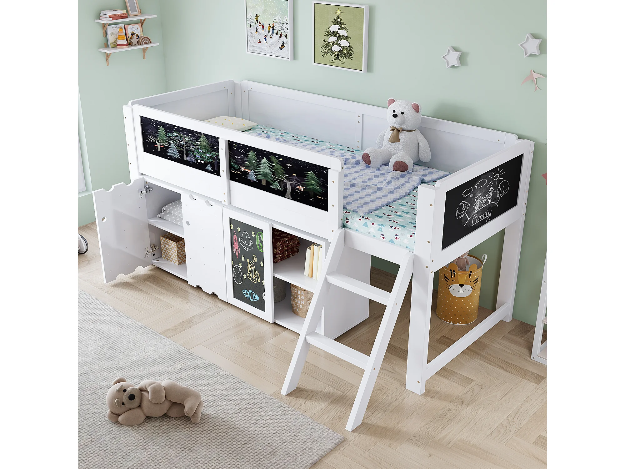 Lit mezzanine 90x200 cm - avec tableau noir - avec 3 portes et une échelle - bois massif + MDF - Blanc (sans matelas)