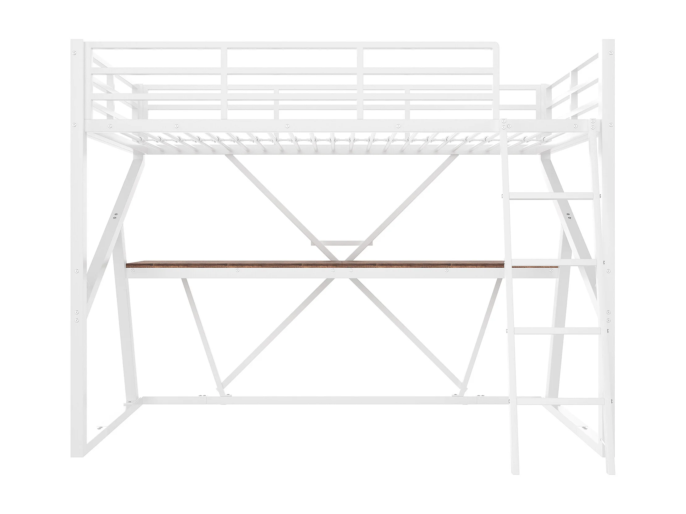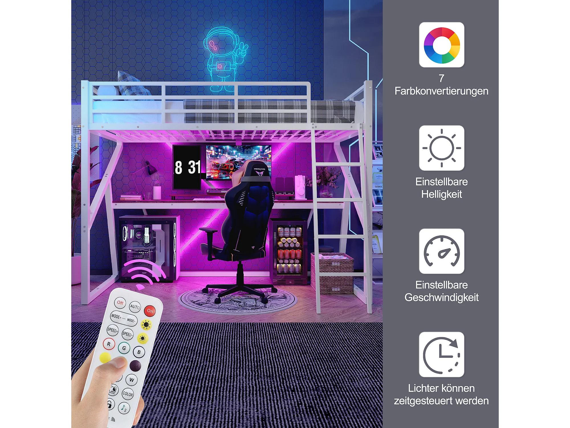 Lit mezzanine 90x200 cm, cadre métallique, avec LED télécommandé, garde-corps, échelle, bureau, blanc (204x98x160.5 cm)