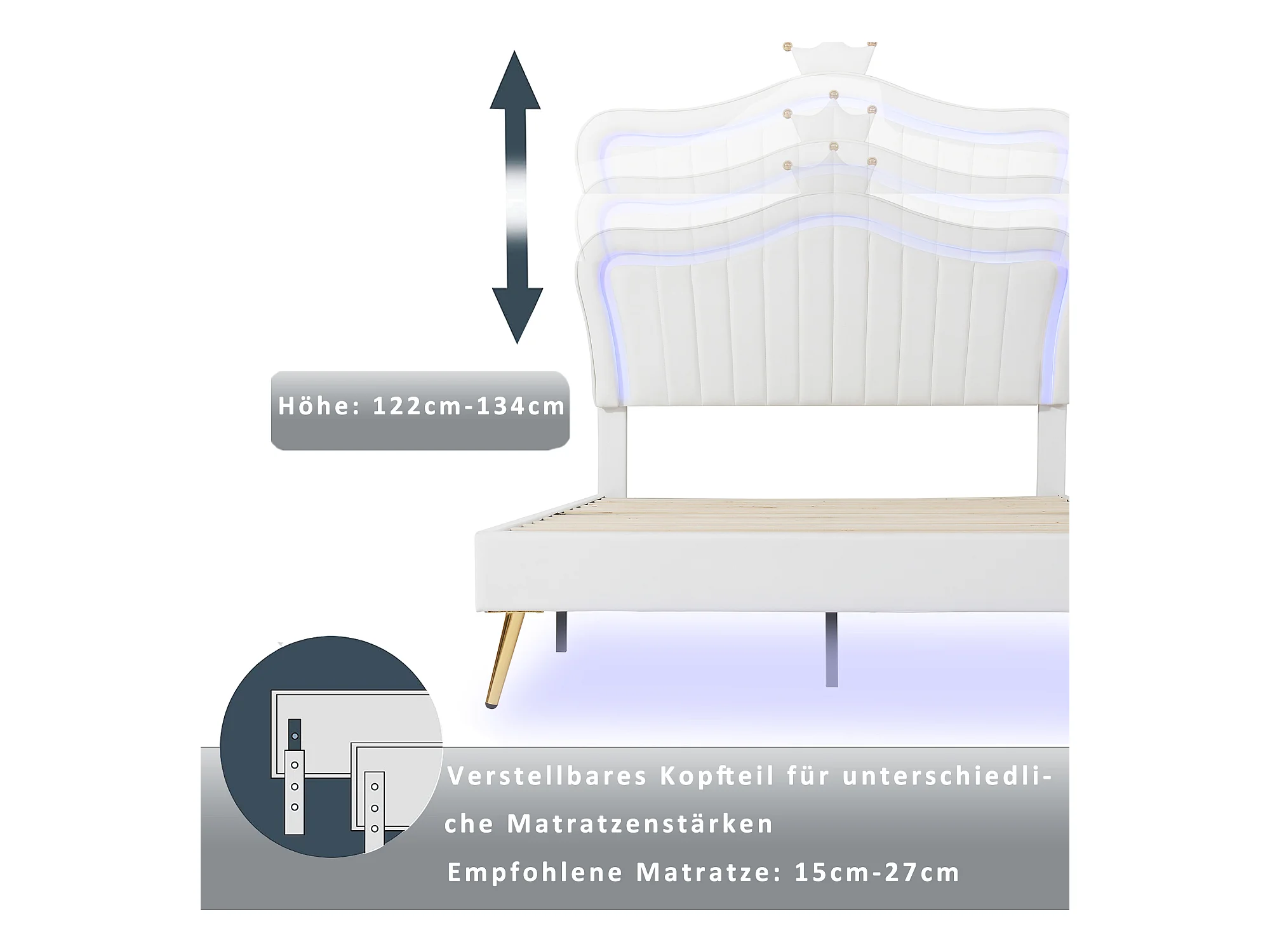 Lit mezzanine avec rangement, cadre en métal, blanc, avec 4 tiroirs, USB+TYPE-C, barre LED (90x200x180cm)