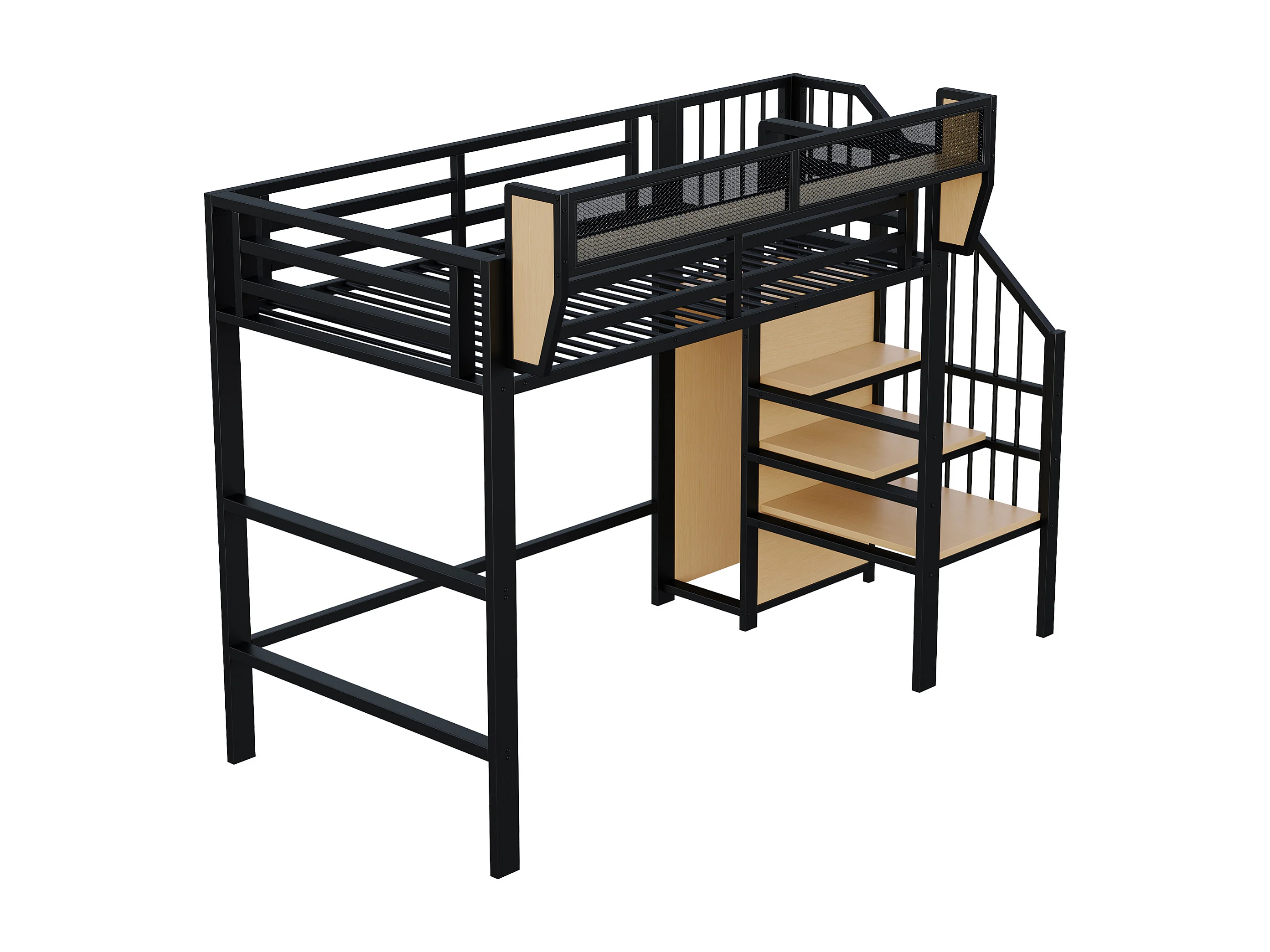 Lit mezzanine 90x200 cm, échelle sécurisée, rangement flexible, métal, noir (255x98x178.5 cm)