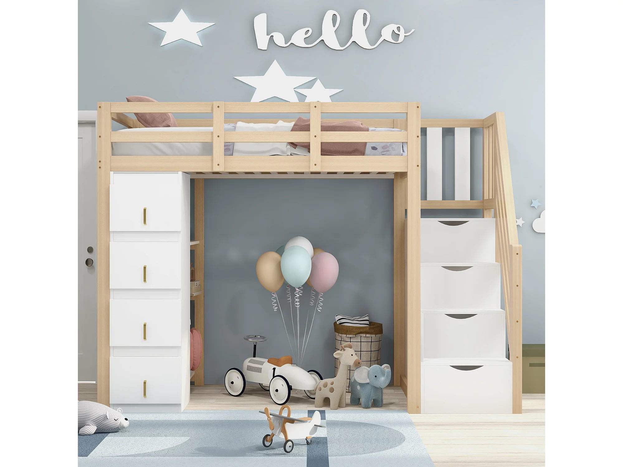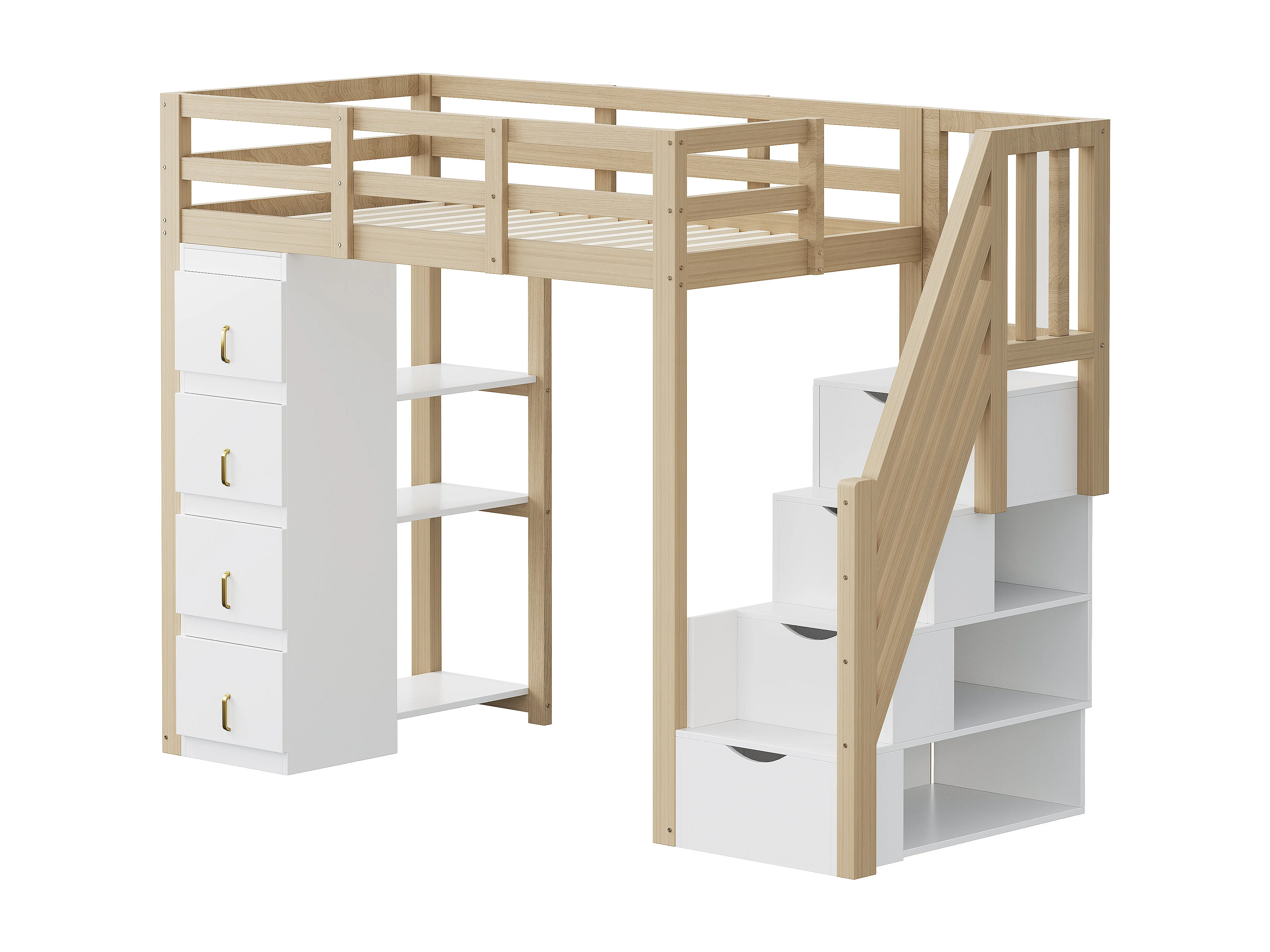 Lit mezzanine 90x200 cm en bois avec tiroirs, étagères multiples et échelle sécurisée – Lit multifonction pratique et robuste