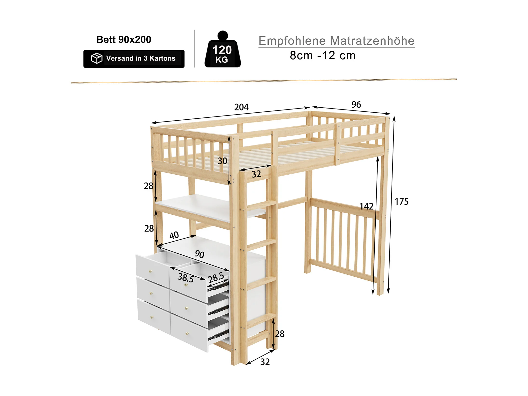 Lit mezzanine 90x200 cm en pin bois couleur bois/blanc avec échelle sécurisée, tiroirs, garde-corps haut