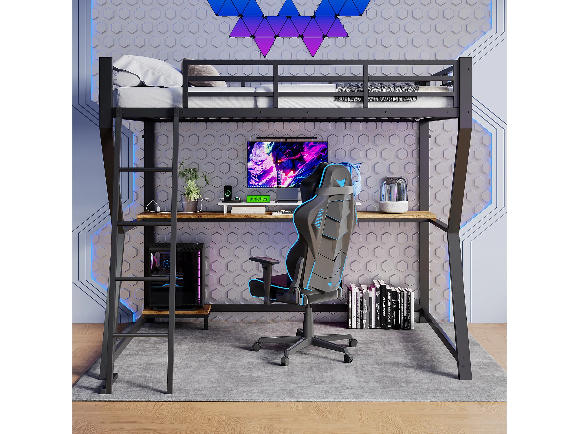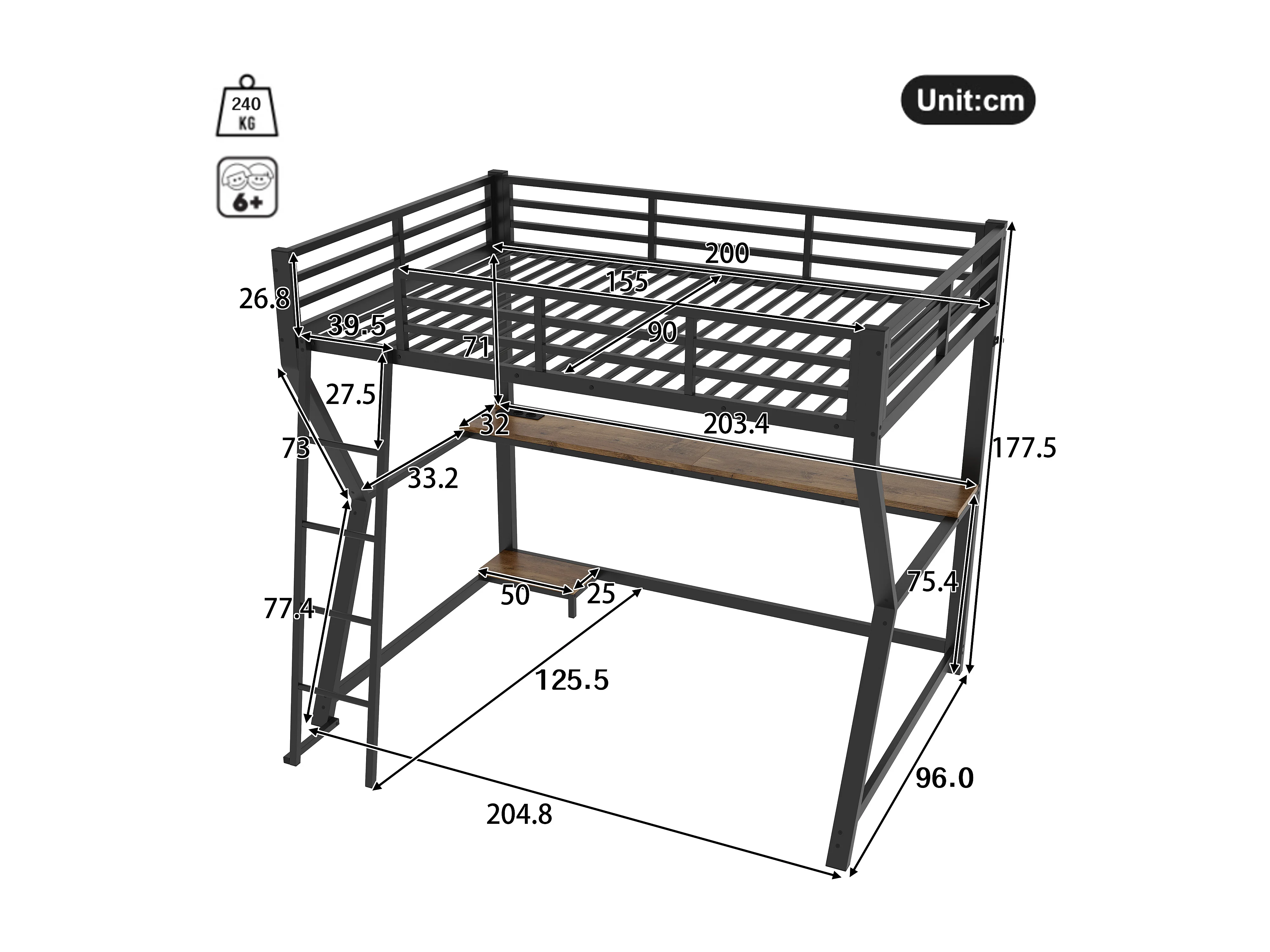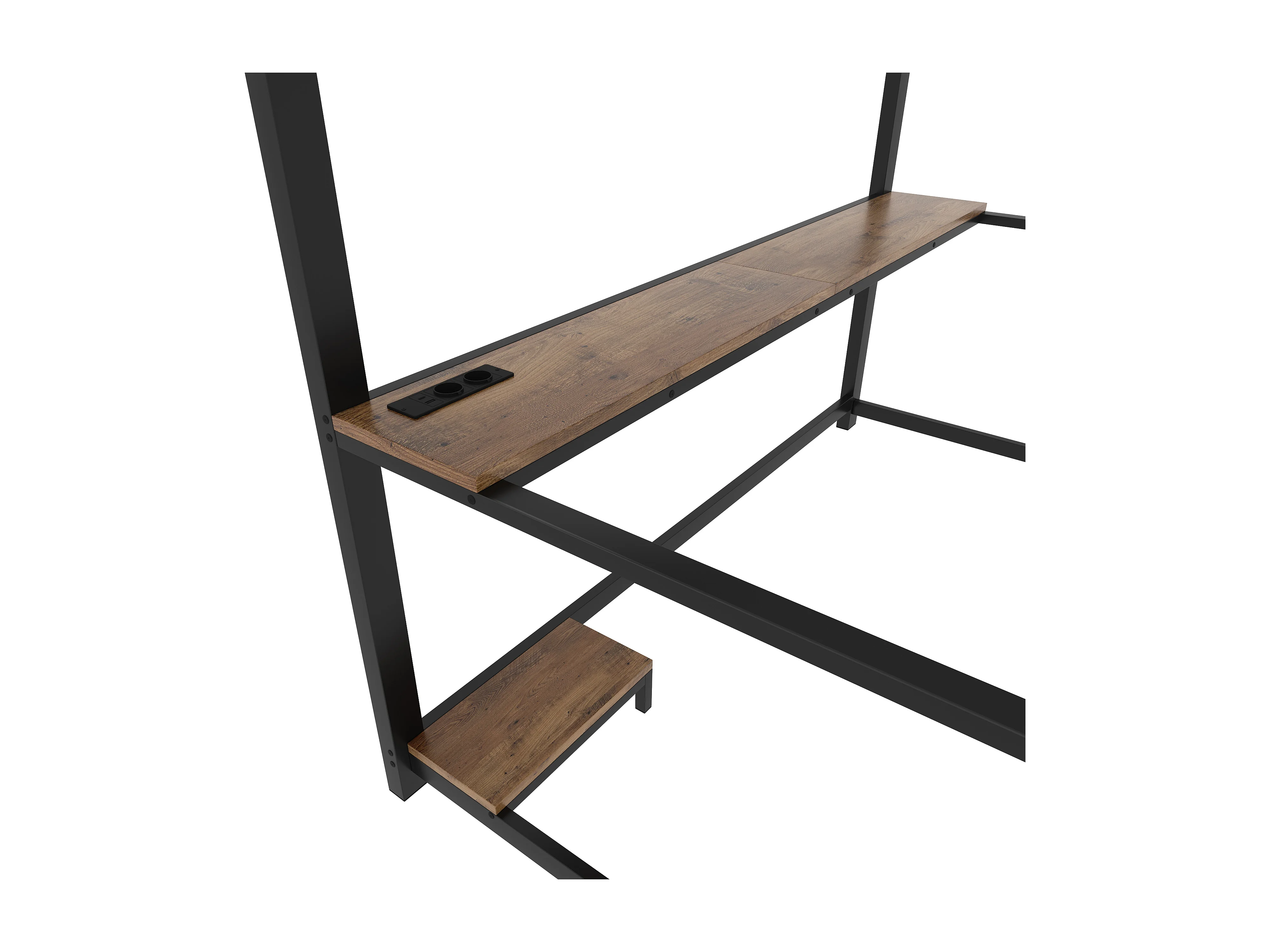 Lit mezzanine 90x200 cm, noir, lit ado avec éclairage LED et USB, bureau - sans matelas