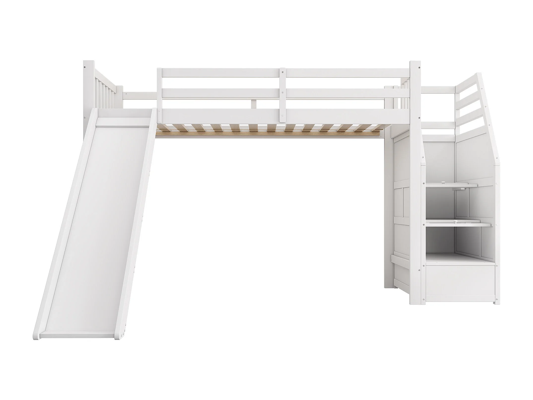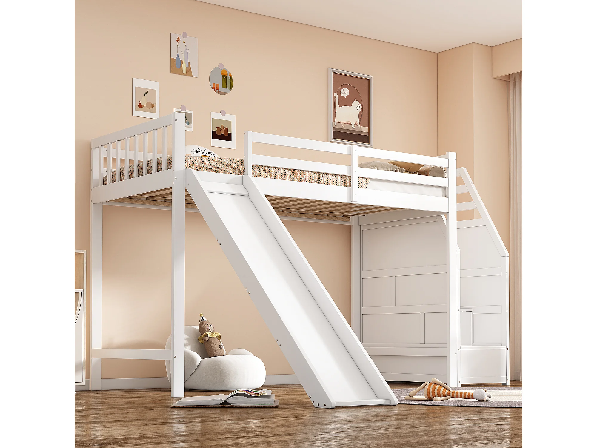 Lit Mezzanine 90x200 cm pour Enfant avec Toboggan, Échelle de Rangement, Certifié EN747, Sans Matelas - Blanc