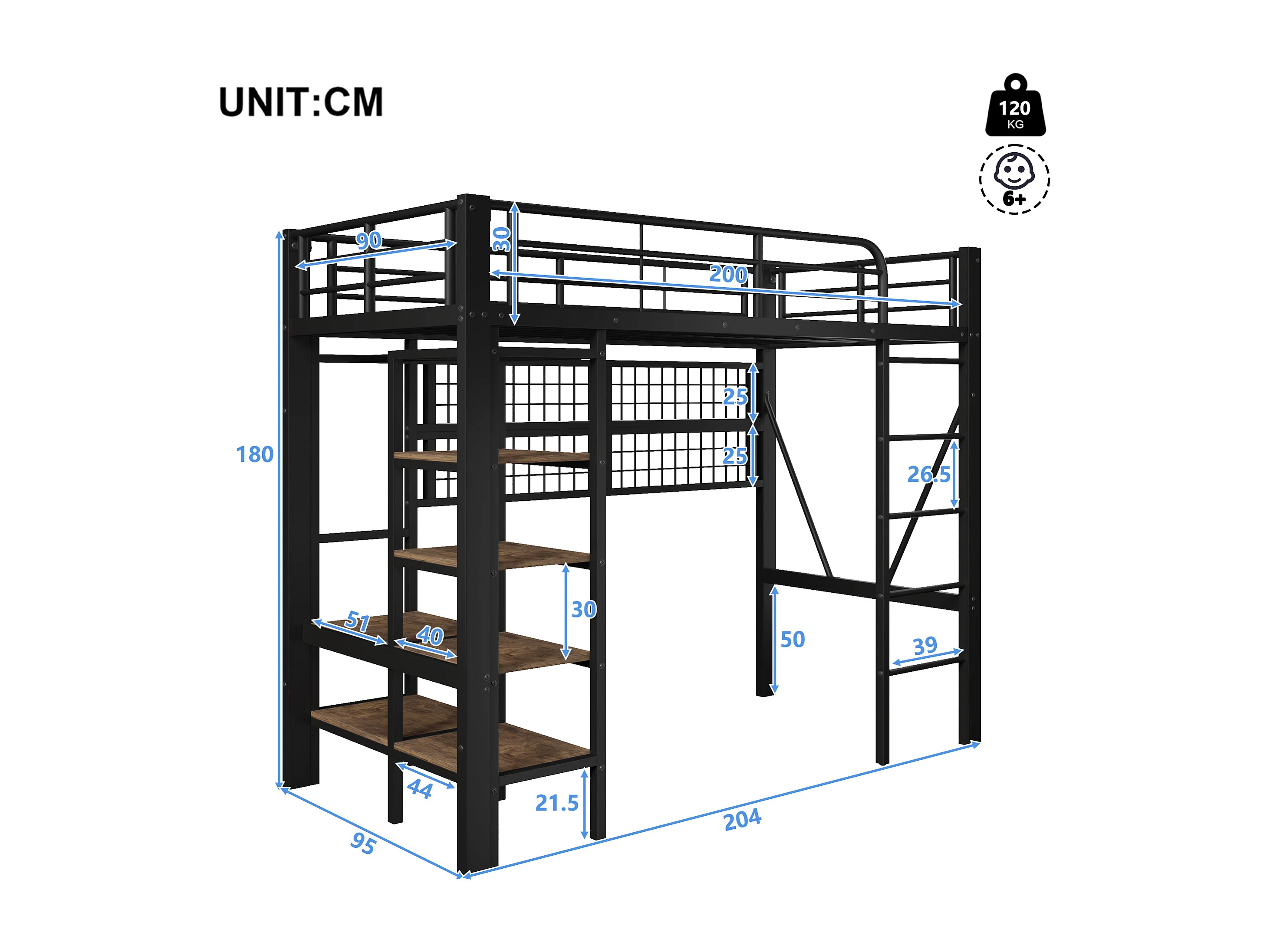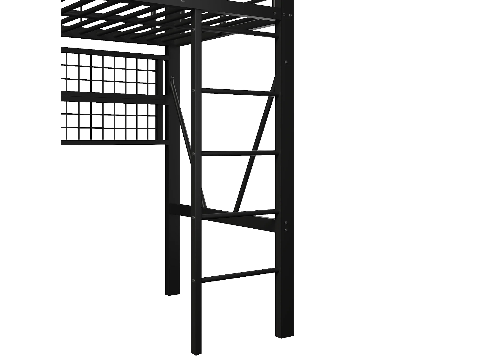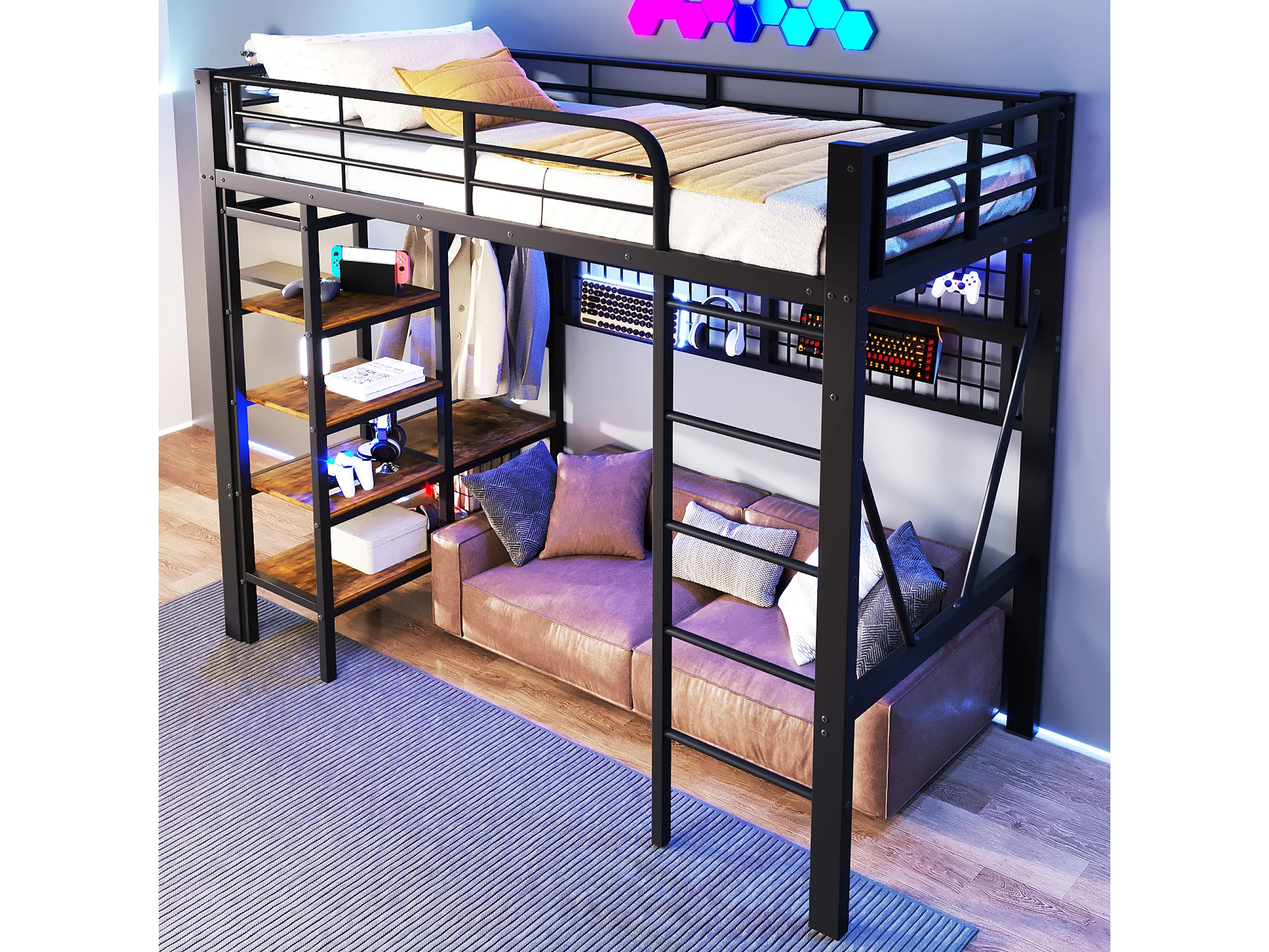 Lit mezzanine 90x200 cm - Structure en fer - avec compartiments de rangement - avec éclairage LED - Noir (matelas non inclus)