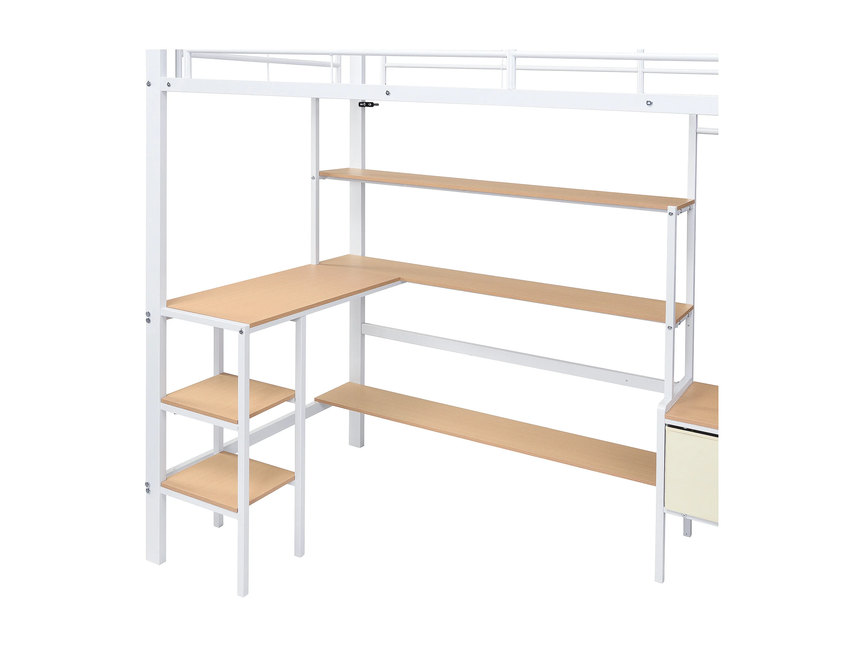 Lit mezzanine 90x200cm avec bureau , étagère et 2 boîte en tissu - Blanc + naturel