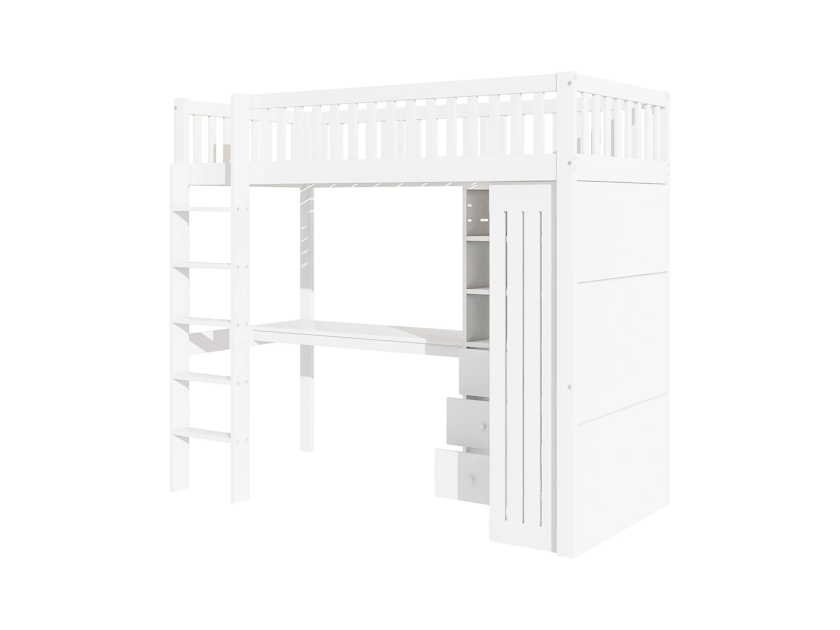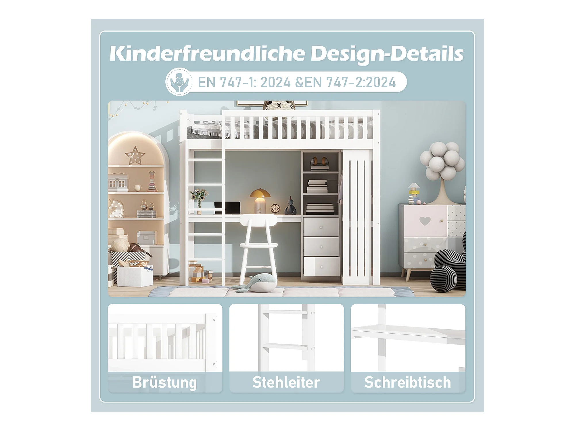 Lit mezzanine, 90x200cm, bureau, armoire, 3 tiroirs, rangement ouvert, garde-corps, échelle, sans matelas, Blanc (205x95x180 cm)