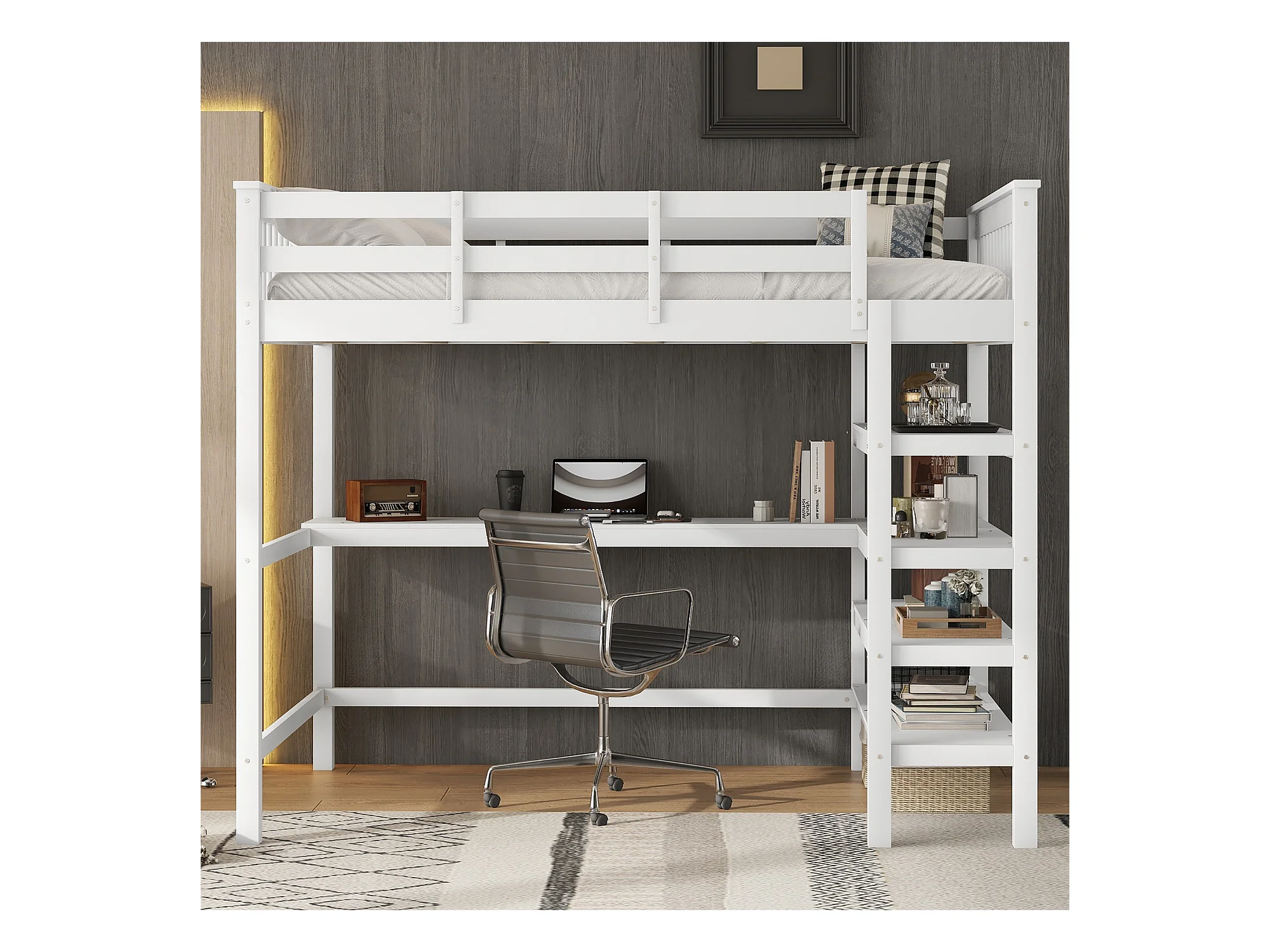 Lit mezzanine 90x200cm, avec bureau en bas, grand espace de rangement, garde-corps élevé, échelle stable, blanc (204x97x167 cm)
