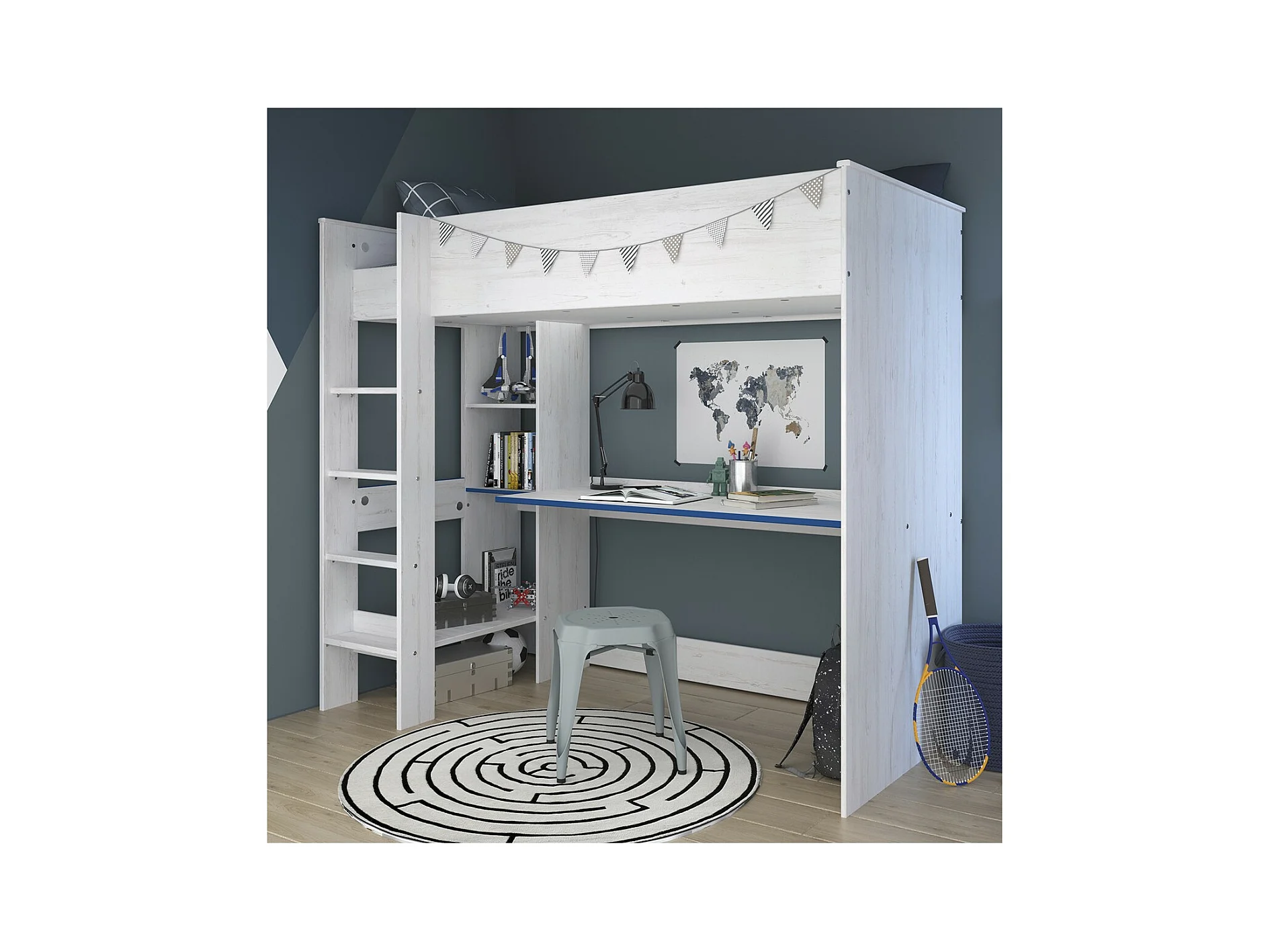Lit Mezzanine avec Bureau effet bois blanc - 90x200 - Snoozy