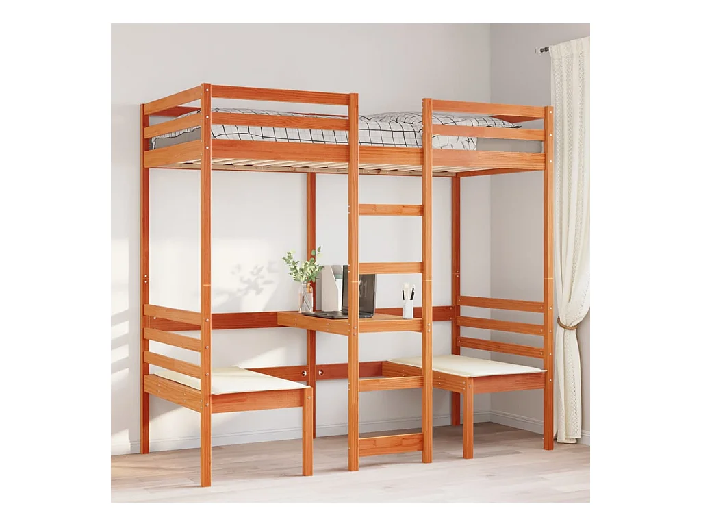 Lit mezzanine avec bureau et chaises brun cire 90x190 cm pin