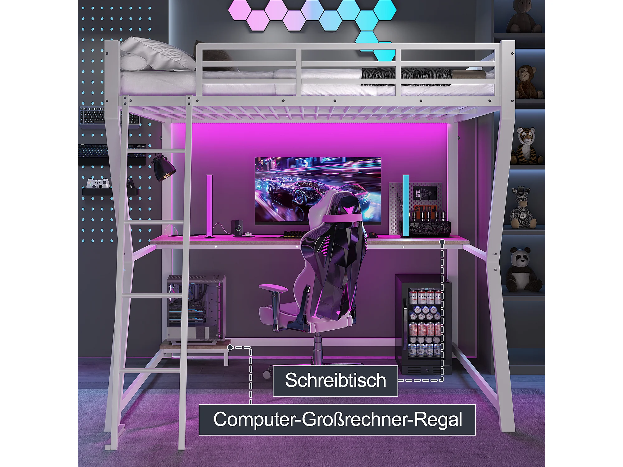 Lit mezzanine avec bureau et éclairage LED, métal et MDF, blanc, escalier sécurisé (204.5x145.5x177.5cm)