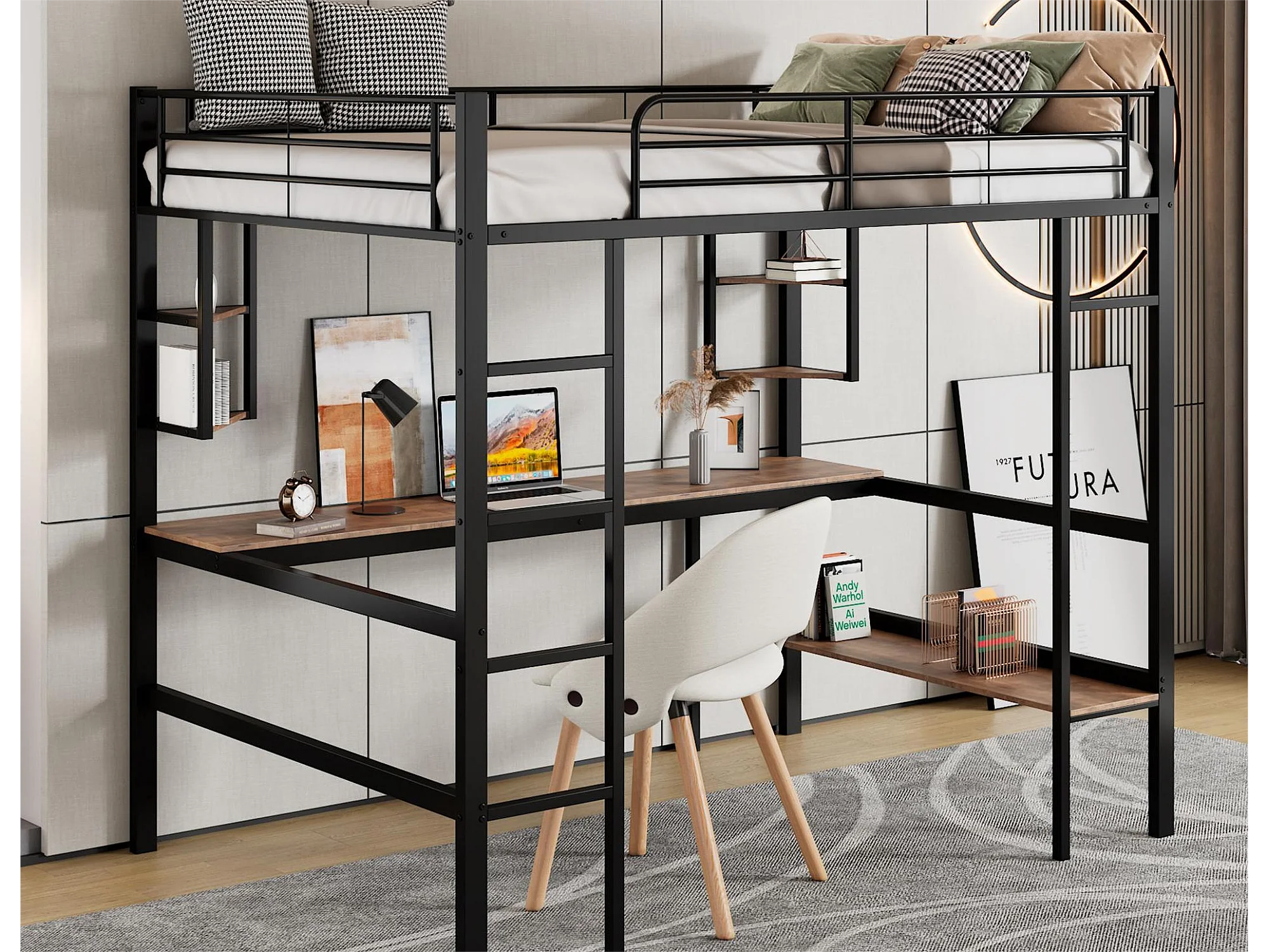 Lit mezzanine avec bureau et étagères pour enfants - 90 x 200 cm - bois MDF et métal - noir