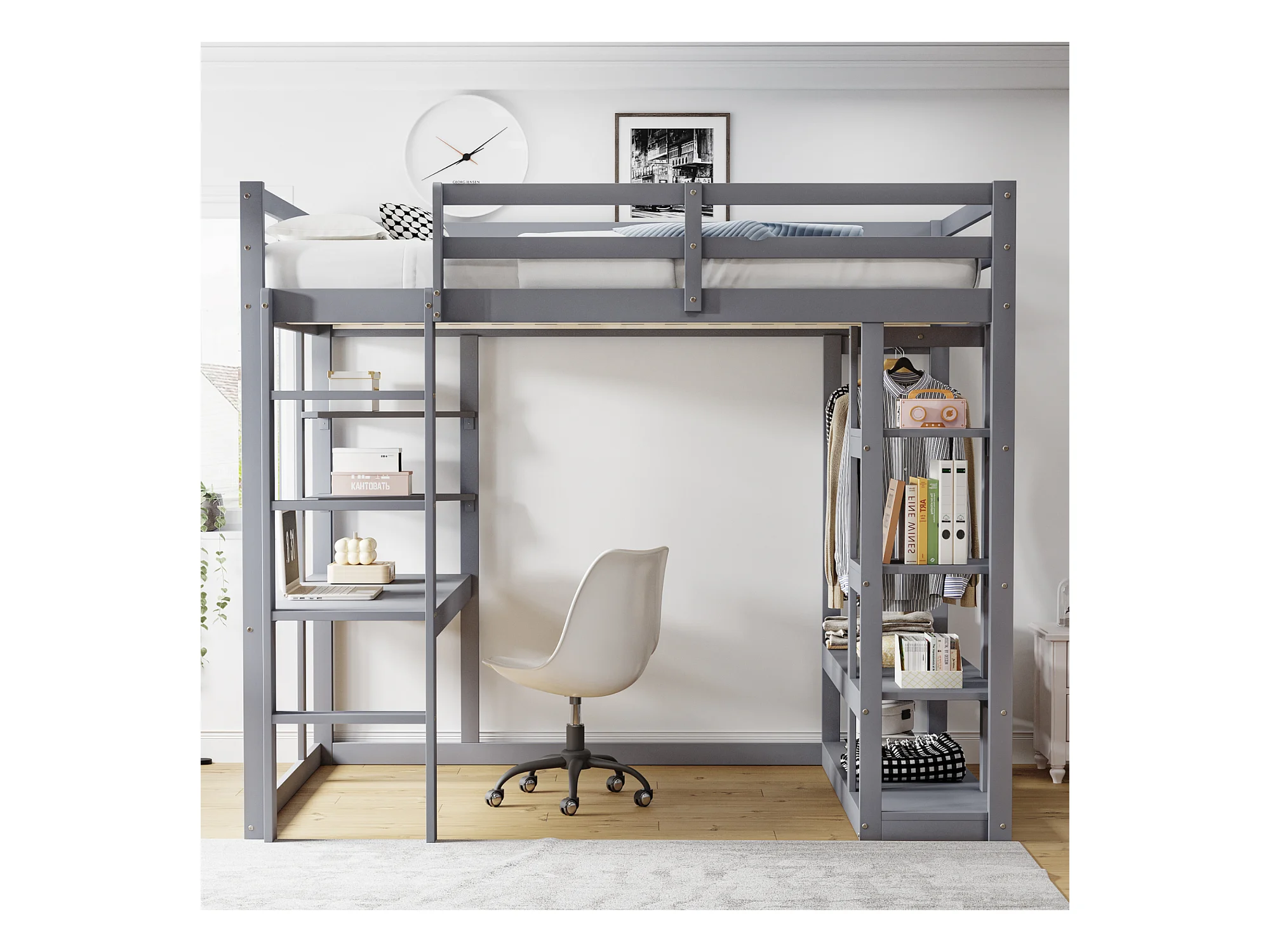 Lit mezzanine enfant 140x200cm - avec échelle - avec table - avec cintre simple - gris (sans matelas)