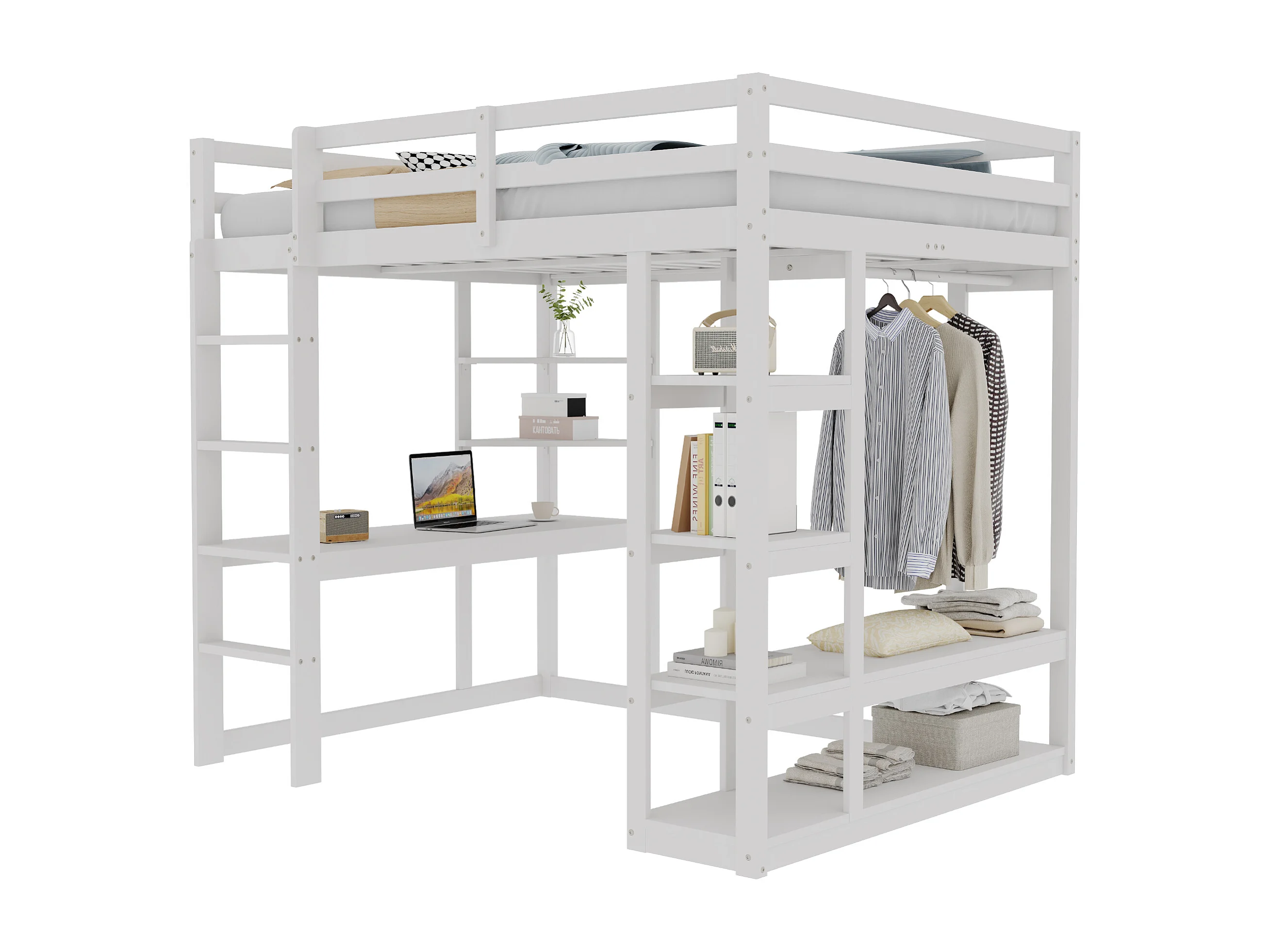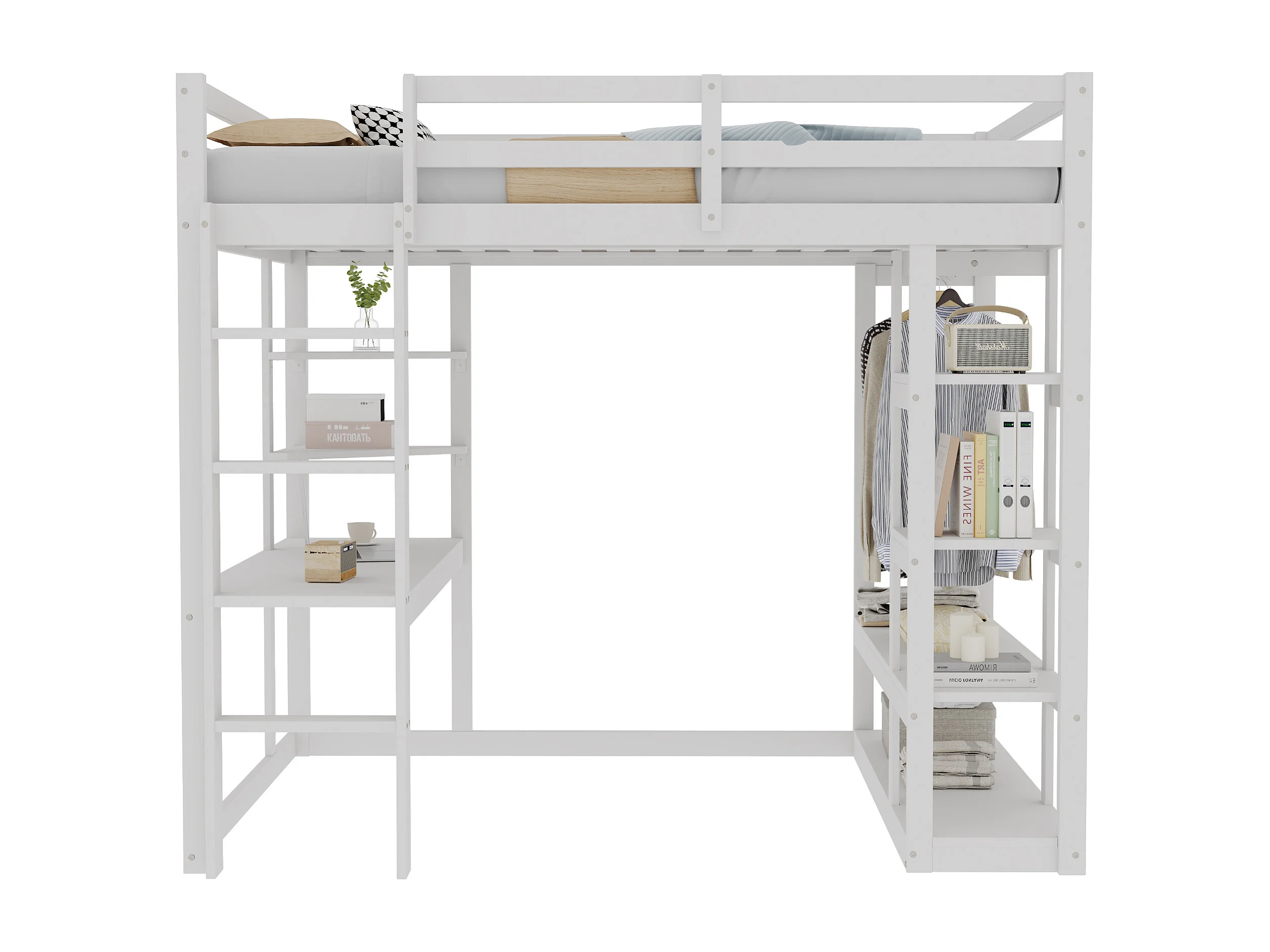 Lit mezzanine enfant - 140 x 200 cm - avec échelle + table + étagères + cintres - bois + MDF - blanc