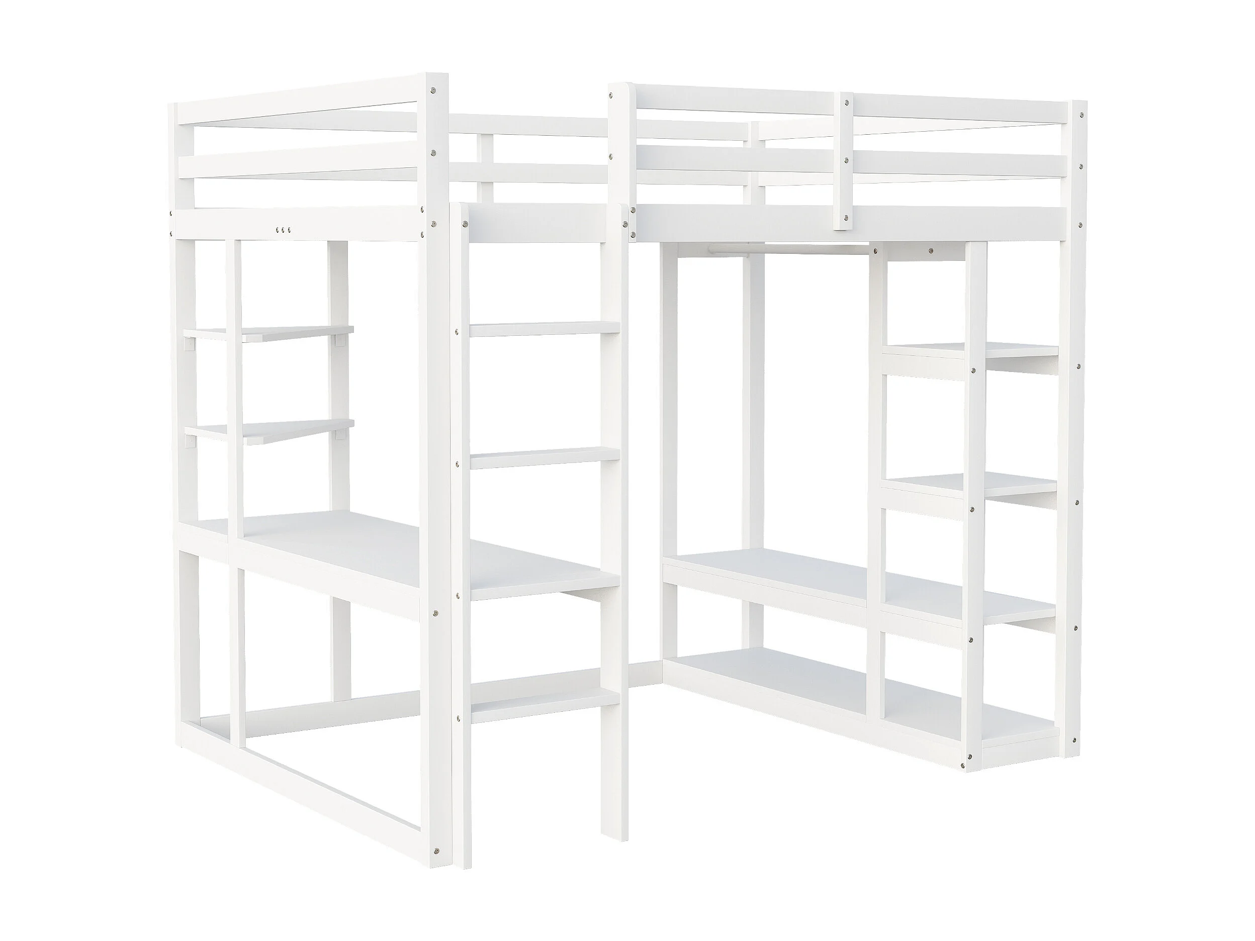 Lit mezzanine 140x200cm avec tiroirs de rangement, échelle sécurisée et étagères, bois massif, blanc (253x146.5x168cm)