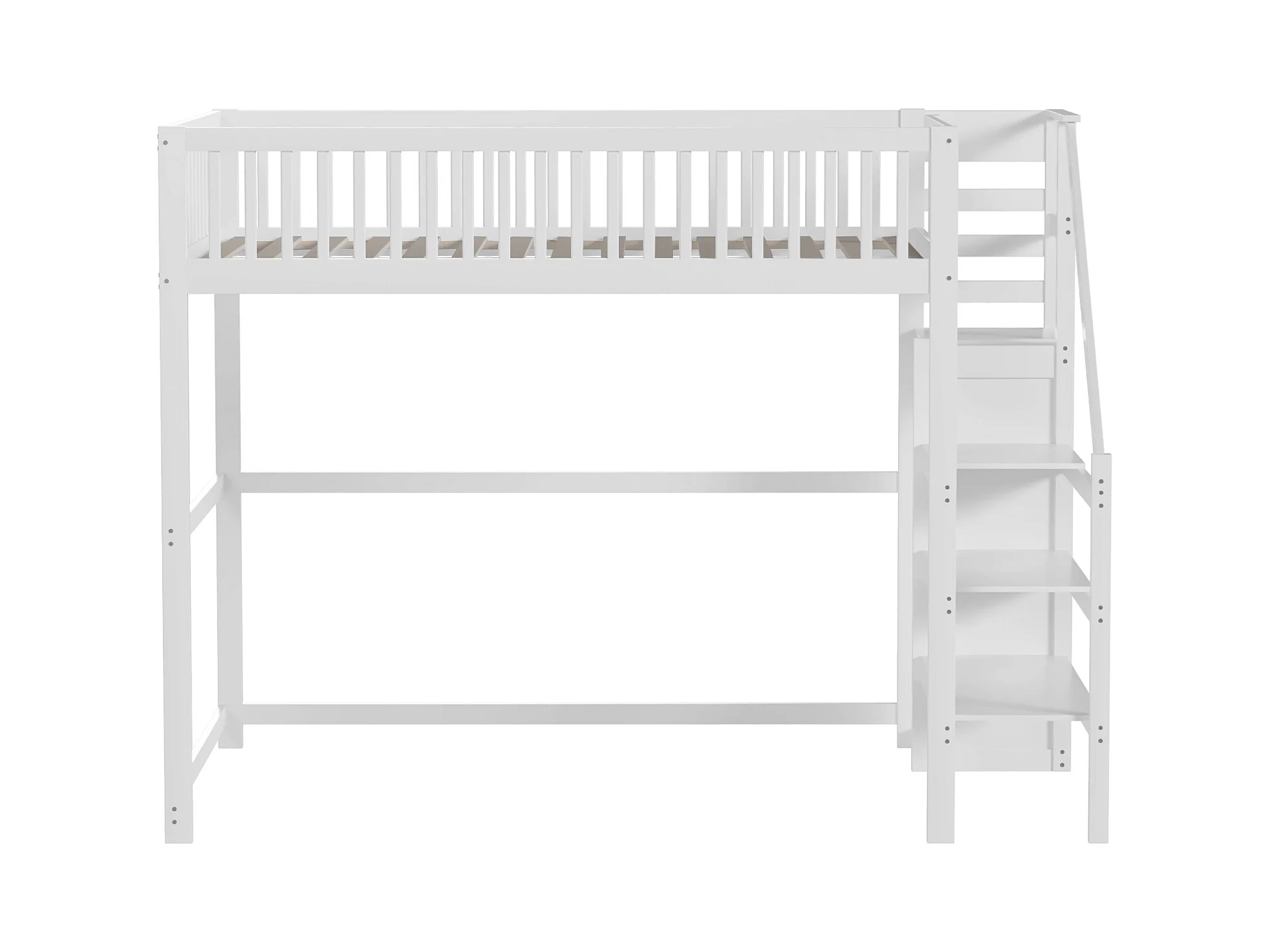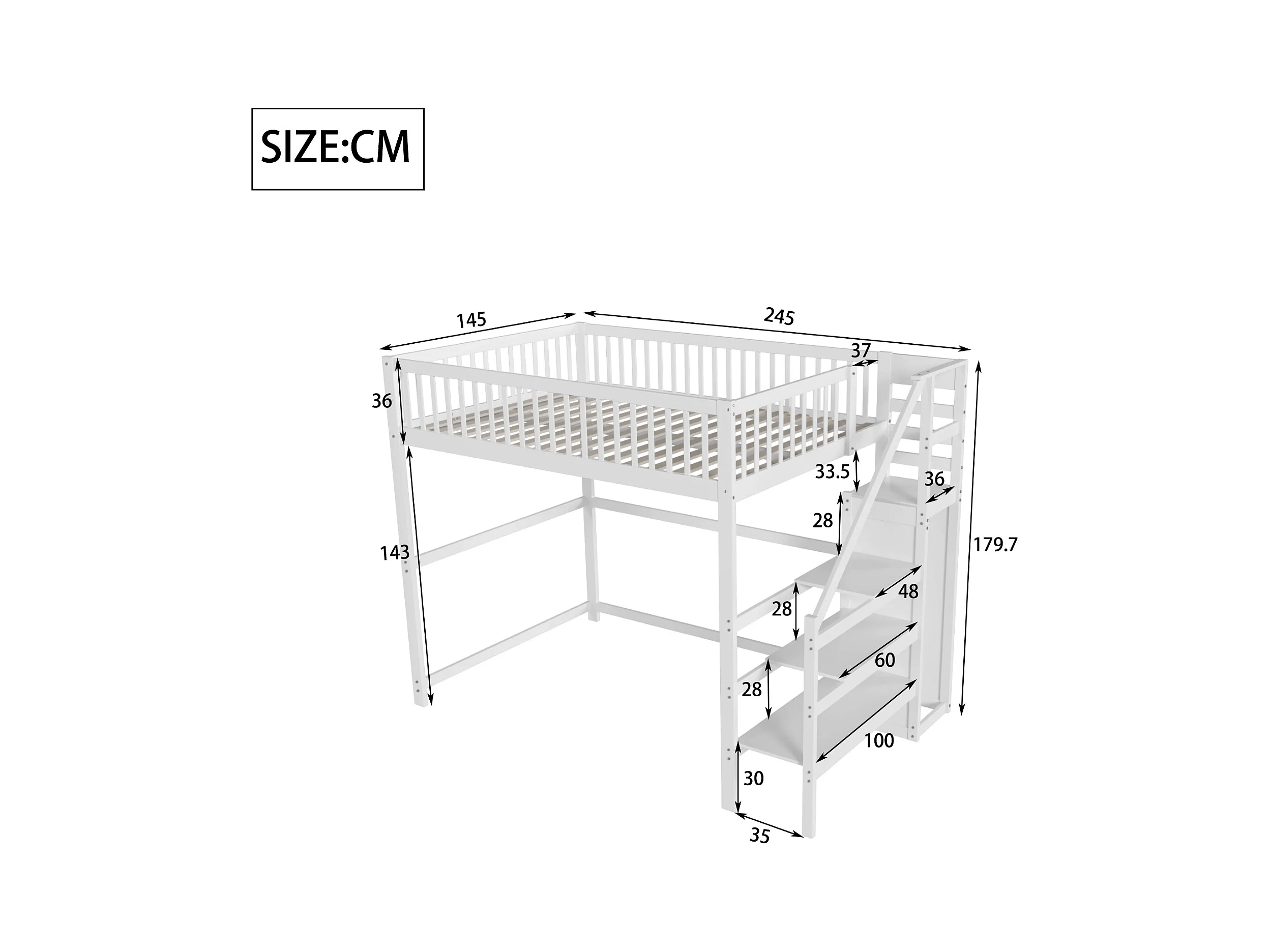 Lit mezzanine avec escalier et rangement, bois massif, blanc, 140x200 cm (245x145x179.7cm)
