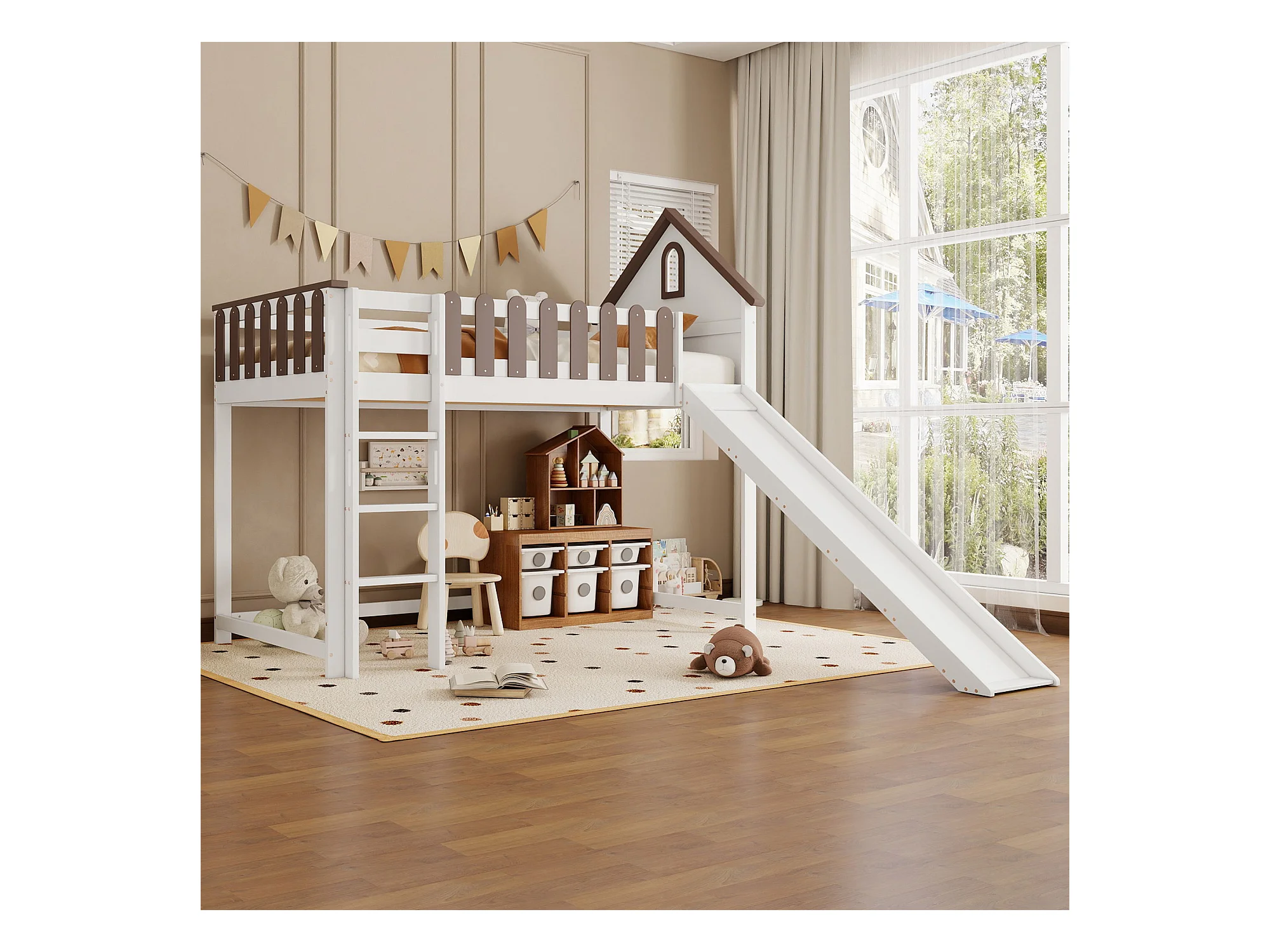 Lit mezzanine, avec toit et fenêtre, avec échelle droite à trois marches, lit d'adolescent, lit d'enfant avec toboggan, pin+MDF, blanc+noyer, 90x200cm