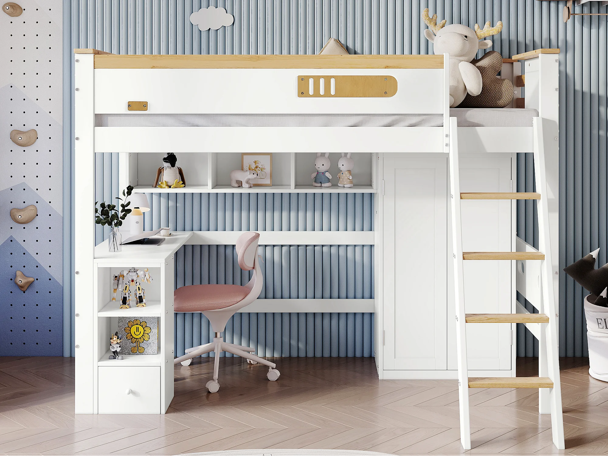 Lit mezzanine en bois - 90x200 cm - avec étagères、bureau et armoire - Blanc