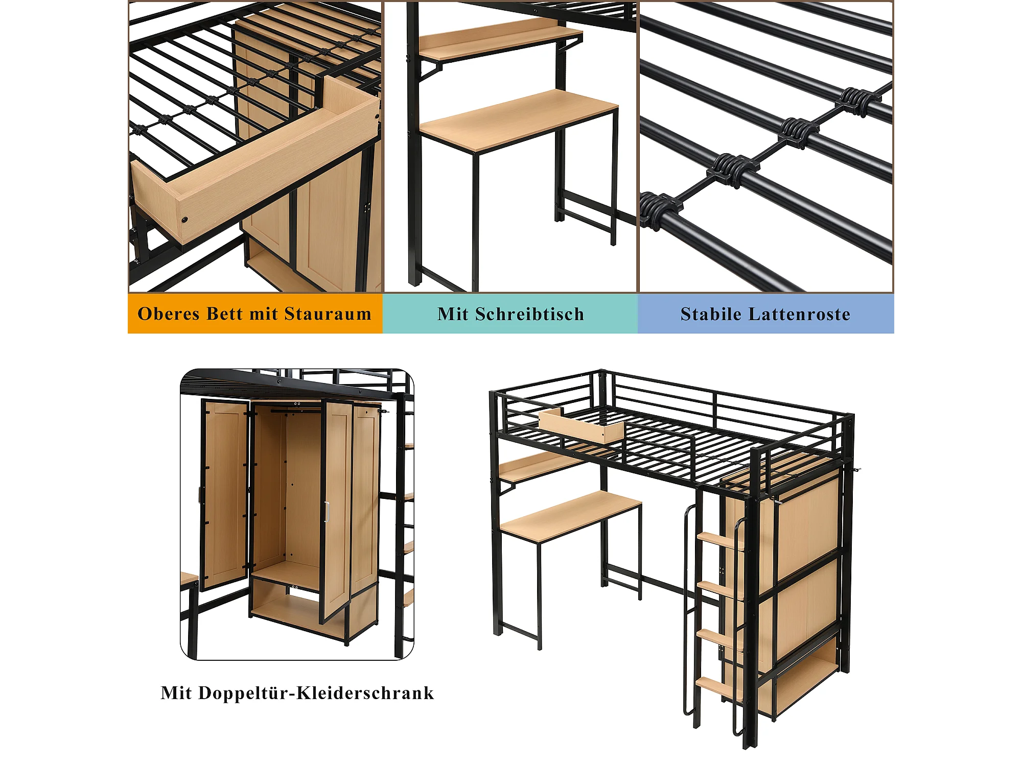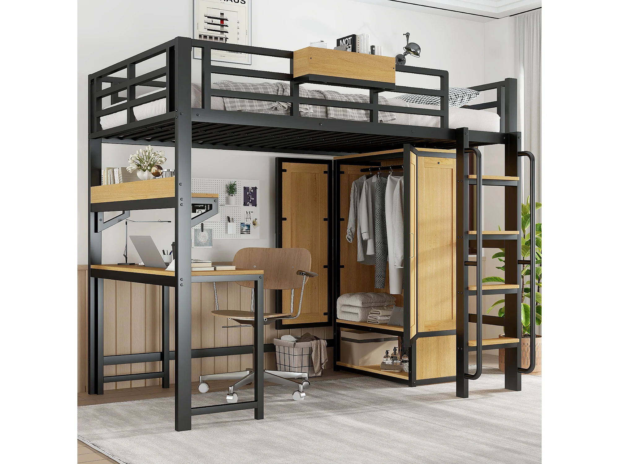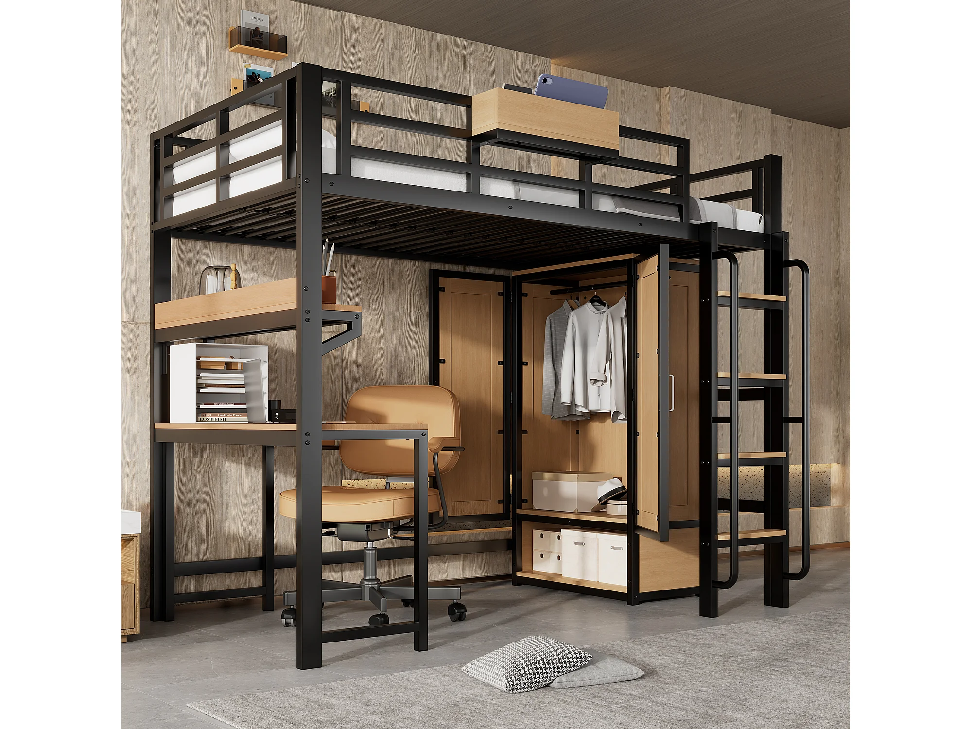 Lit mezzanine en fer - 90 x 200 cm - avec armoire + escalier + bureau et étagère de rangement - fer + MDF - noir + naturel