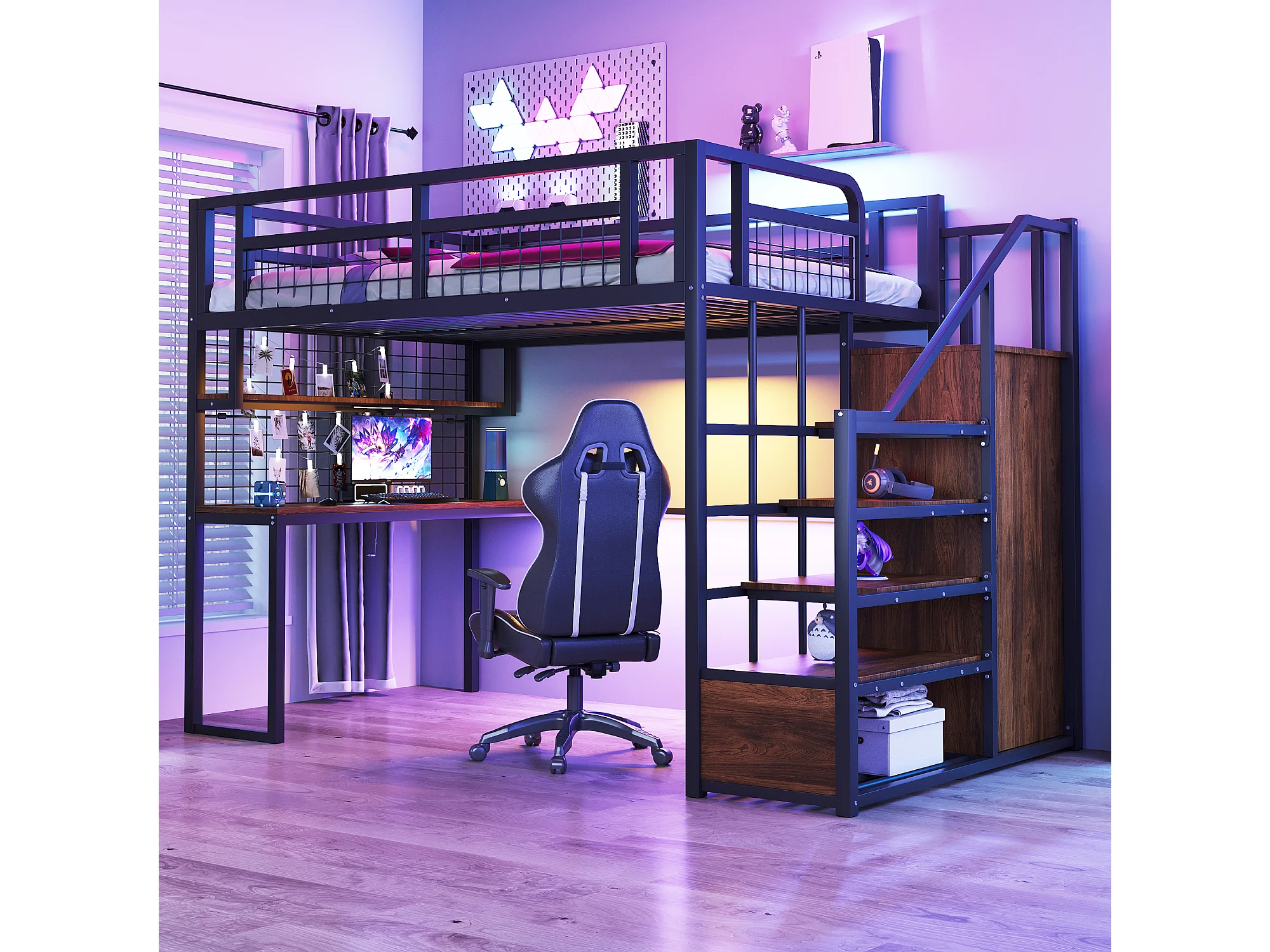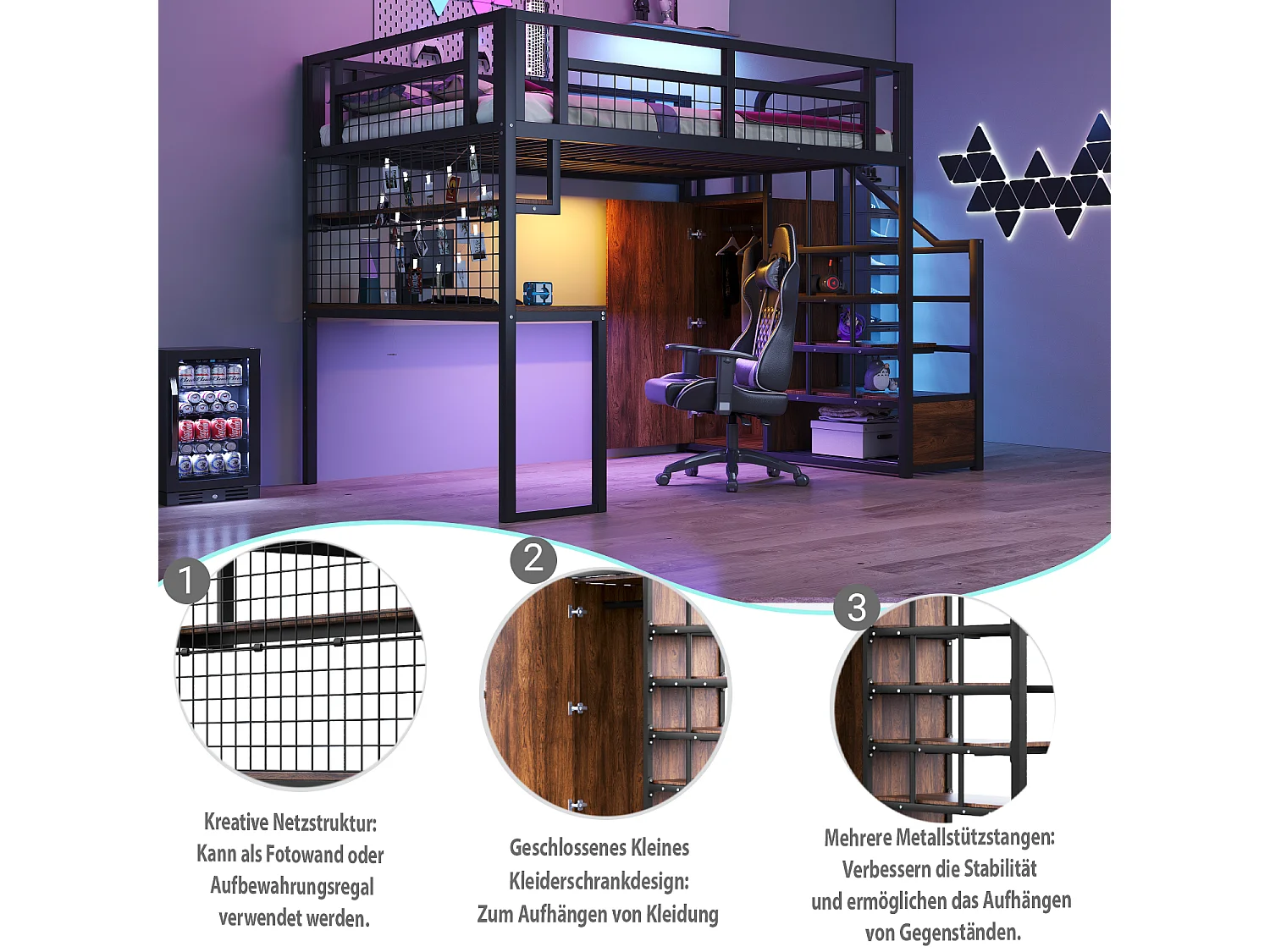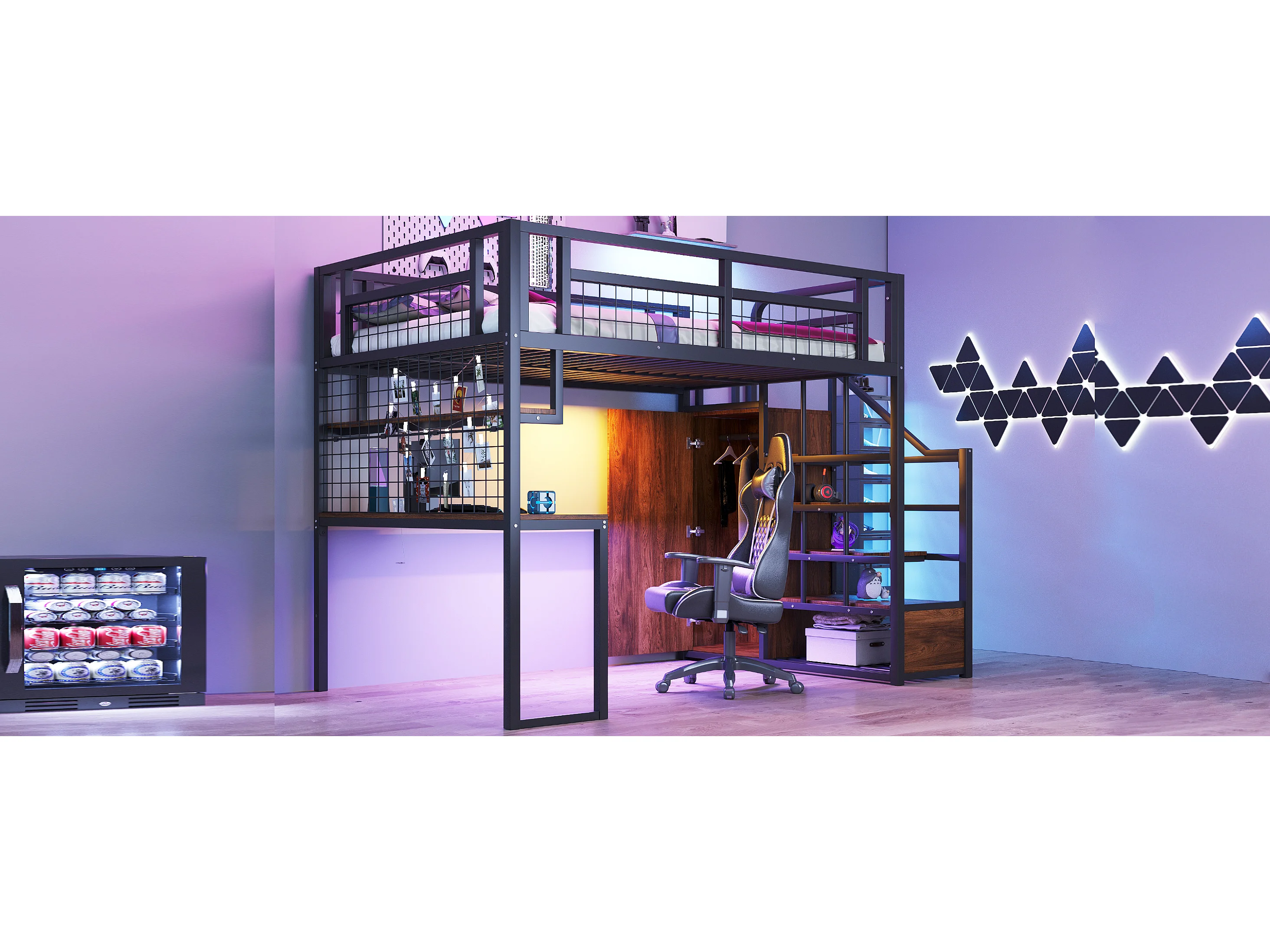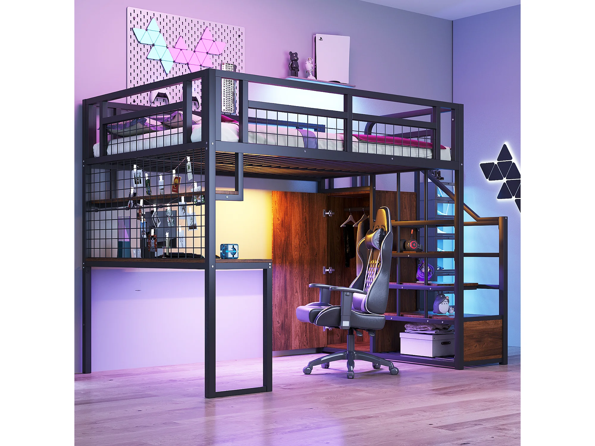 Lit mezzanine en métal - 140 x 200 cm - avec échelle de rangement + penderie + table - noir