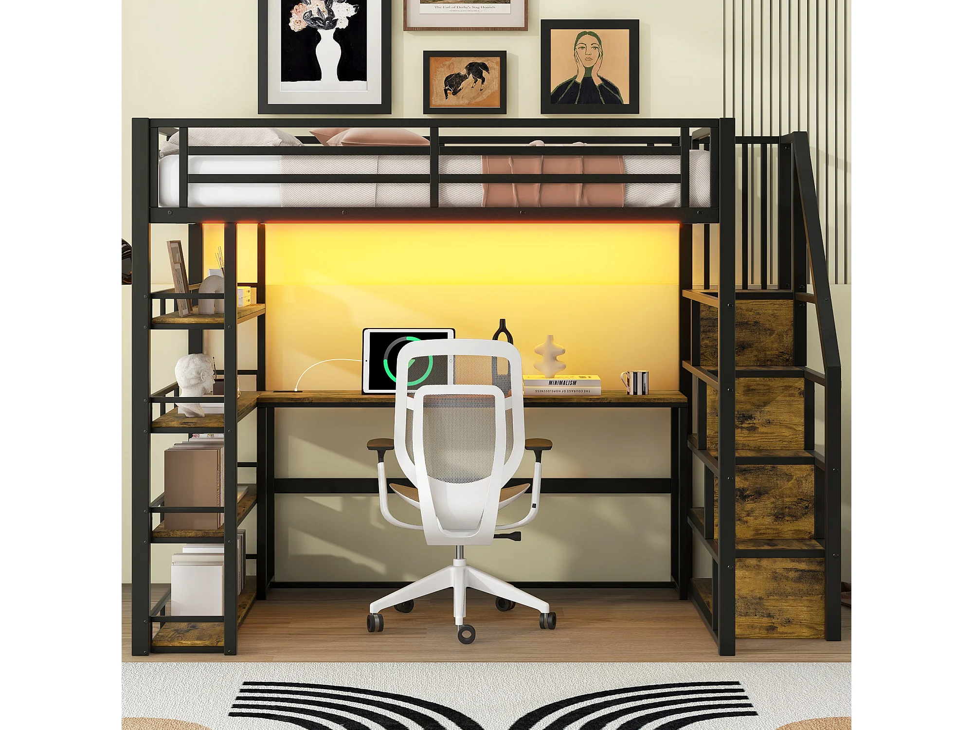 Lit mezzanine en métal 140x200cm - avec éclairage LED - avec escalier - avec bureau - chargement USB - noir