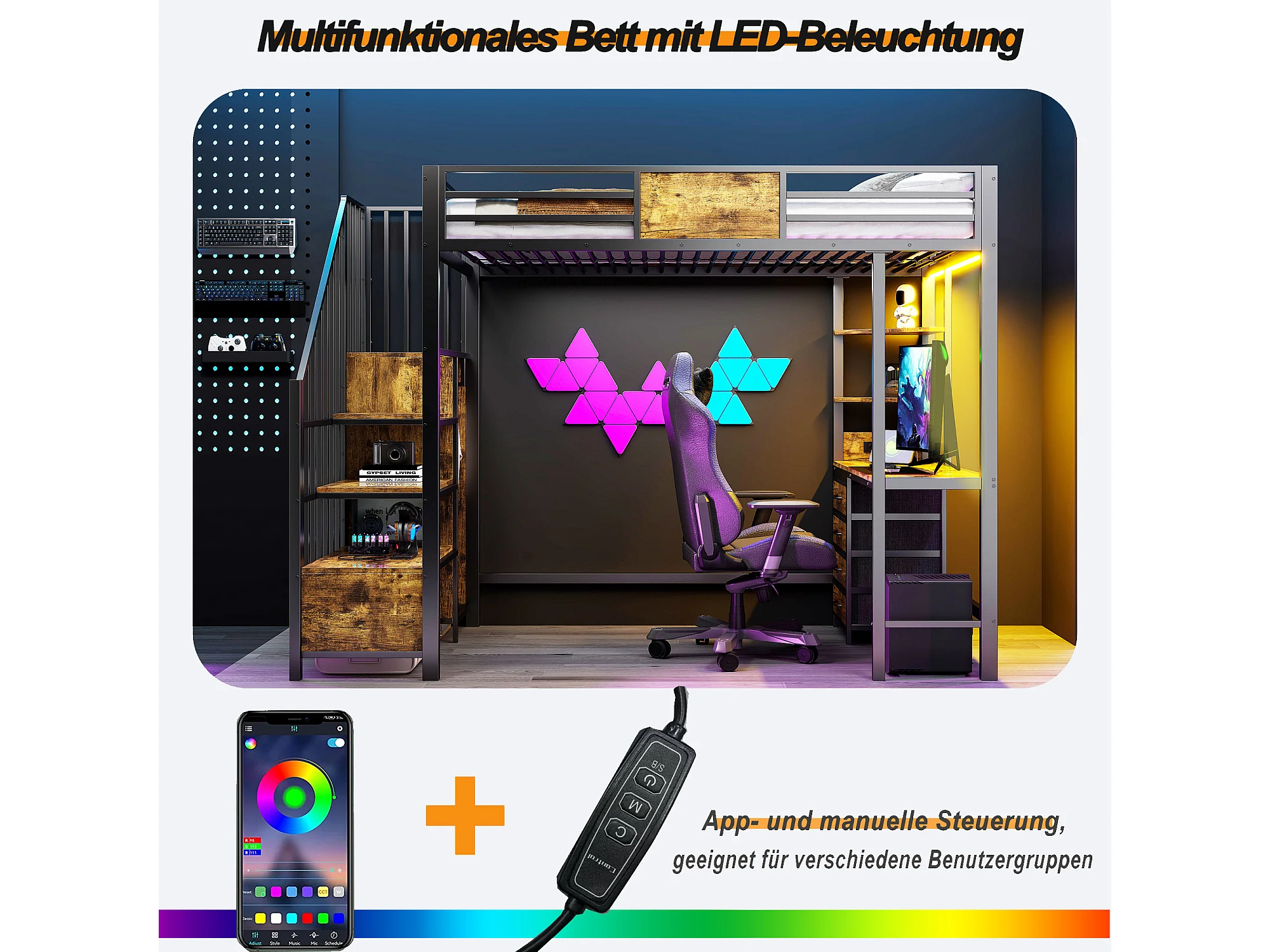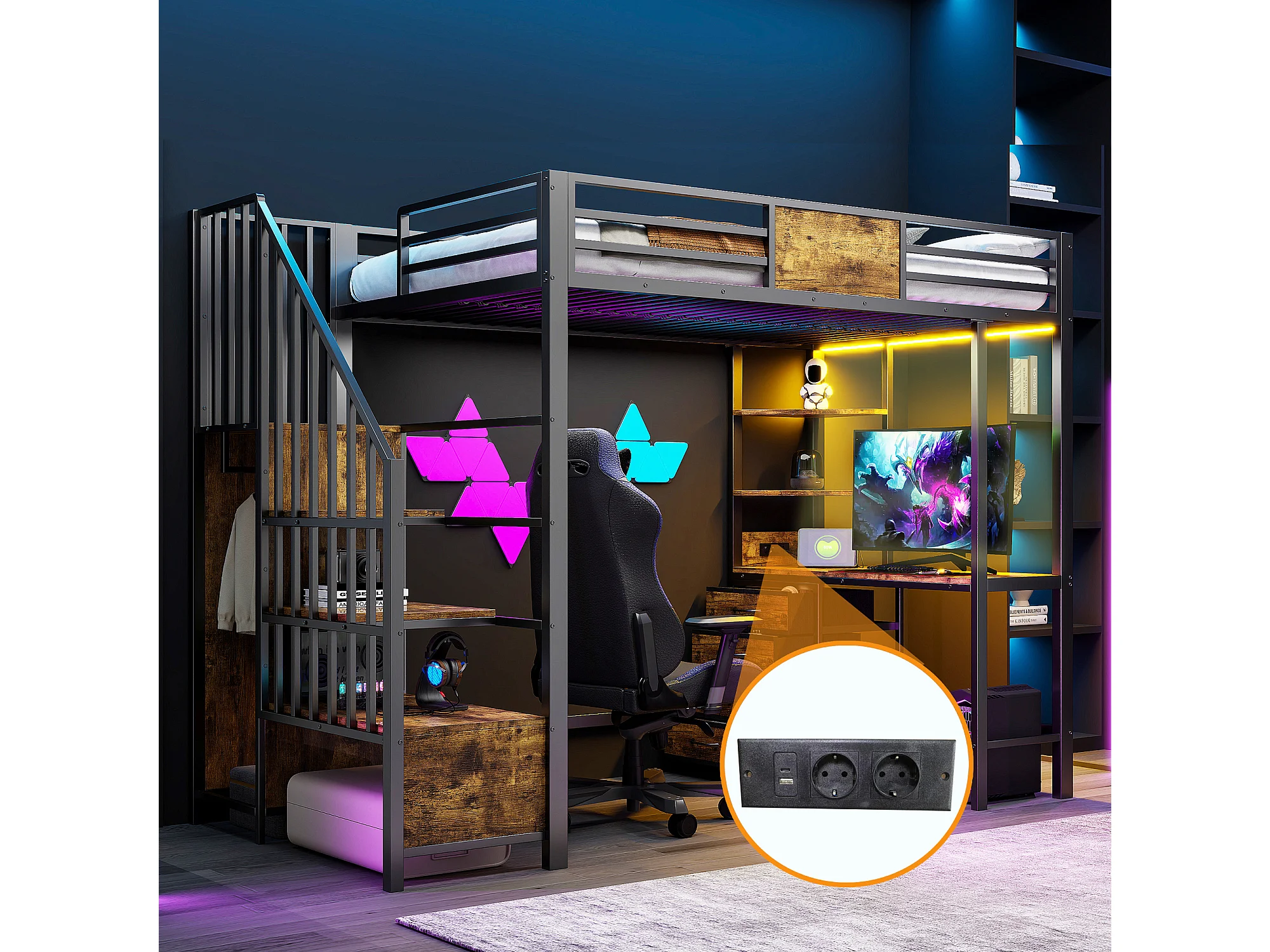 Lit mezzanine 90 x 200 cm, structure en fer, avec tringle à linge, étagères, tiroirs, prises USB + Type-C, bande LED, noir