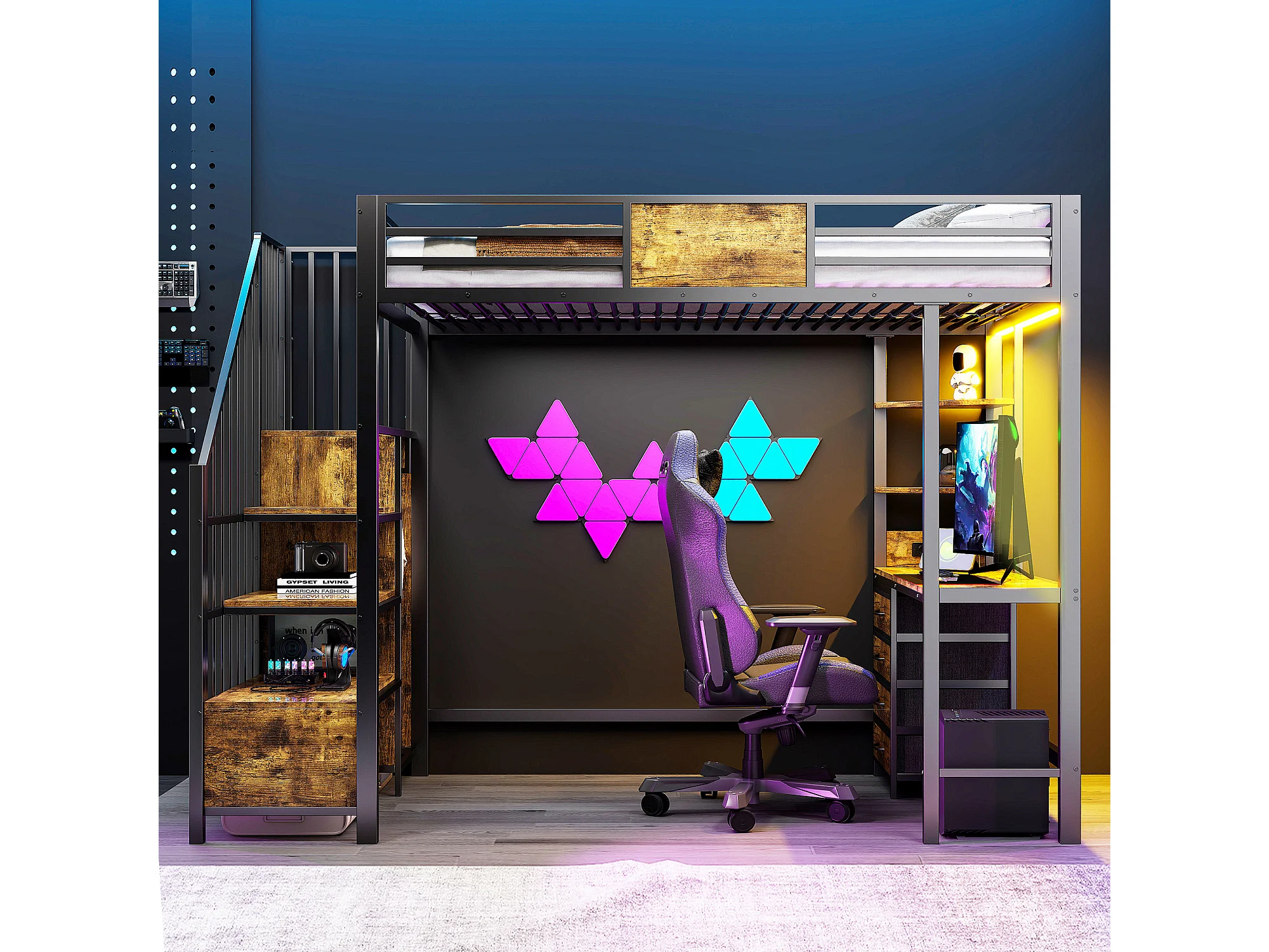 Lit mezzanine en métal - 90 x 200 cm - avec bureau + tiroirs + penderie + Leds + escalier de rangement - métal - noir