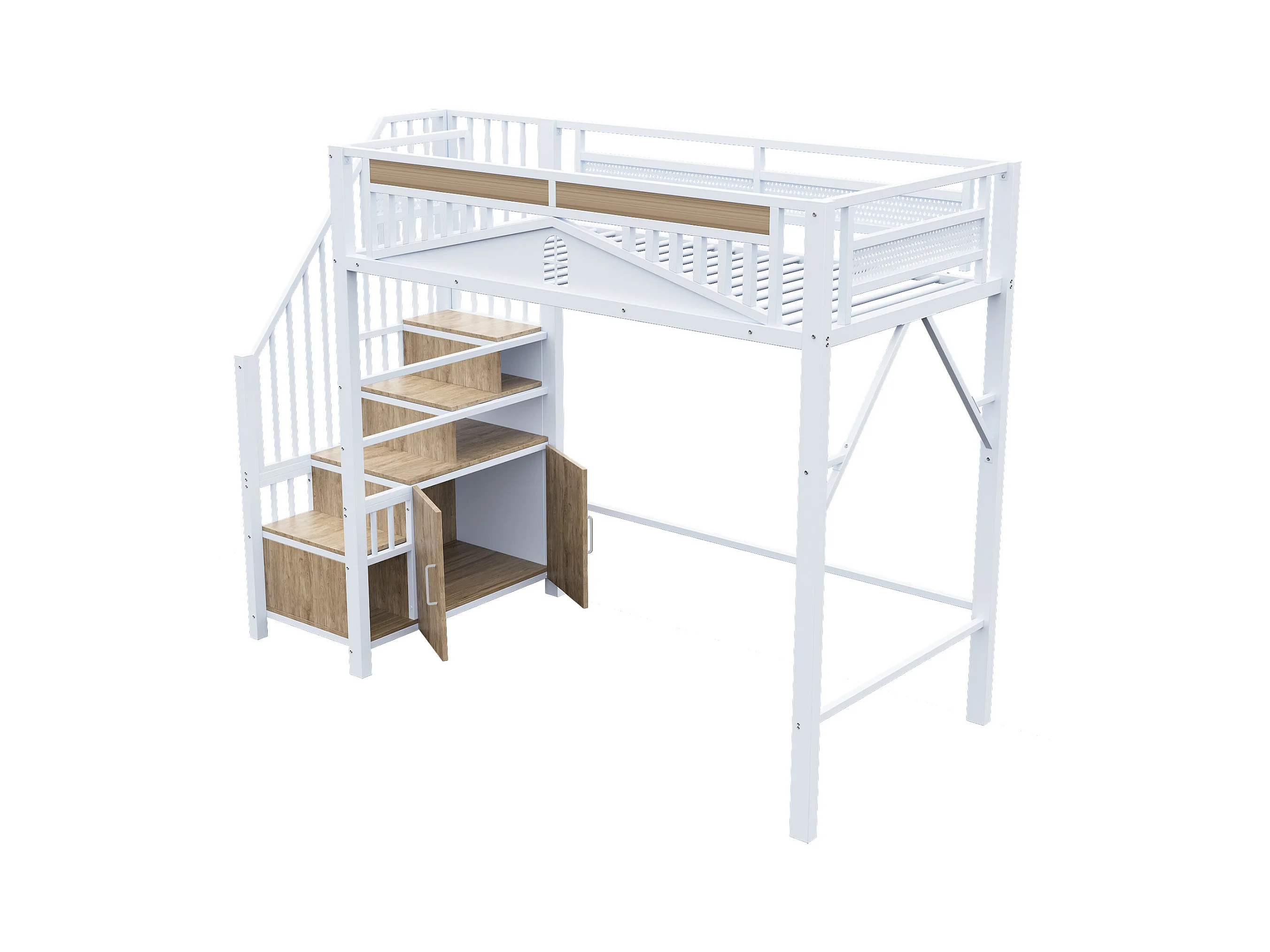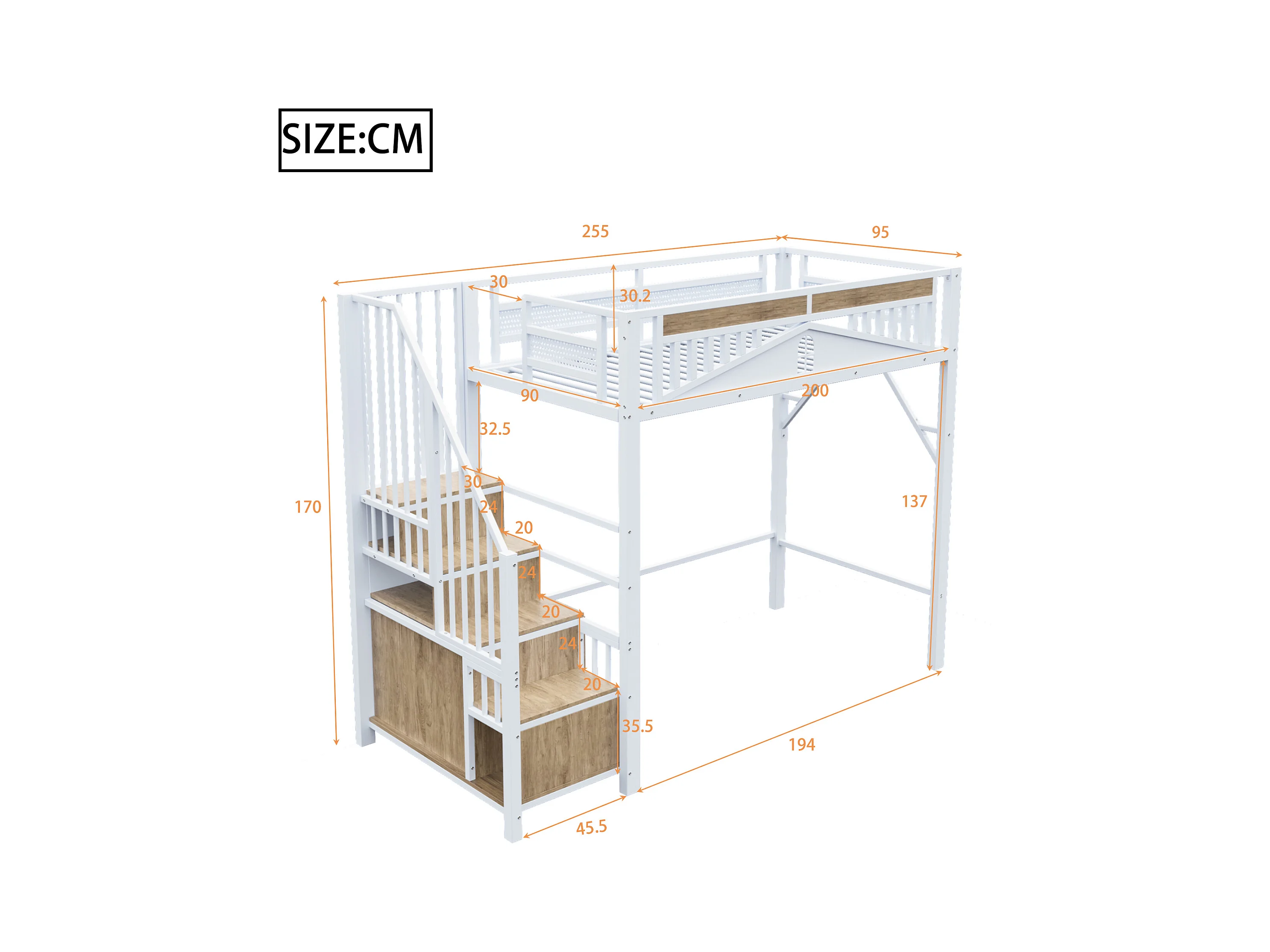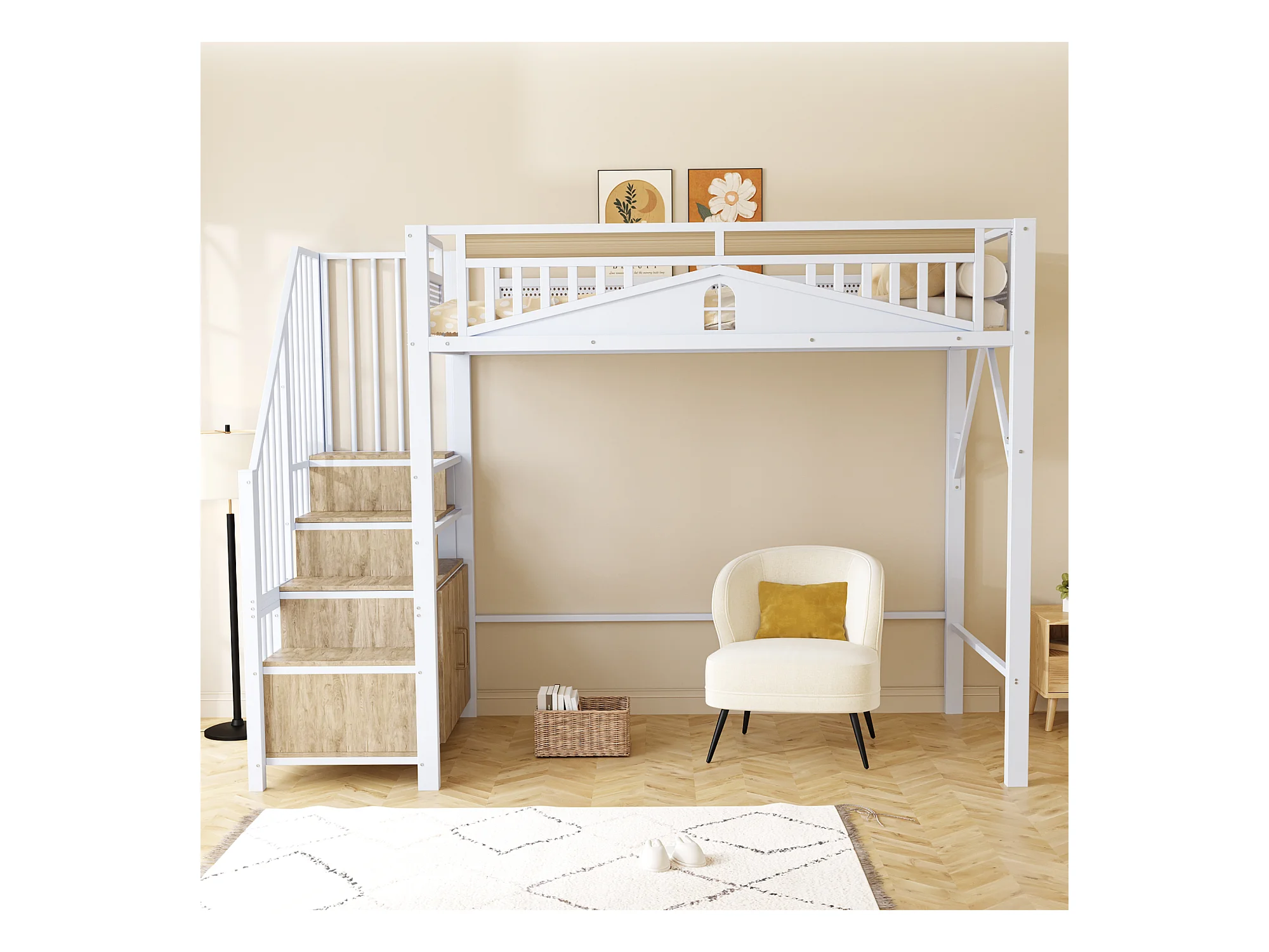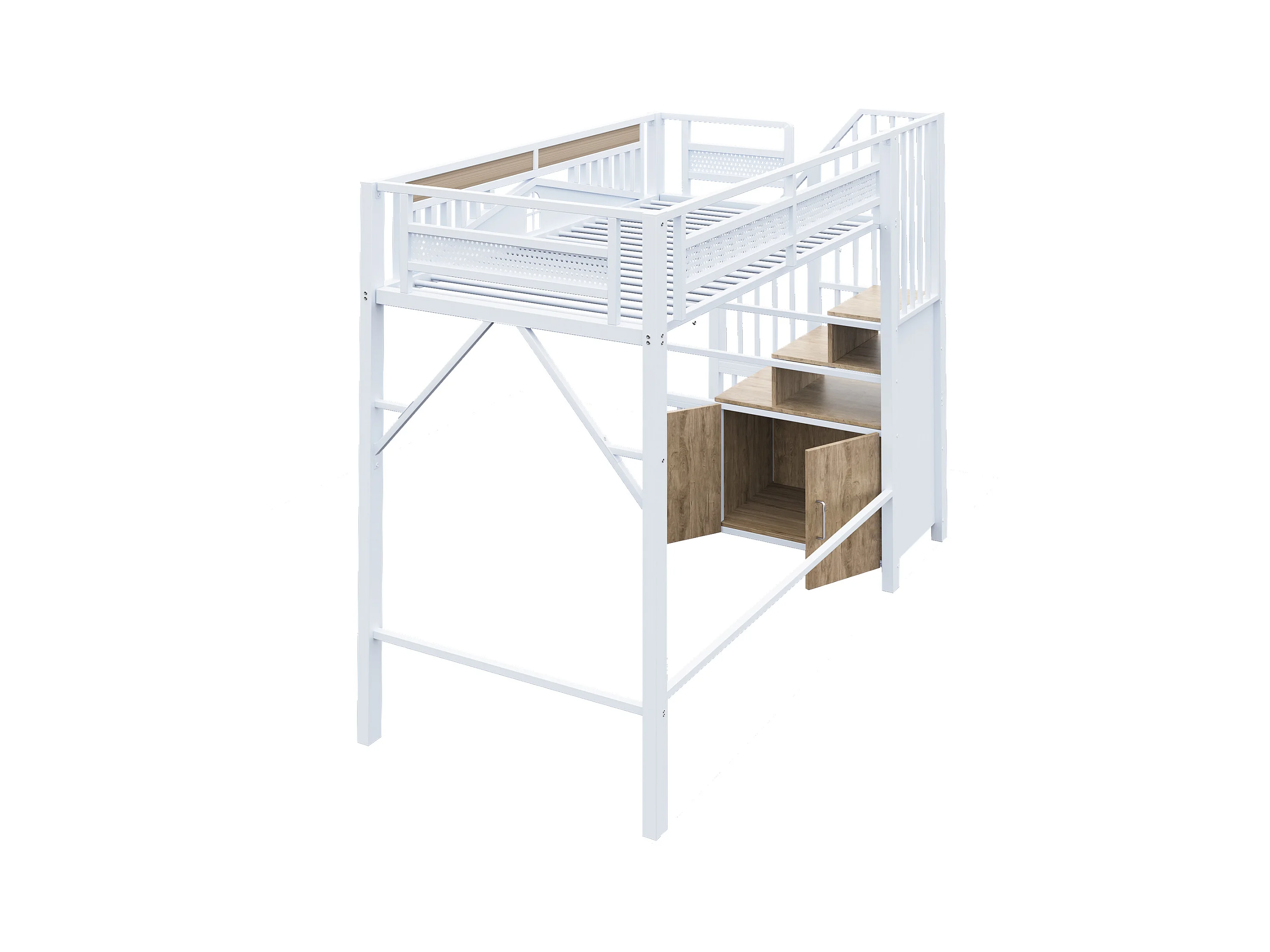 Lit mezzanine en métal 90x200cm - avec échelle de rangement - Blanc (matelas non inclus)