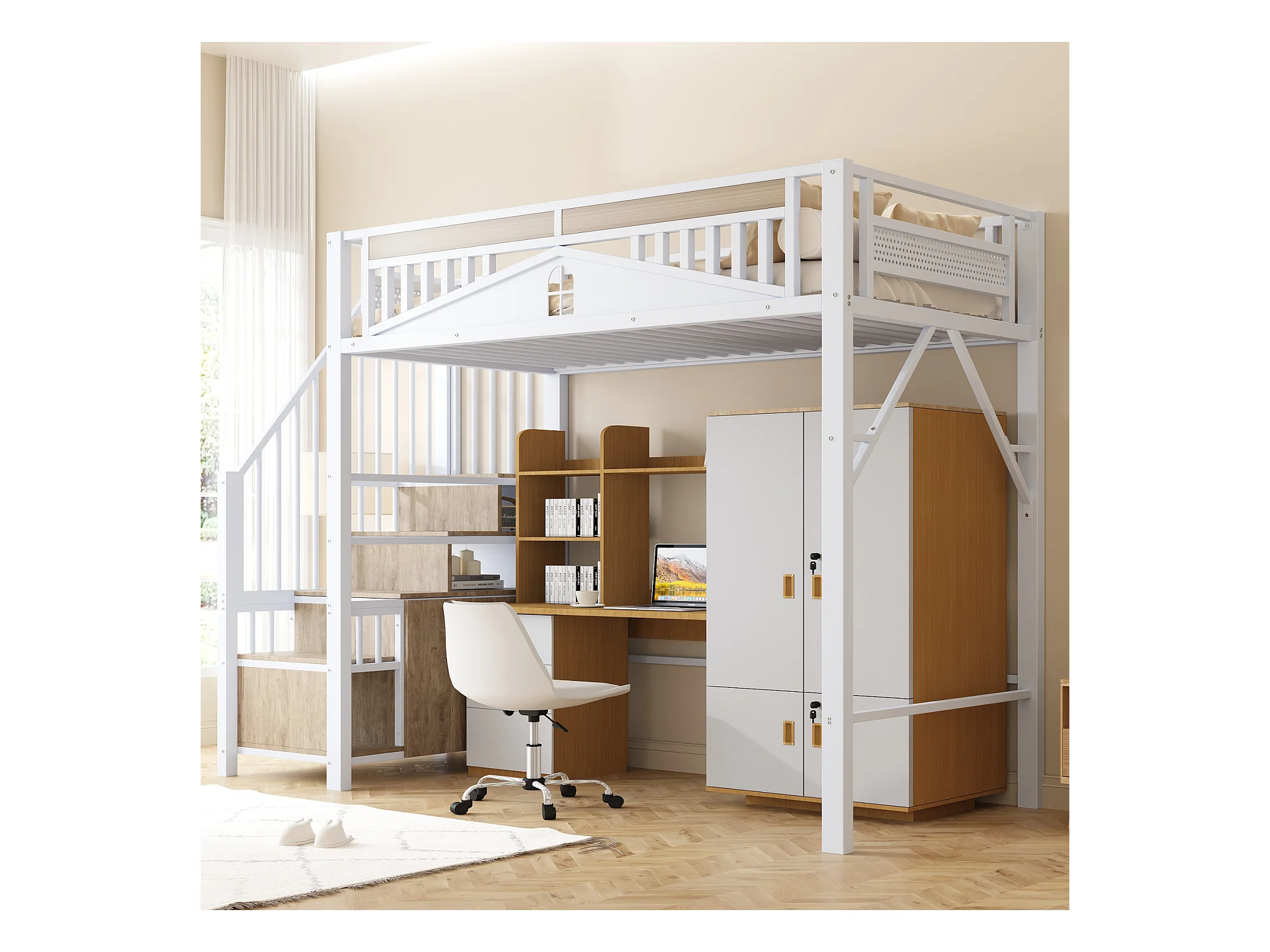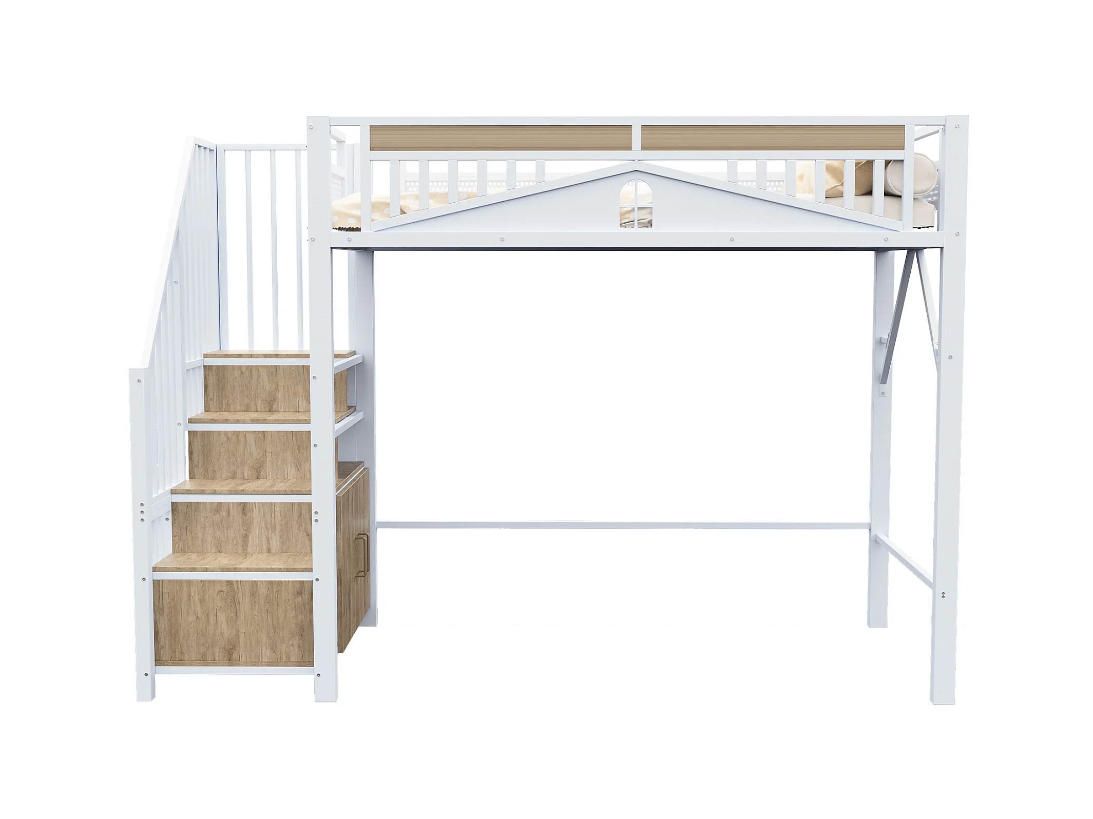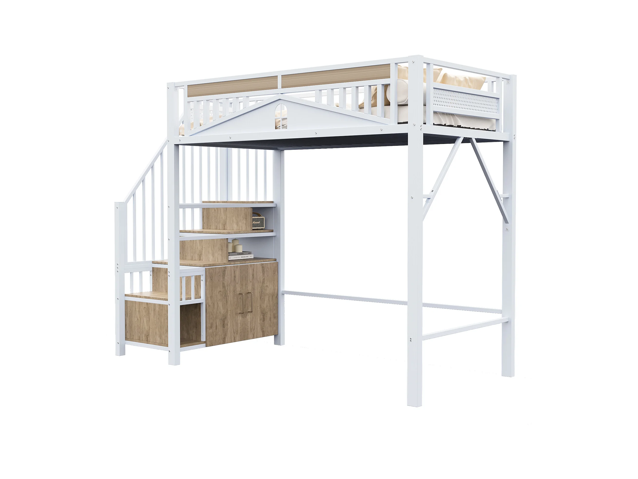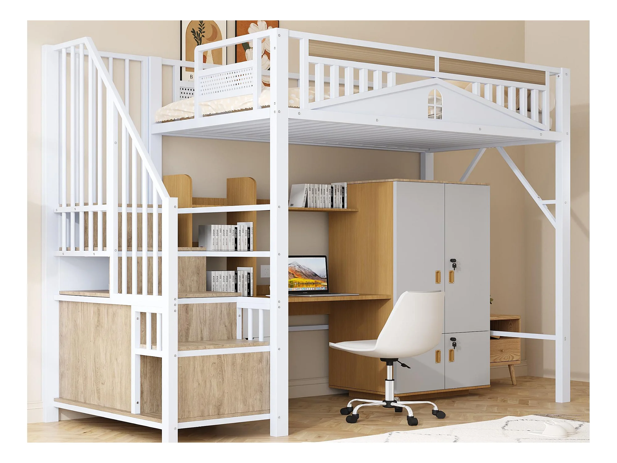 Lit mezzanine en métal 90x200cm - avec échelle de rangement - Blanc (matelas non inclus)