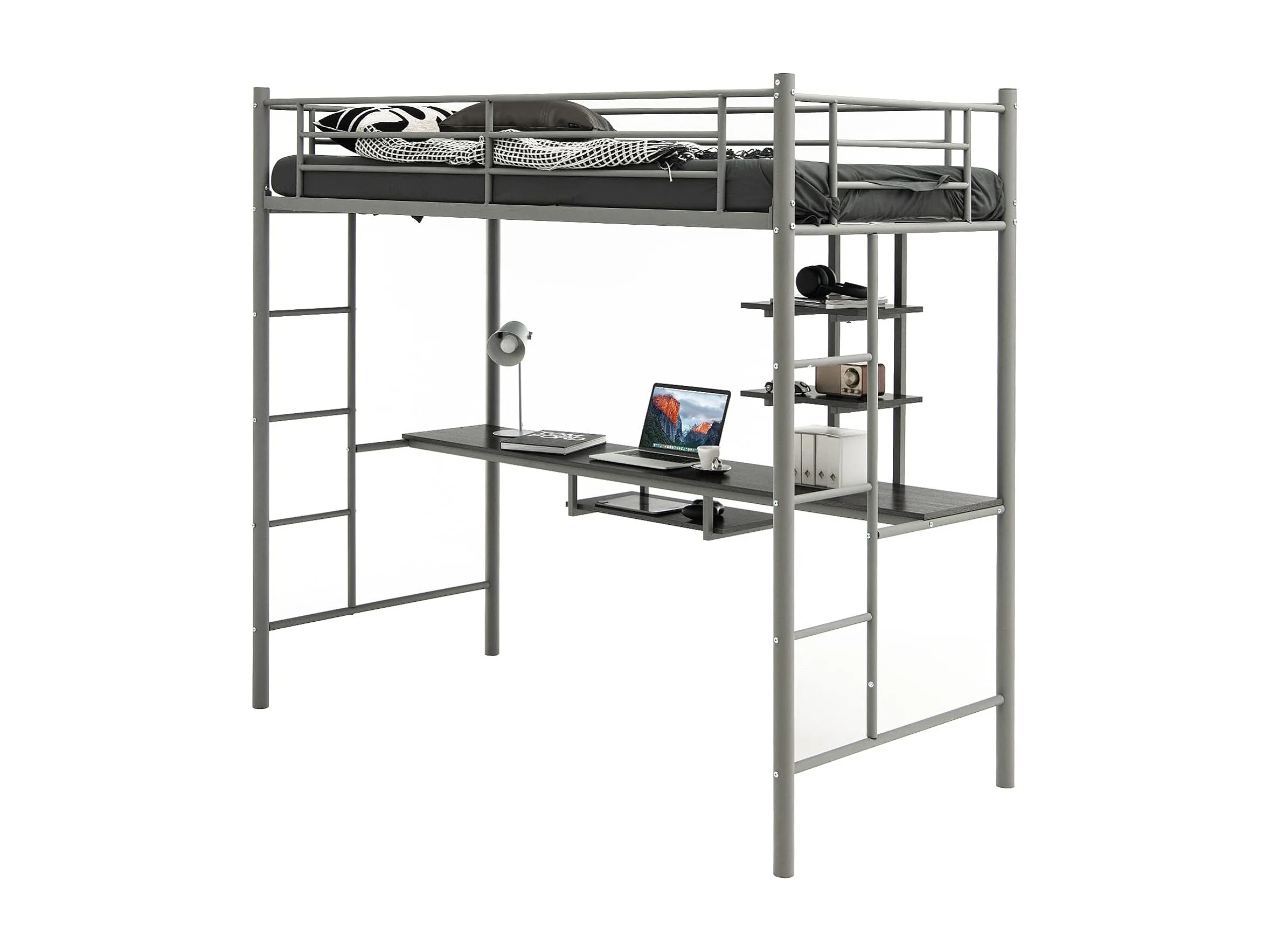 Lit Mezzanine en Métal avec Bureau, 90 x 190 CM, avec 2 Etagères, 2 Échelles, Garde-Corps sur Toute la Longueur, Argent