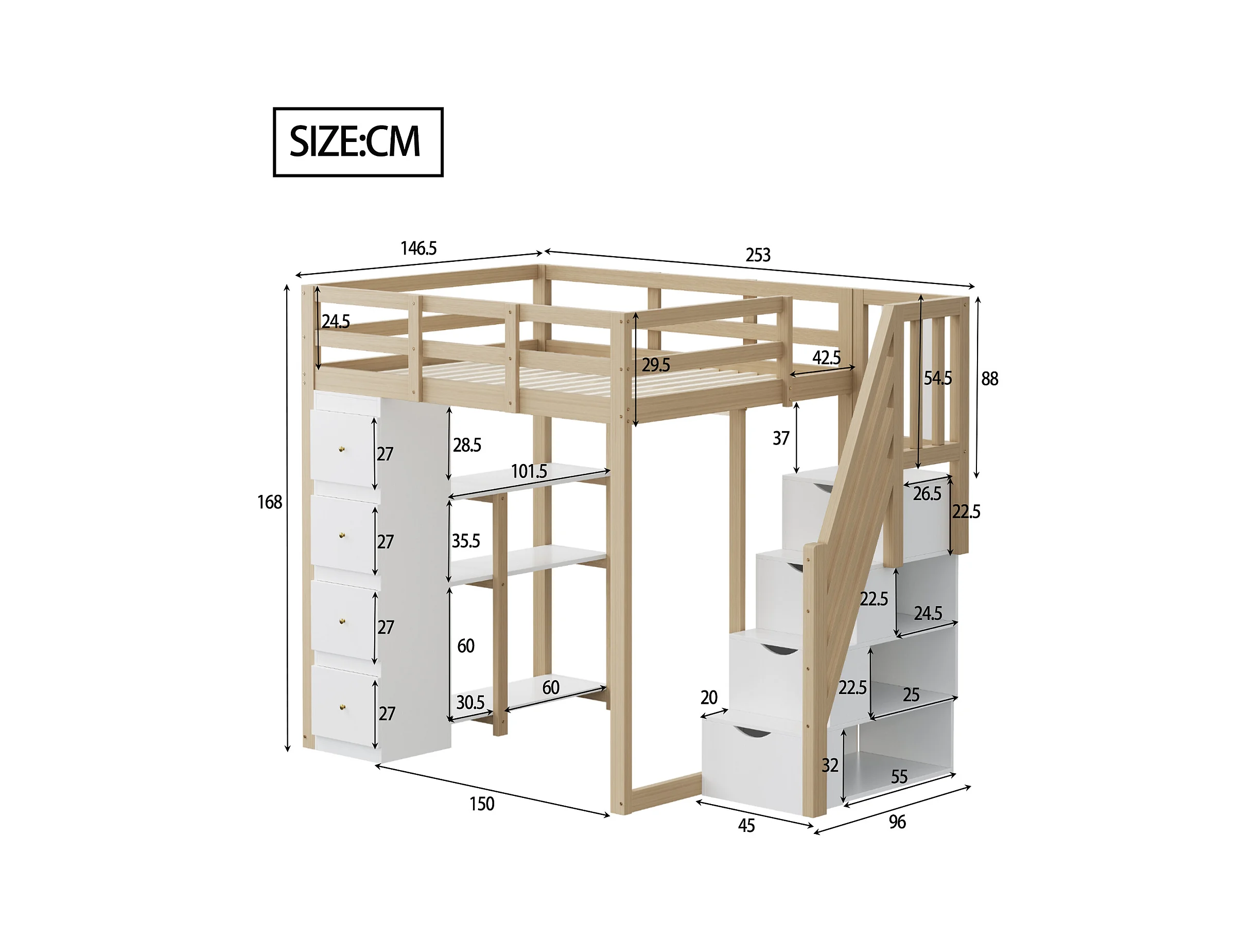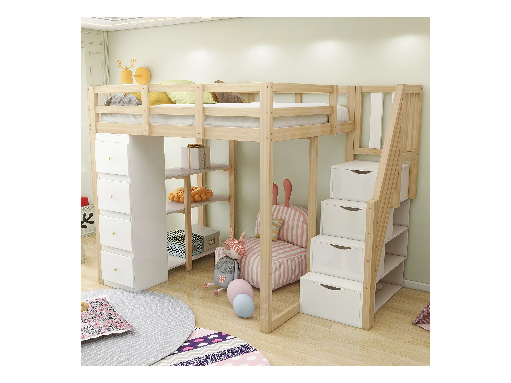 Lit mezzanine 140x200cm en bois massif - avec 4 tiroirs et escalier de rangement - Naturel (matelas non inclus)