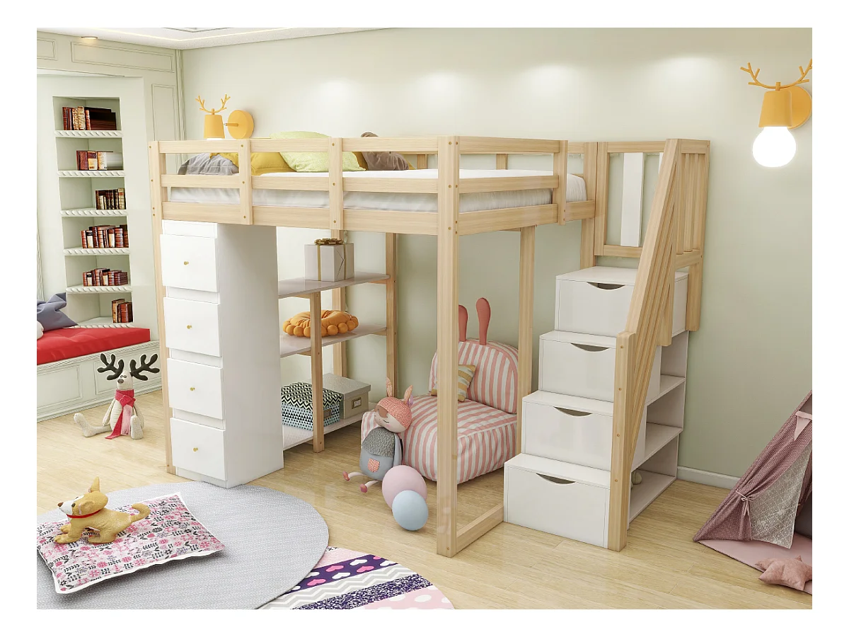 Lit mezzanine pour enfant - 140 x 200 cm - escalier avec meuble de rangement - bois - naturel