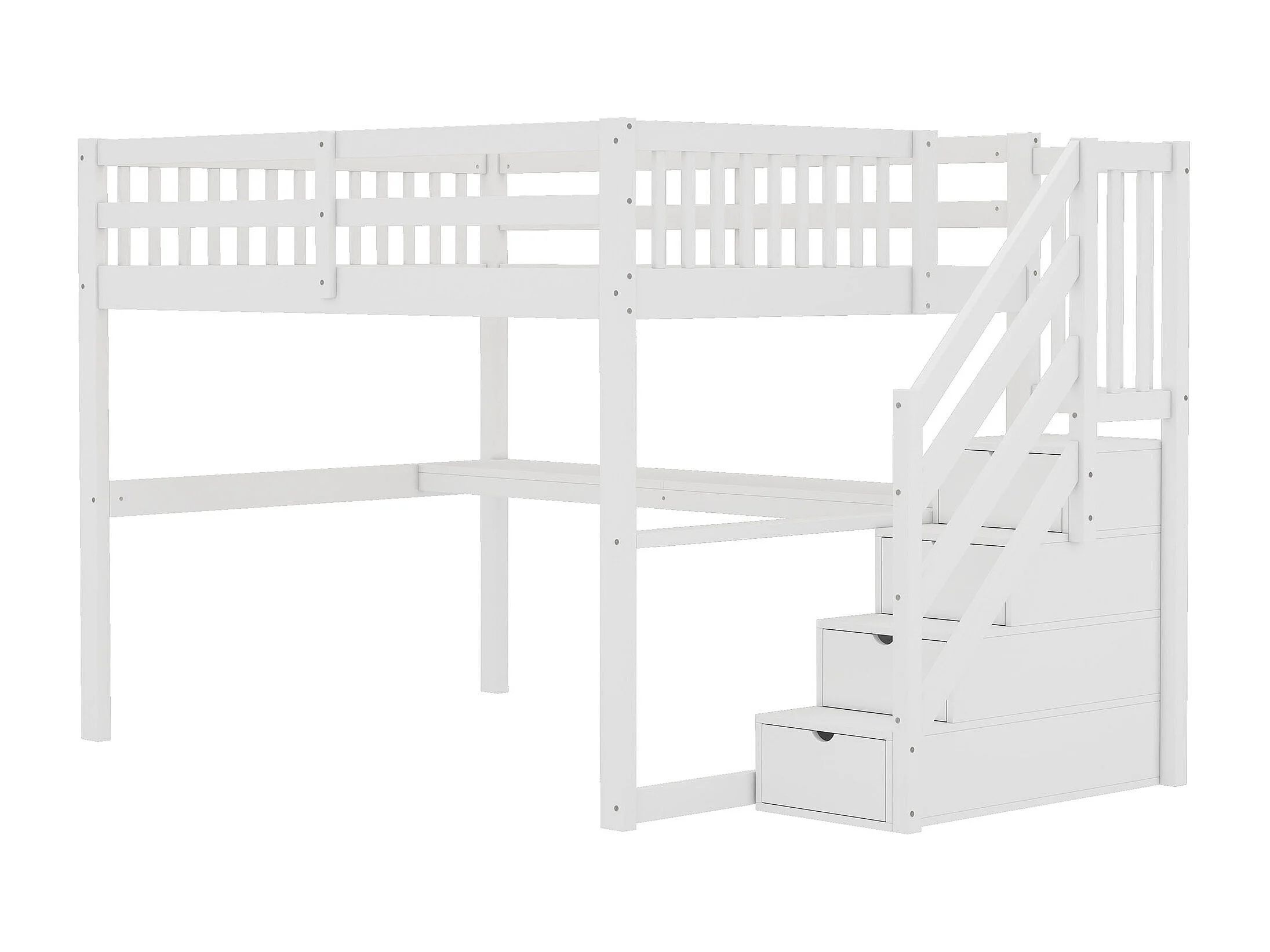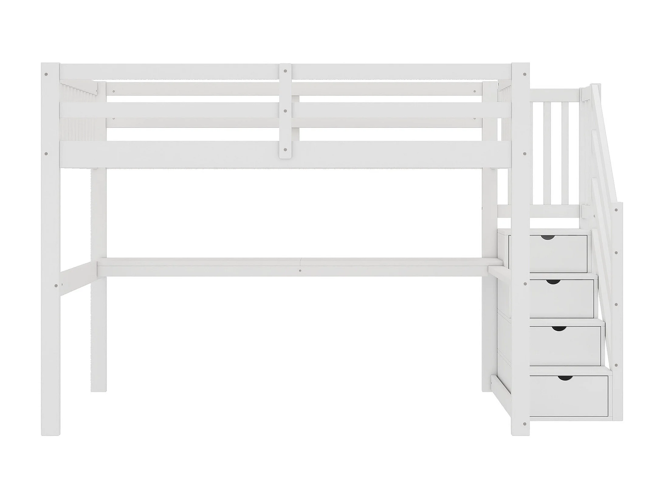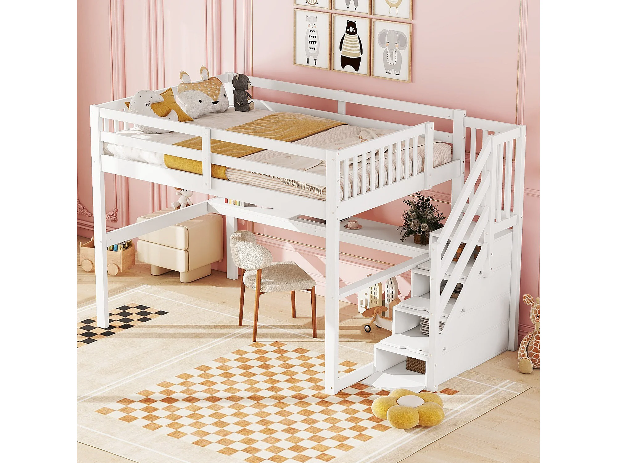 Lit mezzanine enfant - 140 x 200 cm - avec bureau et escalier de rangement - bois - blanc
